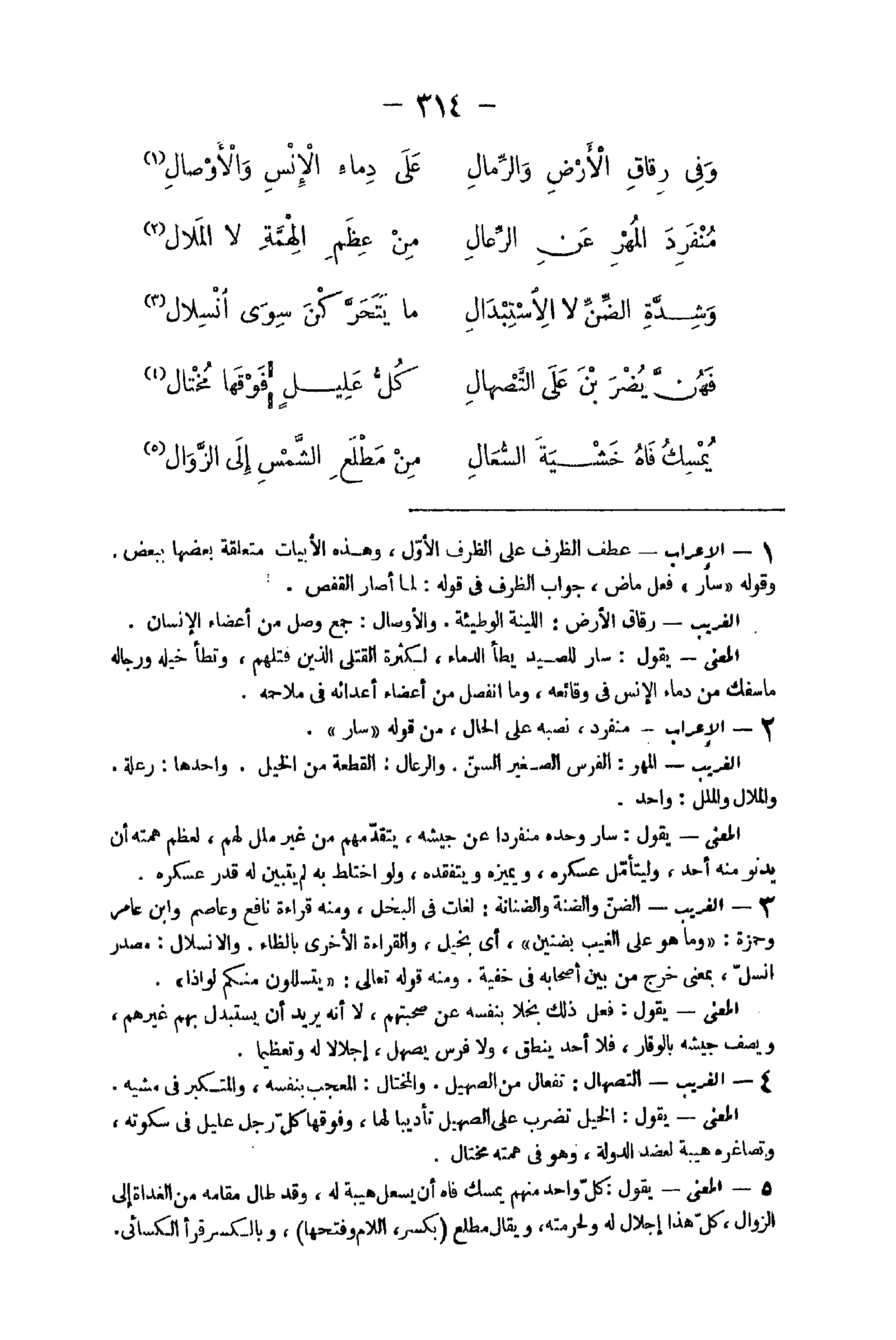 - الْإِعْرَاب عطف الظّرْف على الظّرْف الأول وَهَذِه الأبيات مُتَعَلقَة بَعْضهَا بِبَعْض وَقَوله سَار فعل مَاض جَوَاب الظّرْف فِي قَوْله لما أصار القفص الْغَرِيب رقاق الأَرْض اللينة الوطيئة والأوصال جمع وصل من أَعْضَاء الْإِنْسَان الْمَعْنى يَقُول سَار للصَّيْد يطَأ الدِّمَاء لِكَثْرَة الْقَتْلَى الَّذين قَتلهمْ وَتَطَأ خيله وَرِجَاله مَا سفك من دِمَاء الْإِنْس فِي وقائعه وَمَا انْفَصل من أَعْضَاء أعدائه فِي ملامحه