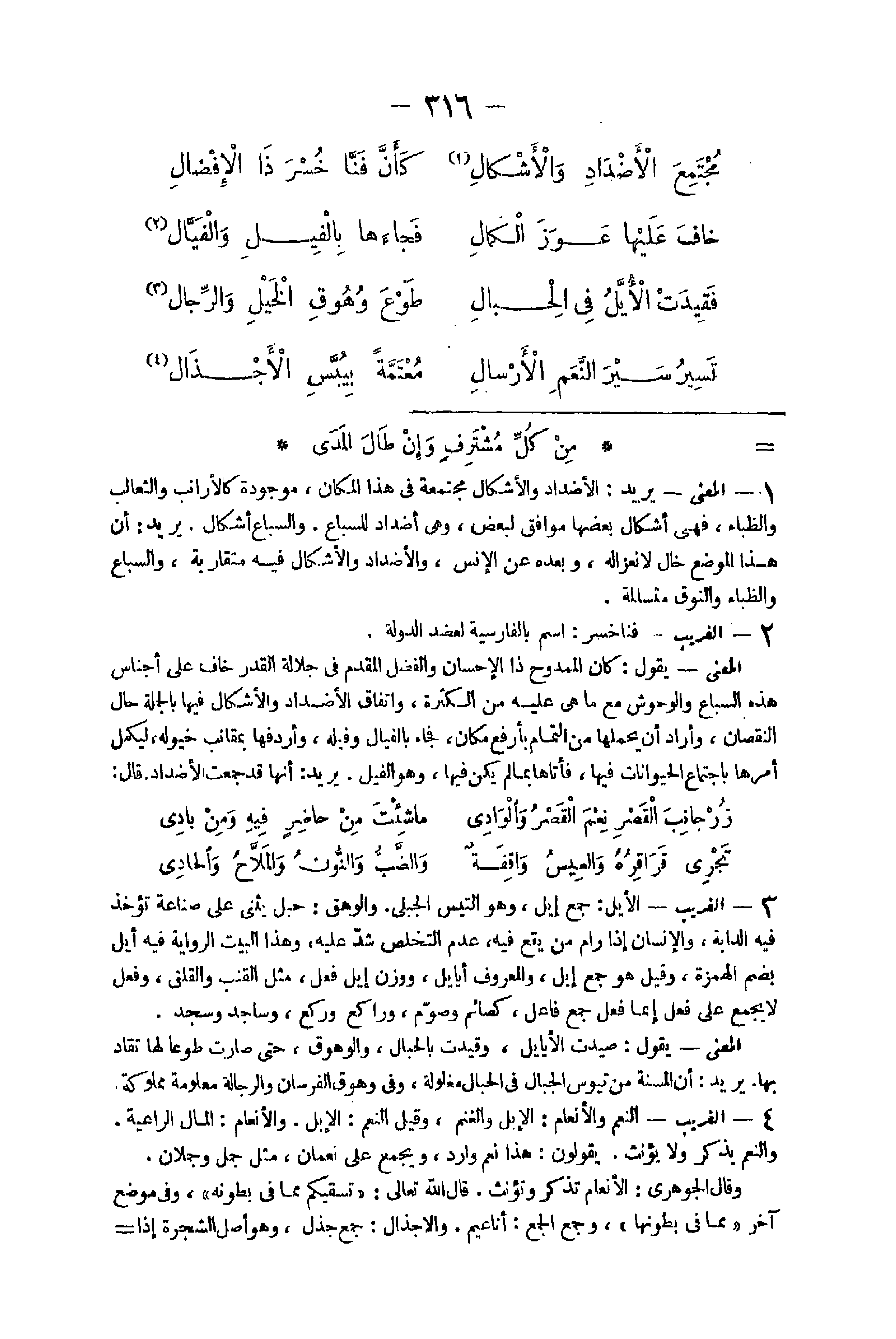 21 - الْمَعْنى يُرِيد الأضداد والأشكال مجتمعة فِي هَذَا الْمَكَان مَوْجُودَة كالأرانب والثعالب والظباء فَهِيَ أشكال بَعْضهَا مُوَافق لبَعض وَهِي أضداد للسباع وَالسِّبَاع أشكال يُرِيد أَن هَذَا الْموضع خَال لانعزاله وَبعده عَن الْإِنْس والأضداد والأشكال فِيهِ مُتَقَارِبَة وَالسِّبَاع والظباء والنوق متسالمة