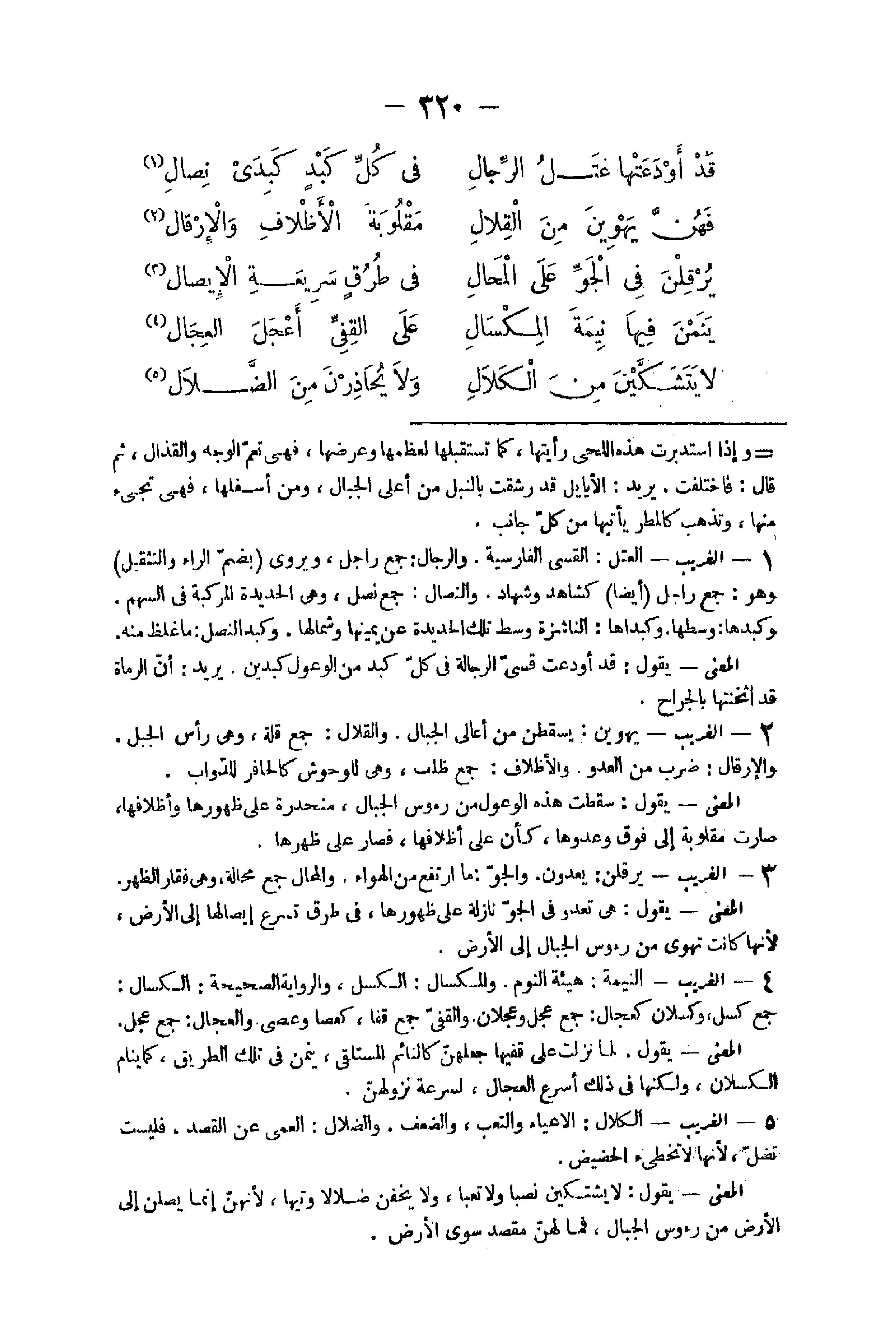 39 - الْغَرِيب العتل القسي الفارسية وَالرِّجَال جمع راجل ويروى بِضَم الرَّاء والتثقيل وَهُوَ جمع راجل أَيْضا كشاهد وشهاد والنصال جمع نصل وَهِي الحديدة المركبة فِي بِالسَّهْمِ وكبدها وَسطهَا وكبداها والناشرة وسط كل تِلْكَ الحديدة عَن يَمِينهَا وشمالها وكبد النصل مَا غلظ مِنْهُ الْمَعْنى يَقُول قد أودعت قسي الرجالة فِي كل كبد من الوعول كبدين يُرِيد ان الرُّمَاة قد اثخنها بالجراح