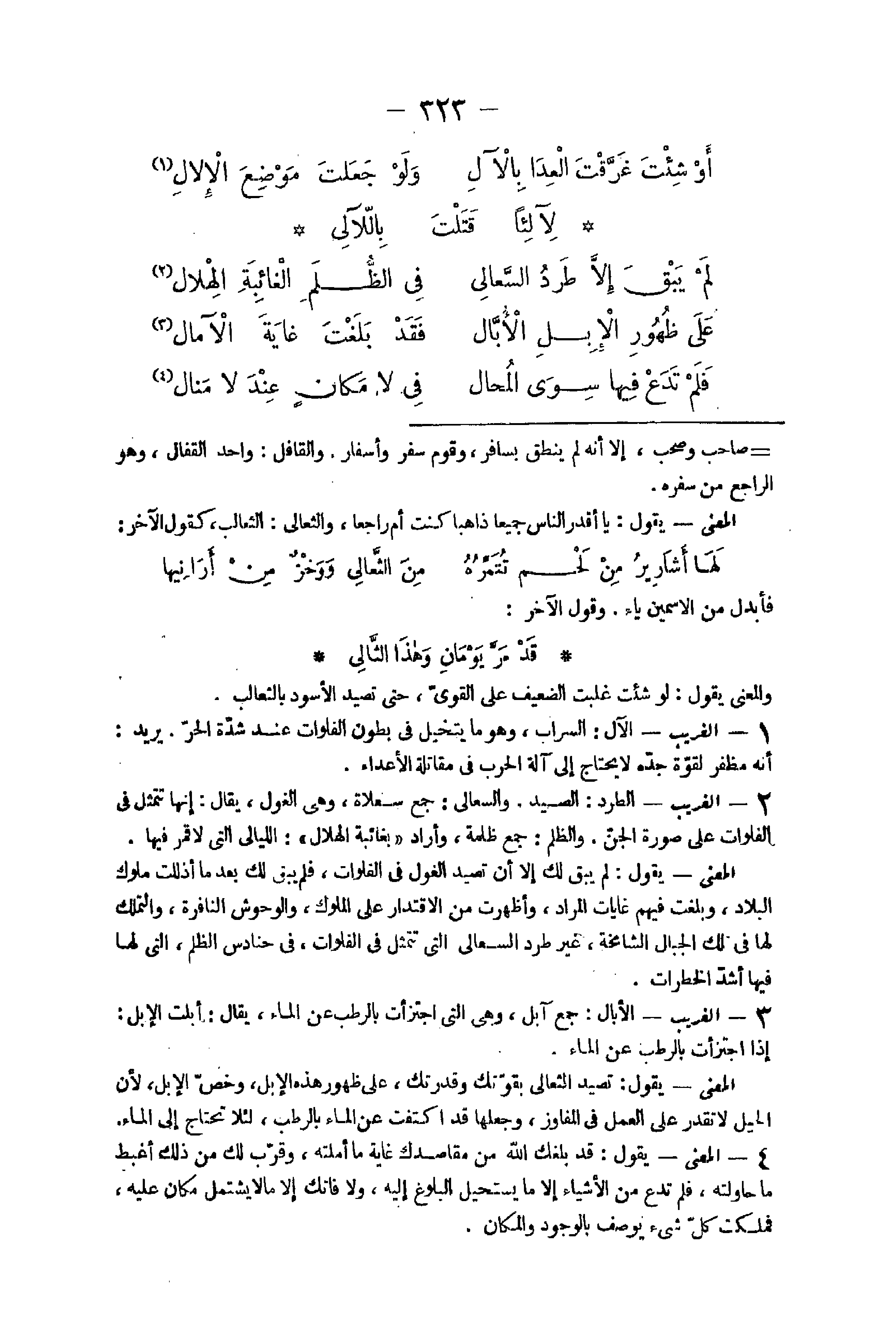 مثل صَاحب وَصَحب إِلَّا أَنه لم ينْطق بسافر وَقوم سفر وأسفار والقافل وَاحِد والقفال وَهُوَ الرَّاجِع من سَفَره الْمَعْنى يَقُول يَا اقدر النَّاس جَمِيعًا ذَاهِبًا كنت ام رَاجعا والثعالي الثعالب كَقَوْل آخر