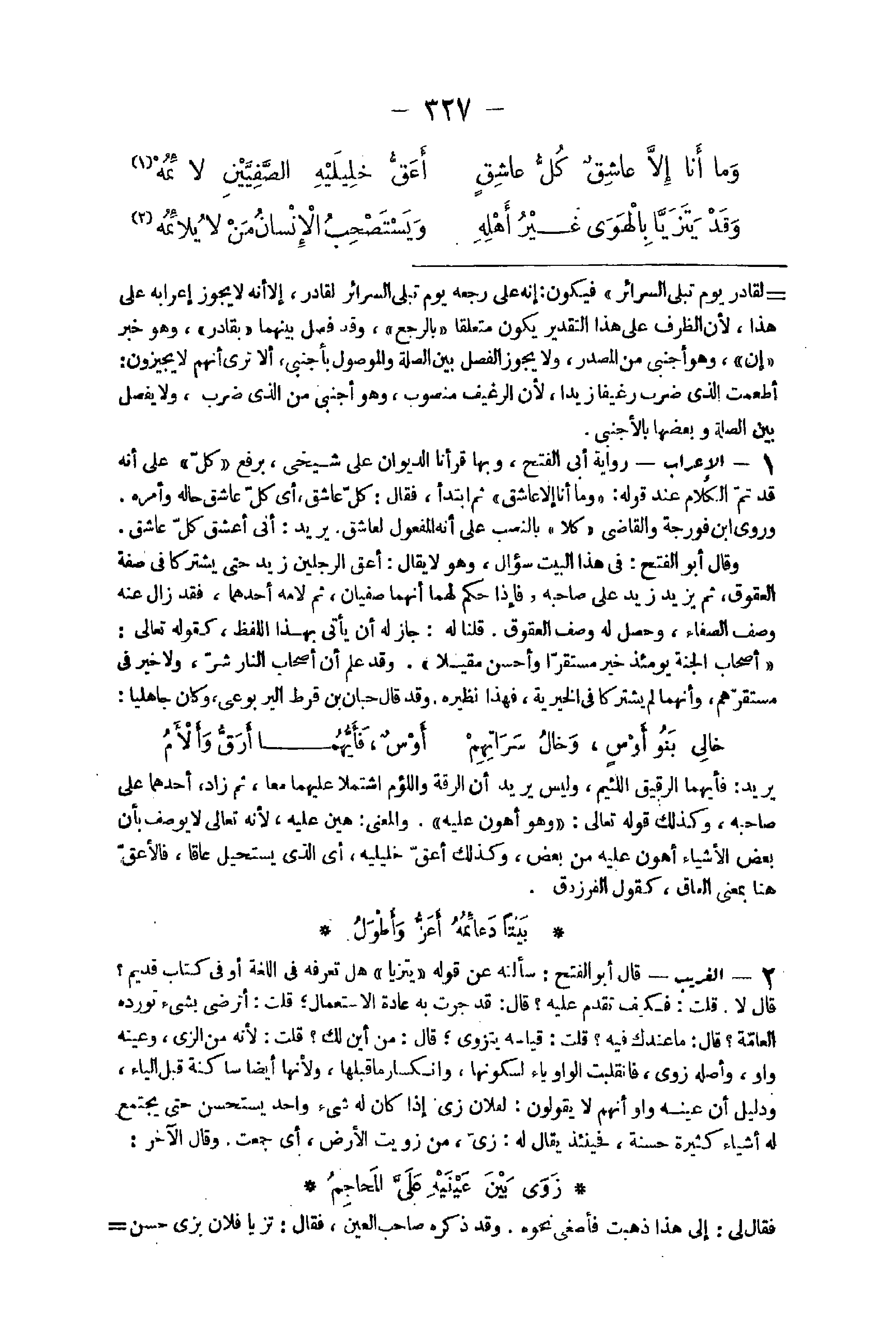2 - الْإِعْرَاب رِوَايَة أبي الْفَتْح وَبهَا قَرَأنَا الدِّيوَان على شَيْخي يرفع كل على انه قد تمّ الْكَلَام عِنْد قَوْله مَا أَنا إِلَّا عاشق ثمَّ ابْتَدَأَ فَقَالَ كل عاشق أَي كل عاشق حَاله وَأمره وروى أبن فورجه وَالْقَاضِي كلا بِالنّصب على انه مفعول لعاشق يُرِيد أَن أعشق كل عاشق وَقَالَ أَبُو الْفَتْح فِي هَذَا الْبَيْت سُؤال وَهُوَ لَا يُقَال أعق الرجلَيْن زيد حَتَّى يشتركا فِي صفة العقوق ثمَّ يزِيد زيدا على صَاحبه فَإِذا حكم لَهما أَنَّهُمَا صفيان ثمَّ لامه أَحدهمَا فقد زَالَ عَنهُ وصف الصفاء وَحصل لَهُ وصف العقوق قُلْنَا لَهُ جَازَ لَهُ ان يَأْتِي بِهَذَا اللَّفْظ كَقَوْلِه تَعَالَى {أَصْحَاب الْجنَّة يَوْمئِذٍ خير مُسْتَقرًّا وَأحسن مقيلا} وَقد علم أَن أَصْحَاب النَّار شَرّ وَلَا خير فِي مستقرهم وانهما لم يشتركا فِي الْخَيْرِيَّة فَهَذَا نَظِيره وَقد قَالَ حبَان بن قرط الْيَرْبُوعي وَكَانَ جاهليا