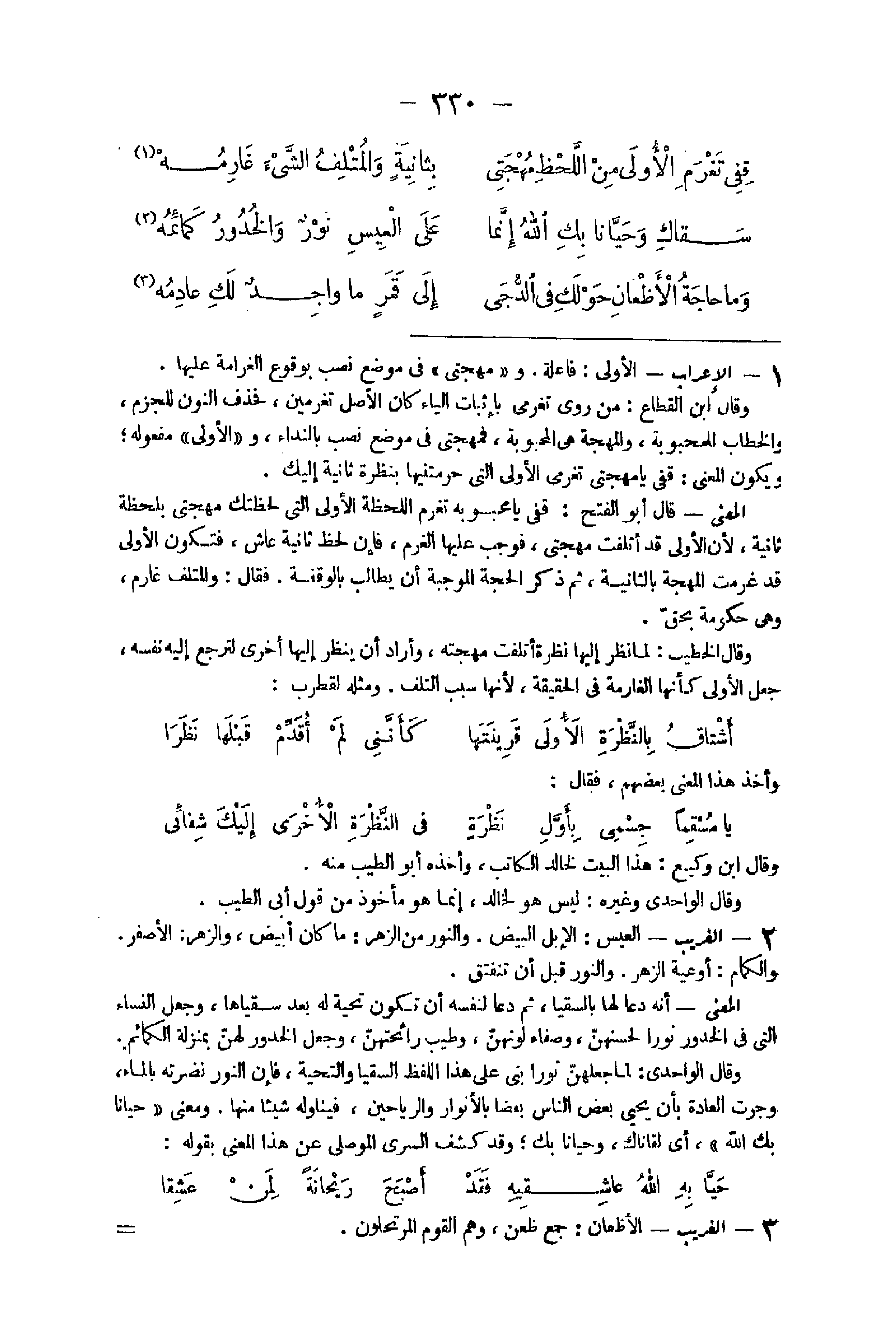 7 - الْغَرِيب العيس الْإِبِل الْبيض والنور من الزهر مَا كَانَ أَبيض والزهر الْأَصْفَر والكمام أوعية الزهر والنور قبل أَن تنفتق الْمَعْنى إِنَّه دَعَا لَهَا بالسقيا ثمَّ دَعَا لنَفسِهِ أَن تكون تَحِيَّة لَهُ بعد سقياها وَجعل النِّسَاء الَّتِي فِي الْخُدُور نورا لحسنهن وصفاء لونهن وَطيب رائحتهن وَجعل الْخُدُور لَهُنَّ بِمَنْزِلَة الكمائم وَقَالَ الواحدي لما جَعلهنَّ نورا بني على هَذَا اللَّفْظ السقيا والتحية فَإِن النُّور تضرته بِالْمَاءِ وَخرجت الْعَادة بِأَن يحي بعض النَّاس بَعْضًا بالأنوار والرياحين فيناوله شَيْئا مِنْهَا وَمعنى أَحْيَانًا بك الله أَي لقاناك وحيانا بك وَقد كشف السّري الْموصِلِي عَن هَذَا الْمَعْنى بقوله