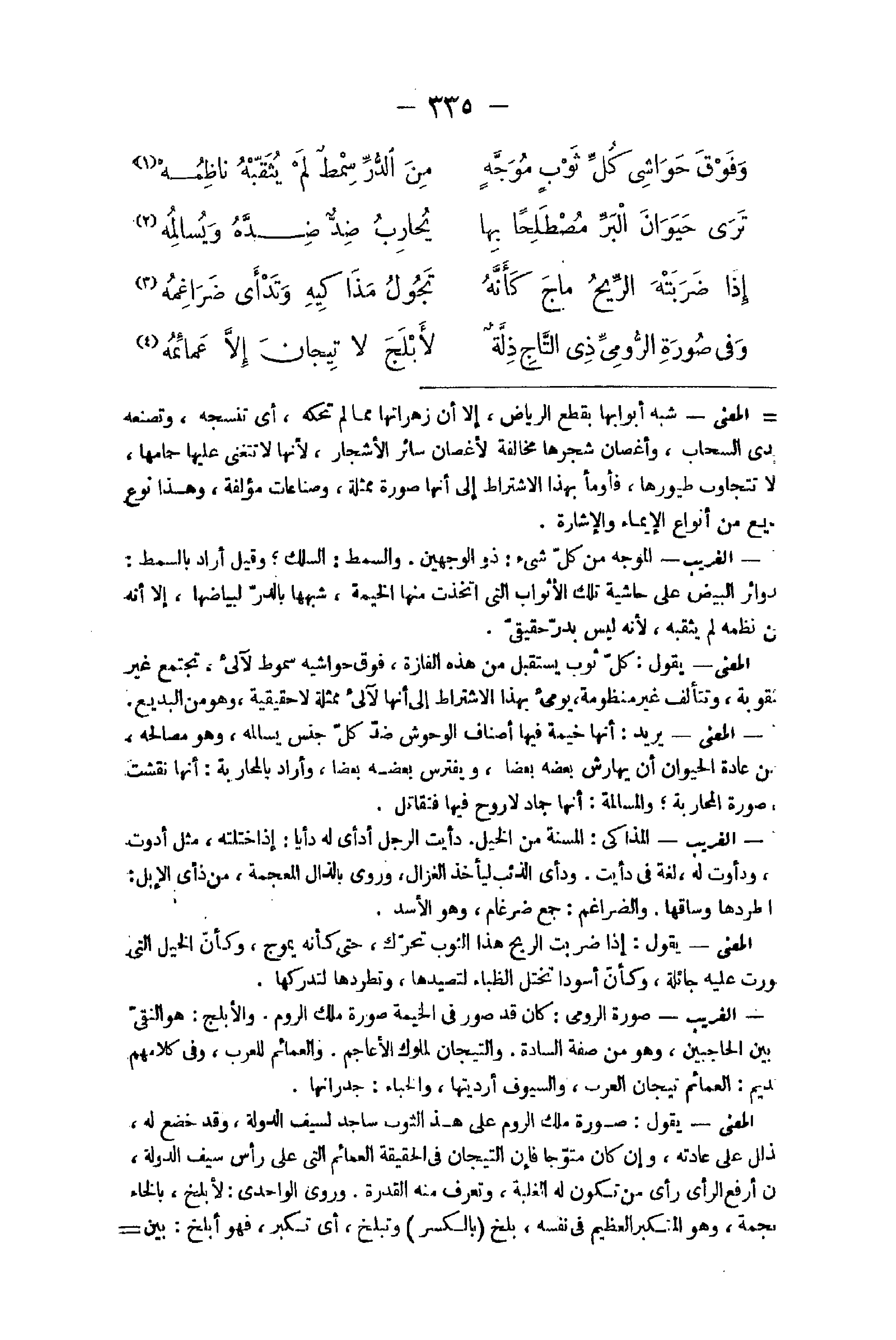 20 - الْغَرِيب الموجه من كل شَيْء ذُو الْوَجْهَيْنِ والسمط السلك وَقيل أَرَادَ بالسمط الدَّوَائِر الْبيض على حَاشِيَة تِلْكَ الأثواب الَّتِي اتَّخذت مِنْهَا الْخَيْمَة شبهها بالدر لبياضها إِلَّا أَنه من نظمه لم يثقبه لِأَنَّهُ لَيْسَ بدر حَقِيقِيّ الْمَعْنى يَقُول كل ثوب يسْتَقْبل من هَذِه الفازة فَوق حَوَاشِيه سموط لآلي تَجْتَمِع غير مثقوبة وتتألف غير منظومة يومىء بِهَذَا الإشتراط إِلَى أَنَّهَا لآلي ممثلة لَا حَقِيقِيَّة وَهُوَ من البديع