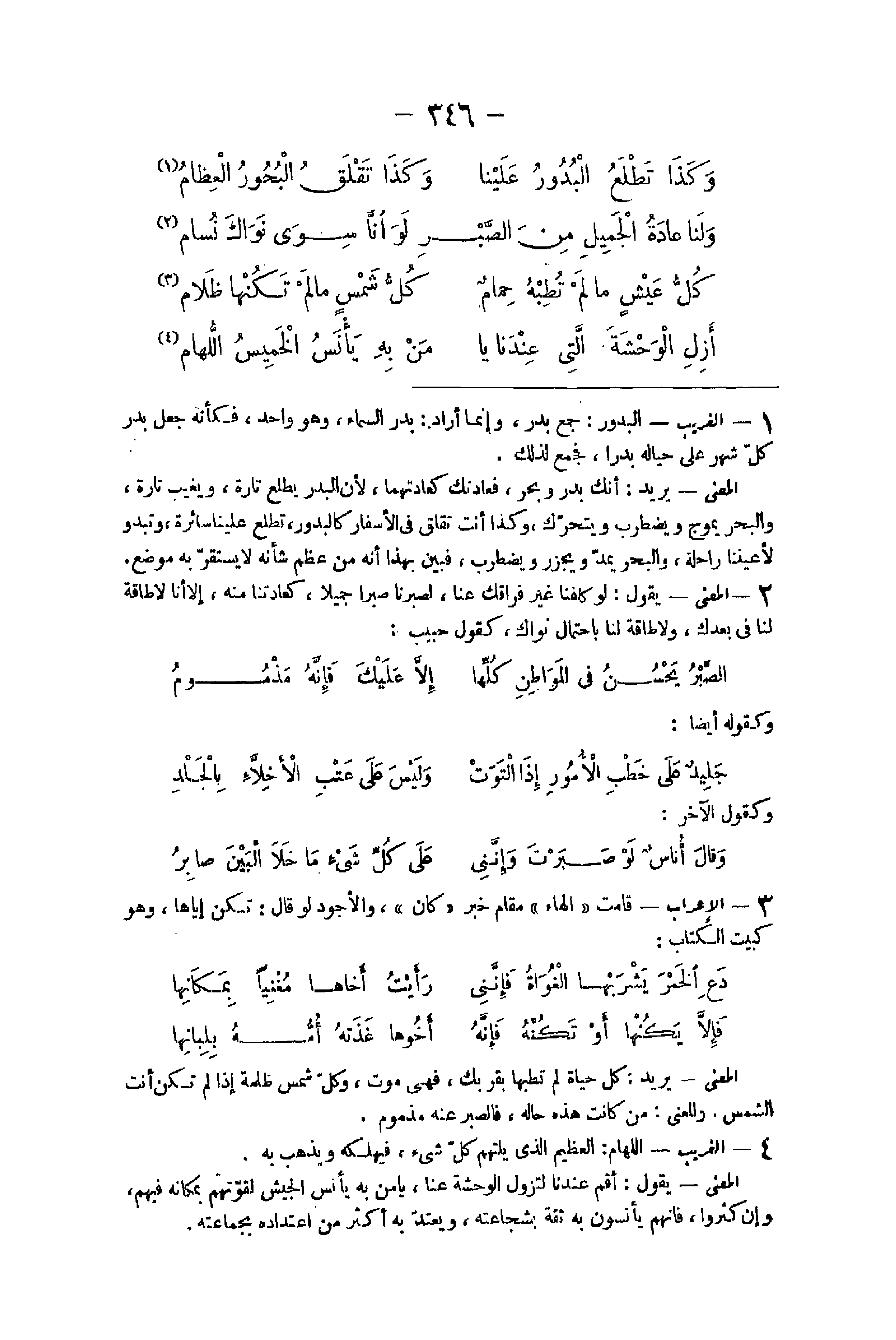10 - الْغَرِيب اللهام الْعَظِيم الَّذِي يلتهم كل شَيْء فيهلكه وَيذْهب بِهِ الْمَعْنى يَقُول أقِم عندنَا لتزول الوحشة عَنَّا يَا من بِهِ يأنس الْجَيْش لقوتهم بمكانه فيهم وَإِن كَثُرُوا فَإِنَّهُم يأنسون بِهِ ثِقَة بشجاعته ويعتد بِهِ أَكثر من اعتداده بجماعته