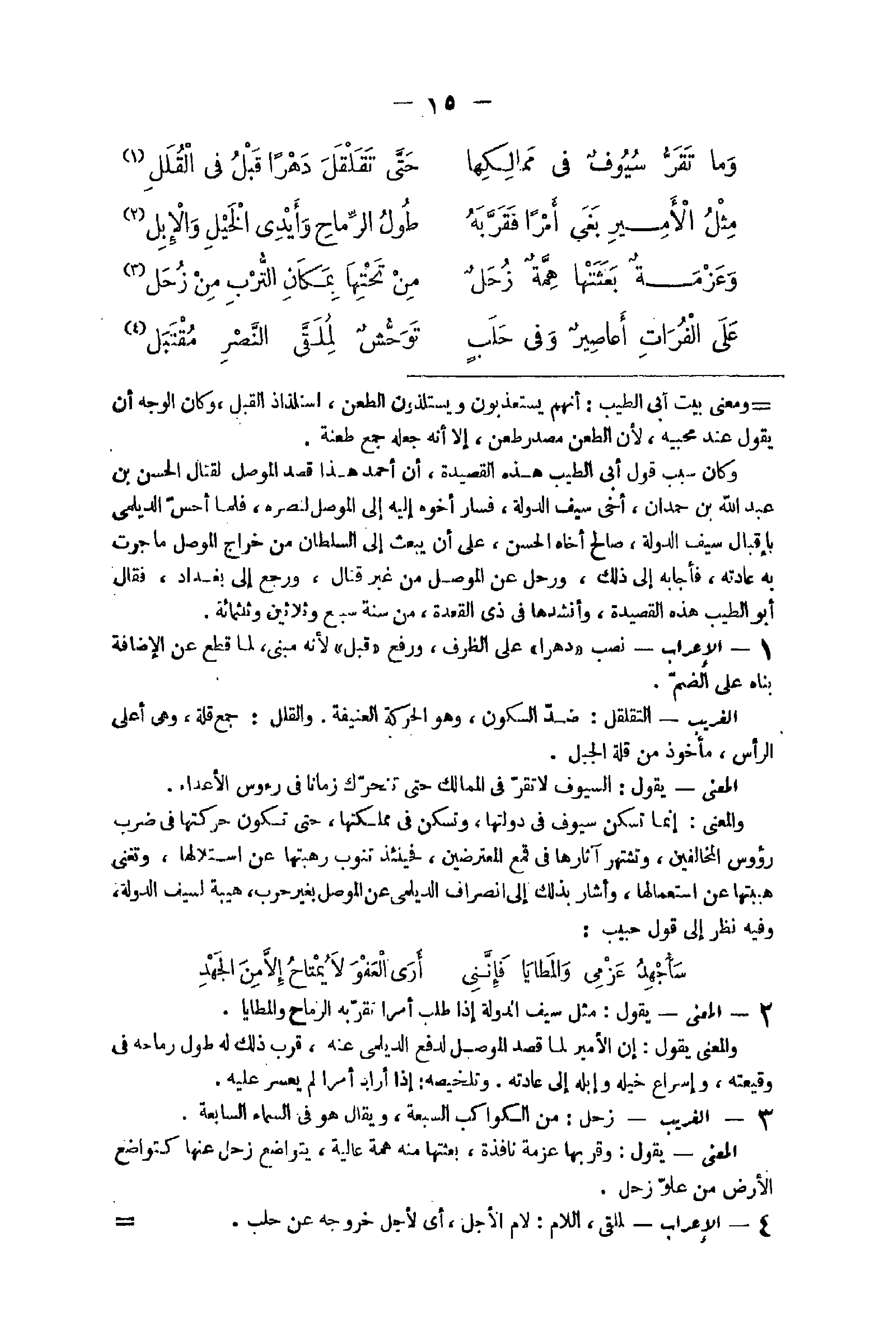 3 - الْمَعْنى يَقُول مثل سيف الدولة إِذا طلب أمرا تقربه الرماح والمطايا وَالْمعْنَى يَقُول إِن الْأَمِير لما قصد الْموصل لدفع الديلمي عَنهُ قرب ذَلِك لَهُ طول رماحه فِي وقيعته وإسراع خيله وَإِبِله إِلَى عَادَته وتلخيصه إِذا أَرَادَ أمرا لم يعسر عَلَيْهِ