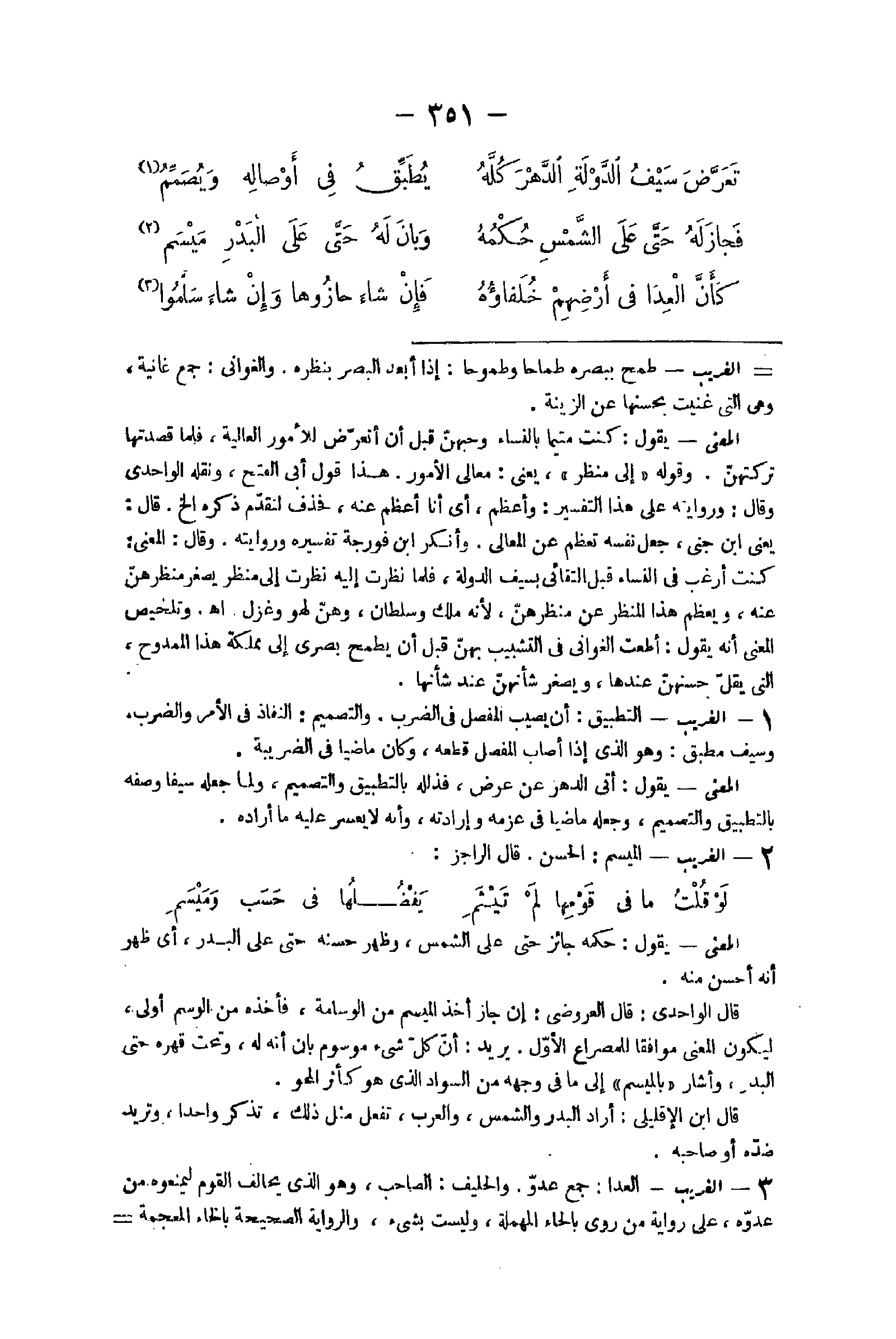 4 - الْغَرِيب التطبيق أَن يُصِيب الْمفصل فِي الضَّرْب والتصميم النَّفاذ فِي الْأَمر وَالضَّرْب وَسيف مطبق وَهُوَ الَّذِي إِذا أصَاب الْمفصل قطعه وَكَانَ مَاضِيا فِي الضريبة الْمَعْنى يَقُول أَتَى الدَّهْر عَن عرض فذلله بالتطبيق والتصميم وَلما جعله سَيْفا وَصفه بالتطبيق والتصميم وَجعله مَاضِيا فِي عزمه وإرادته وَأَنه لَا يعسر عَلَيْهِ مَا أَرَادَهُ