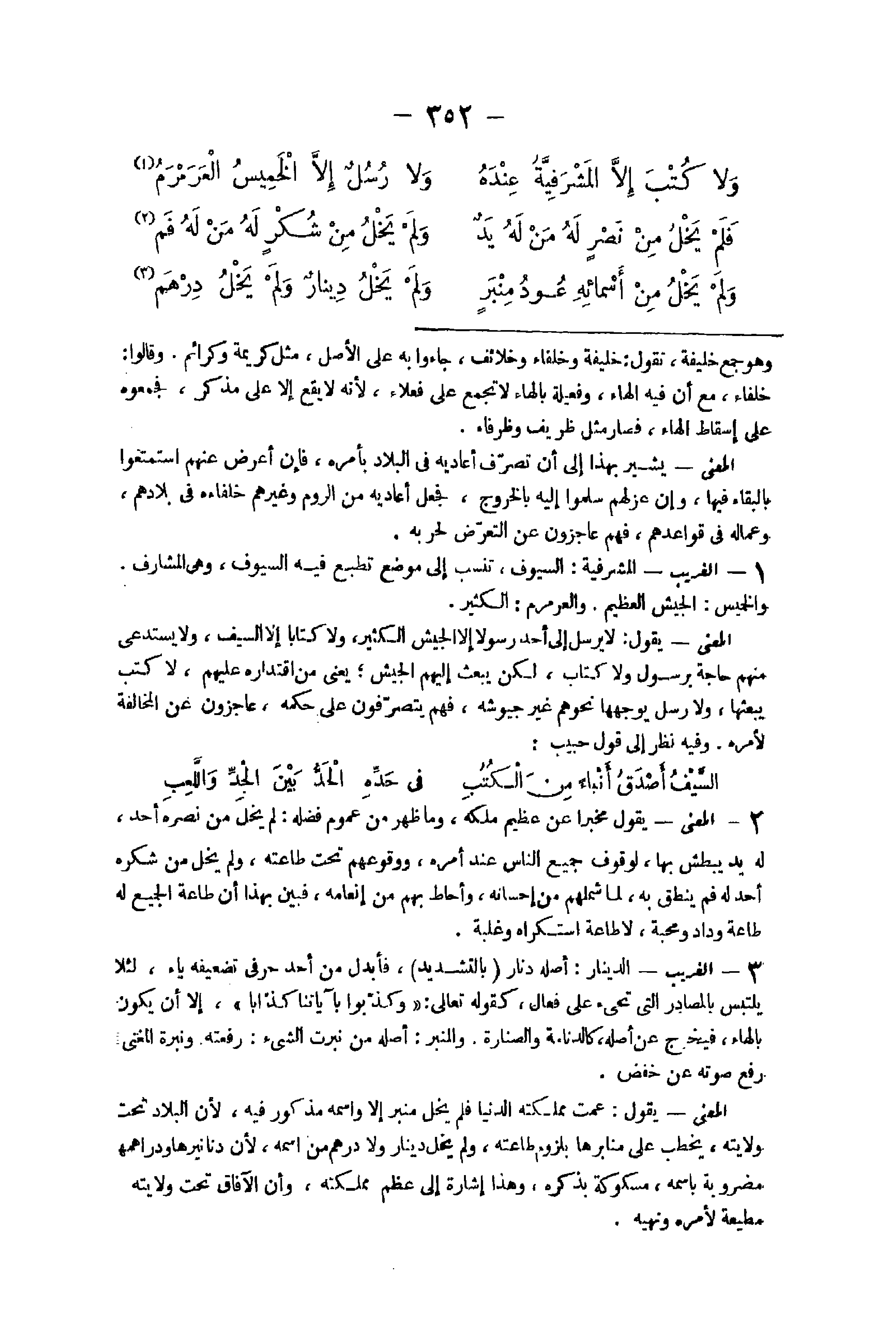 7 - الْغَرِيب المشرفية السيوف تنْسب إِلَى مَوضِع تطبع فِيهِ السيوف وَهِي المشارف وَالْخَمِيس الْجَيْش الْعَظِيم والعرمرم الْكثير الْمَعْنى يَقُول لَا يُرْسل إِلَى أحد رَسُولا إِلَّا الْجَيْش الْكثير وَلَا كتابا إِلَّا بِالسَّيْفِ وَلَا يَسْتَدْعِي مِنْهُم حَاجَة برَسُول وَلَا كتاب لَكِن يبْعَث إِلَيْهِم الْجَيْش يَعْنِي من اقتداره عَلَيْهِم لَا كتب يبعثها وَلَا رسل يوجهها نحوهم غير جيوشه فهم يتصرفون على حكمه عاجزون عَن الْمُخَالفَة لأَمره وَفِيه نظر إِلَى قَول حبيب