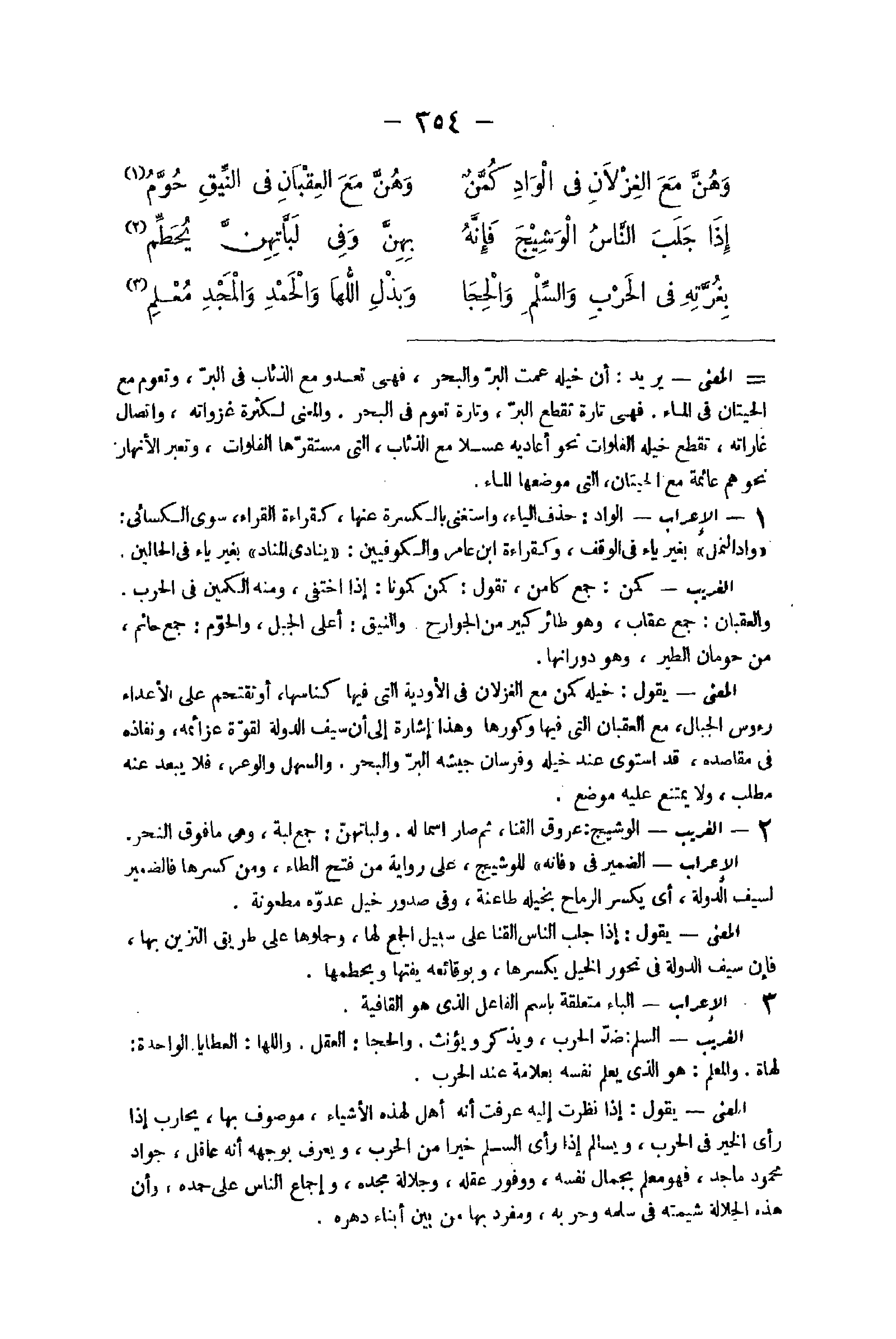 14 - الْإِعْرَاب الواد حذف الْيَاء وَاسْتغْنى بالكسرة عَنْهَا كَقِرَاءَة الْقُرَّاء سوى الْكسَائي وَاد النَّمْل بِغَيْر يَاء فِي الْوَقْف وكقراءة ابْن عَامر والكوفيين يناد المناد بِغَيْر يَاء فِي الْحَالين الْغَرِيب كمن جمع كامن تَقول كمن كمونا إِذا اختفى وَمِنْه الكمين فِي الْحَرْب والعقبان جمع عِقَاب وَهُوَ طَائِر كَبِير من الْجَوَارِح والنيق أَعلَى الْجَبَل والحوم جمع حائم من حوام الطير وَهُوَ دورانها الْمَعْنى يَقُول خيله كمن مَعَ الغزلان فِي الأودية الَّتِي فِيهَا كناسها أَو تقتحم على الْأَعْدَاء رُءُوس الْجبَال مَعَ العقبان الَّتِي فِيهَا وكورها وَهَذَا إِشَارَة إِلَى أَن سيف الدولة لقُوَّة عَزَائِمه ونفاذه فِي مقاصده قد اسْتَوَى عِنْد خيله وفرسان جَيْشه الْبر وَالْبَحْر والسهل والوعر فَلَا يبعد عَنهُ مطلب وَلَا يمْتَنع عَلَيْهِ مَوضِع
