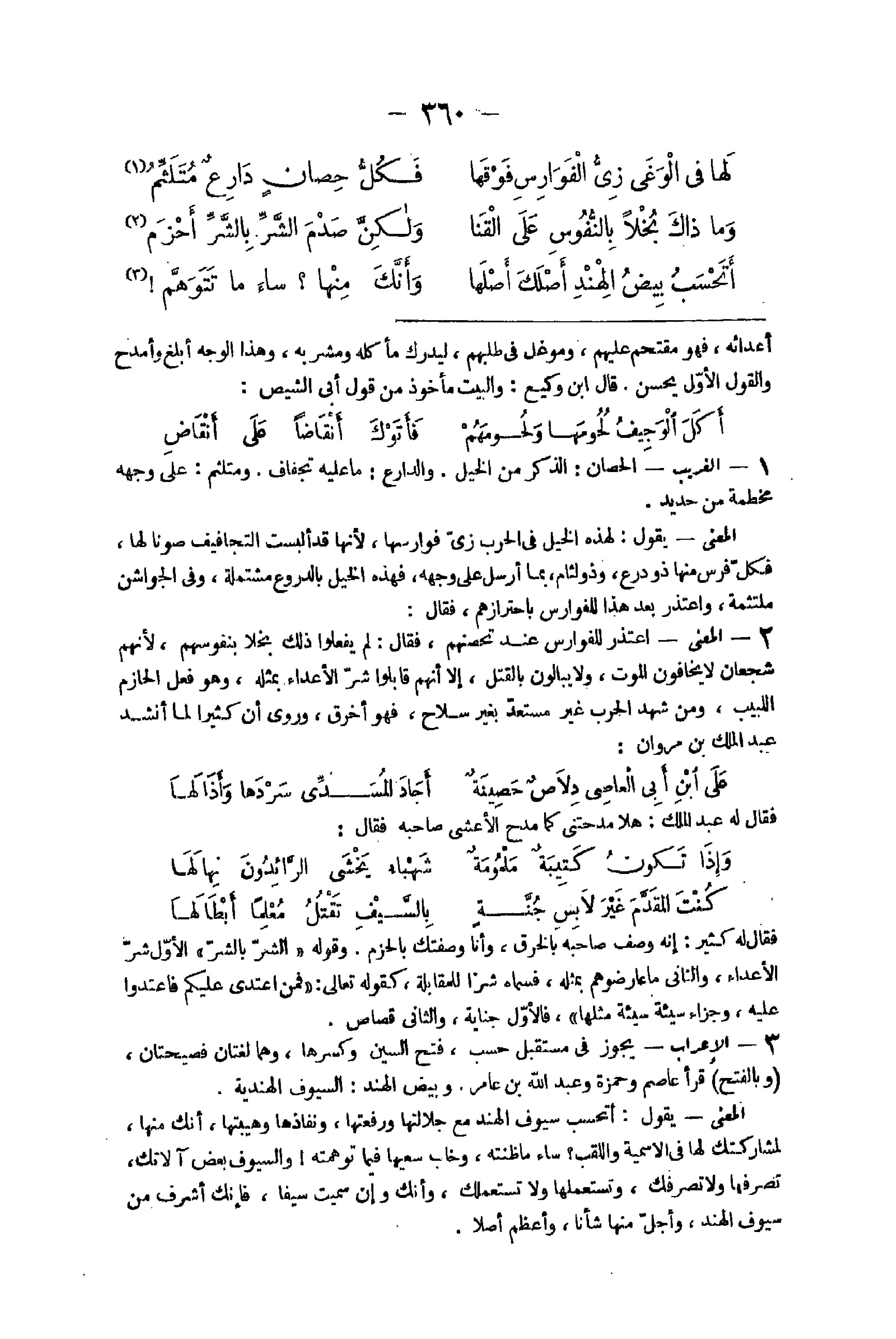 36 - الْغَرِيب الحصان الذّكر من الْخَيل والدارع مَا عَلَيْهِ تجفاف ومتلثم على وَجهه مخطمة من حَدِيد الْمَعْنى يَقُول لهَذِهِ الْخَيل فِي الْحَرْب زِيّ فوارسها لِأَنَّهَا قد ألبست التجافيف صَوتا لَهَا فَكل فرس مِنْهَا ذُو درع وَذُو لثام بِمَا أرسل على وَجهه فَهَذِهِ الْخَيل بالدروع مُشْتَمِلَة وَفِي الجواشن ملتثمة وَاعْتذر بعد هَذَا للفوارس باحترازهم فَقَالَ