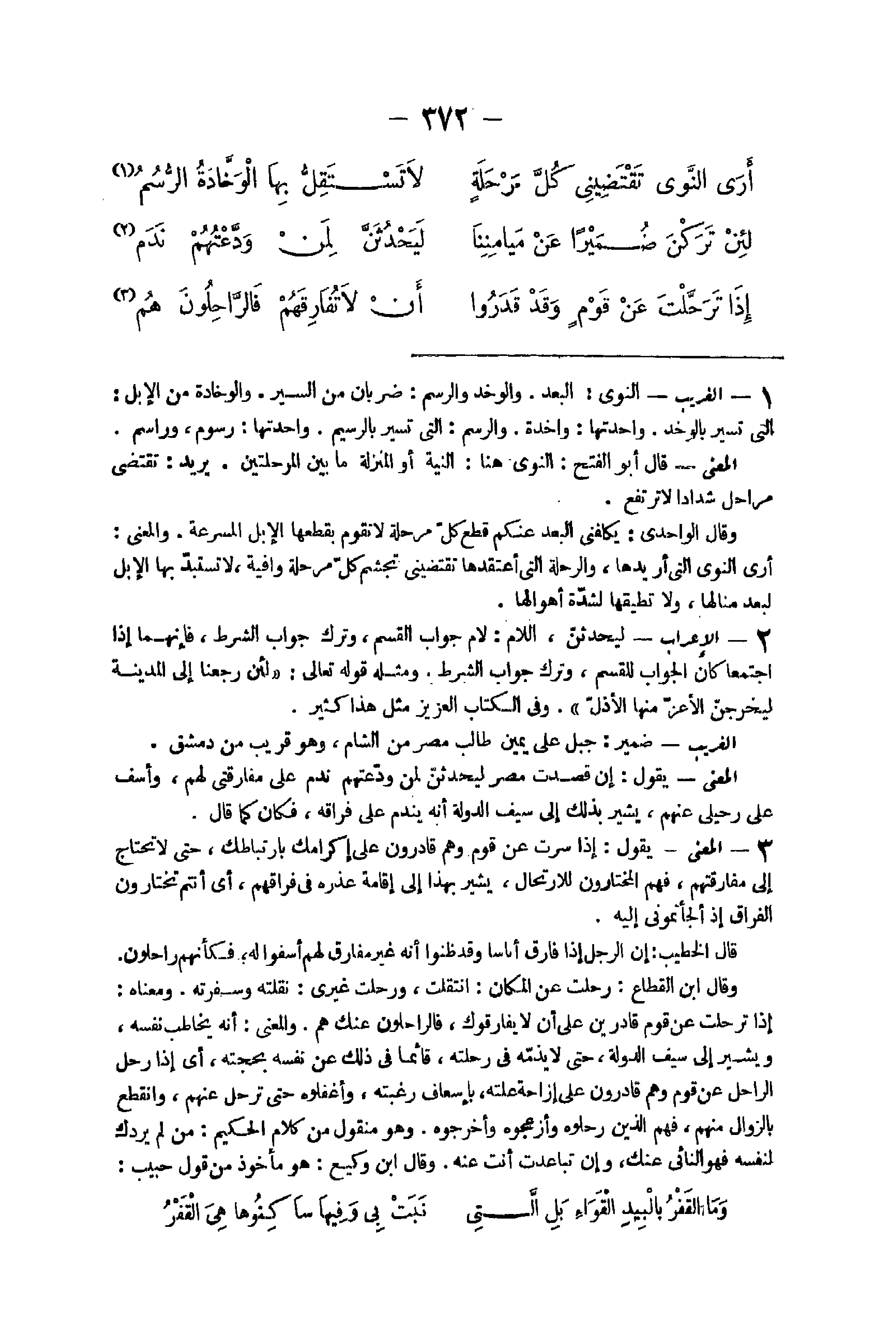 - الْغَرِيب النَّوَى الْبعد والوخد والرسم ضَرْبَان من السّير والوخادة من الْإِبِل الَّتِي تسير بالوخد واحدتها واخدة والرسم الَّتِي تسير بالرسيم واحدتها رسوم وراسم الْمَعْنى قَالَ أَبُو الْفَتْح النَّوَى هُنَا النِّيَّة أَو الْمنزلَة مَا بَين المرحلتين يُرِيد تَقْتَضِي مراحل شدادا لَا ترْتَفع وَقَالَ الواحدى يكلفني الْبعد عَنْكُم قطع كل مرحلة لَا تقوم بقطعها الْإِبِل المسرعة وَالْمعْنَى أرى النَّوَى الَّتِي أريدها والرحلة الَّتِي أعتقدها تقتضيني تجشم كل مرحلة وافية لَا تستبد بهَا الْإِبِل لبعد منالها وَلَا تطيقها لشدَّة أهوالها