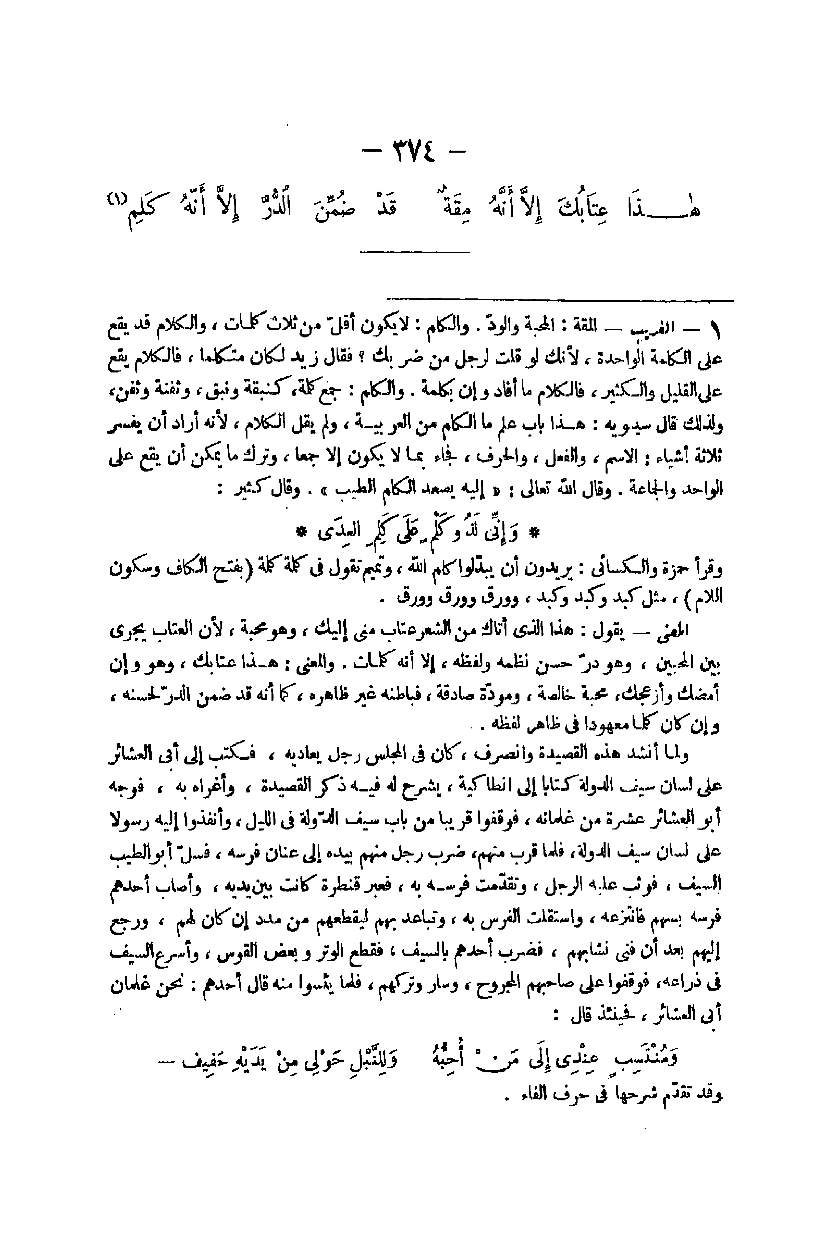 وَقَرَأَ حَمْزَة وَالْكسَائِيّ {يُرِيدُونَ أَن يبدلوا كَلَام الله} وَتَمِيم تَقول فِي كلمة كَلمه بِفَتْح الْكَاف وَسُكُون اللَّام مثل كبد وكبد وكبد وورق وورق وورق الْمَعْنى يَقُول هَذَا الَّذِي أَتَاك من الشّعْر عتاب مني إِلَيْك وَهُوَ محبَّة لِأَن العتاب يجْرِي بَين المحبين وَهُوَ در حسن نظمه وَلَفظه إِلَّا أَنه كَلِمَات وَالْمعْنَى هَذَا عتابك وَهُوَ وَإِن أمضك وأزعجك محبَّة خَالِصَة ومودة صَادِقَة فباطنه غير ظَاهره كَمَا أَنه قد ضمن الدّرّ لحسنه وَإِن كَانَ كلما معهودا فِي ظَاهر لَفظه وَلما أنْشد هَذِه القصيدة وَانْصَرف كَانَ فِي الْمجْلس رجل يعاديه فَكتب إِلَى أبي العشائر على لِسَان سيف الدولة كتابا إِلَى أنطاكية يشْرَح لَهُ فِيهِ ذكر القصيدة وأغراه بِهِ فَوجه أَبُو العشائر عشرَة من غلمانه فوقفوا قَرِيبا من بَاب سيف الدولة فِي اللَّيْل وأنفذوا إِلَيْهِ رَسُولا على لِسَان سيف الدولة فَلَمَّا قرب مِنْهُم ضرب رجل مِنْهُم بِيَدِهِ إِلَى عنان فرسه فسل أَبُو الطّيب السَّيْف فَوَثَبَ عَلَيْهِ الرجل وَتَقَدَّمت فرسه بِهِ فَعبر قنطرة كَانَت بَين يَدَيْهِ وَأصَاب أحدهم فرسه بِسَهْم فانتزعه واستقلت الْفرس بِهِ وتباعد بهم ليقطعهم من مدد إِن كَانَ لَهُم وَرجع إِلَيْهِم بعد أَن فني نشابهم فَضرب أحدهم بِالسَّيْفِ فَقطع الْوتر وَبَعض الْقوس وأسرع السَّيْف فِي ذراعه فوقفوا على صَاحبهمْ الْمَجْرُوح وَسَار وتركهم فَلَمَّا يئسوا مِنْهُ قَالَ أحدهم نَحن غلْمَان أَبى العشائر فَحِينَئِذٍ قَالَ