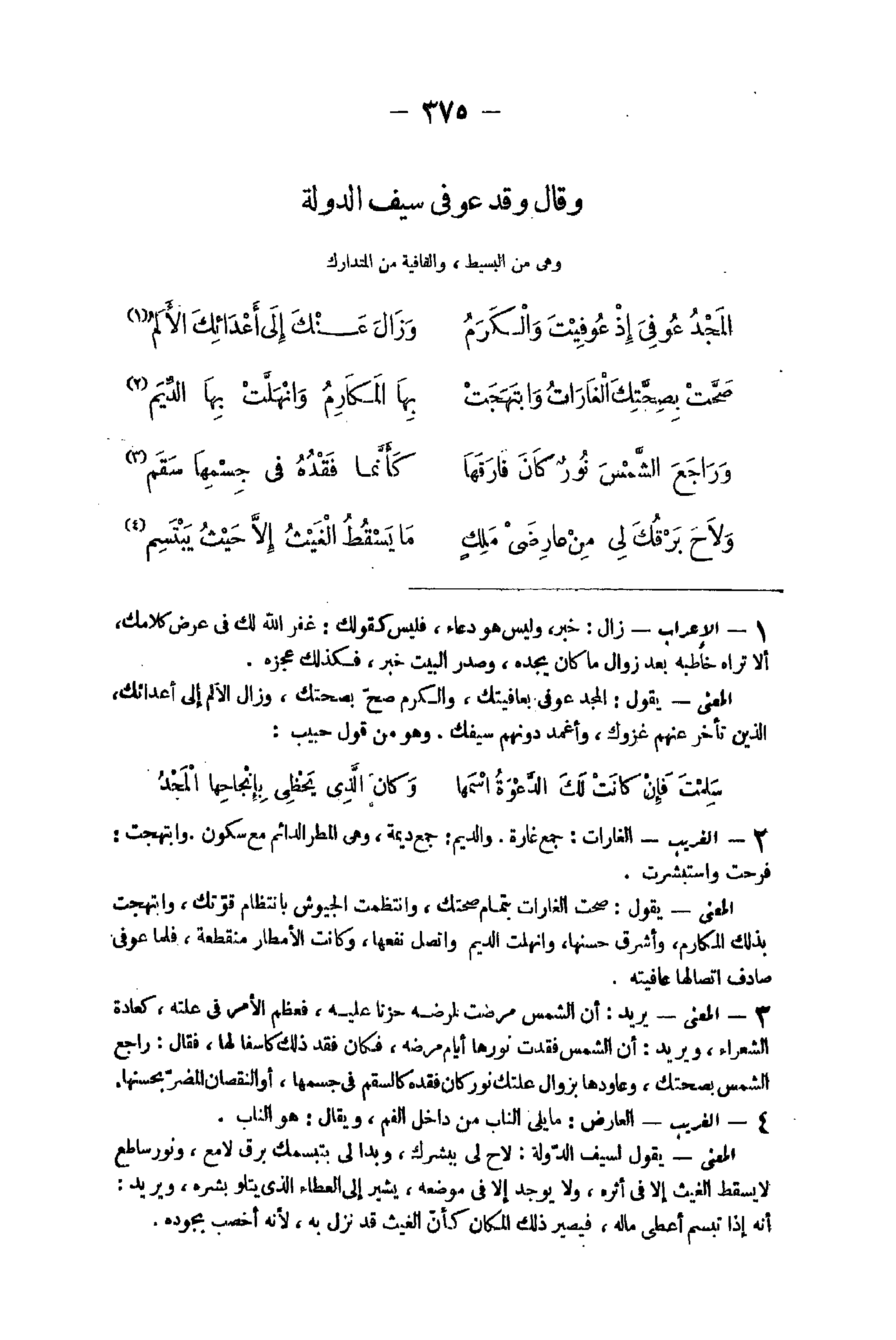 2 - الْغَرِيب الغارات جمع غَارة والديم جمع دِيمَة وَهِي الْمَطَر الدَّائِم مَعَ سُكُون وابتهجت فرحت واستبشرت الْمَعْنى يَقُول صحت الغارات بِتمَام صحتك وانتظمت الجيوش بانتظام قوتك وابتهجت بذلك المكارم وأشرق حسنها وانهلت الديم واتصل نَفعهَا وَكَانَت الأمطار مُنْقَطِعَة فَلَمَّا عوفي صَادف اتصالها عافيته