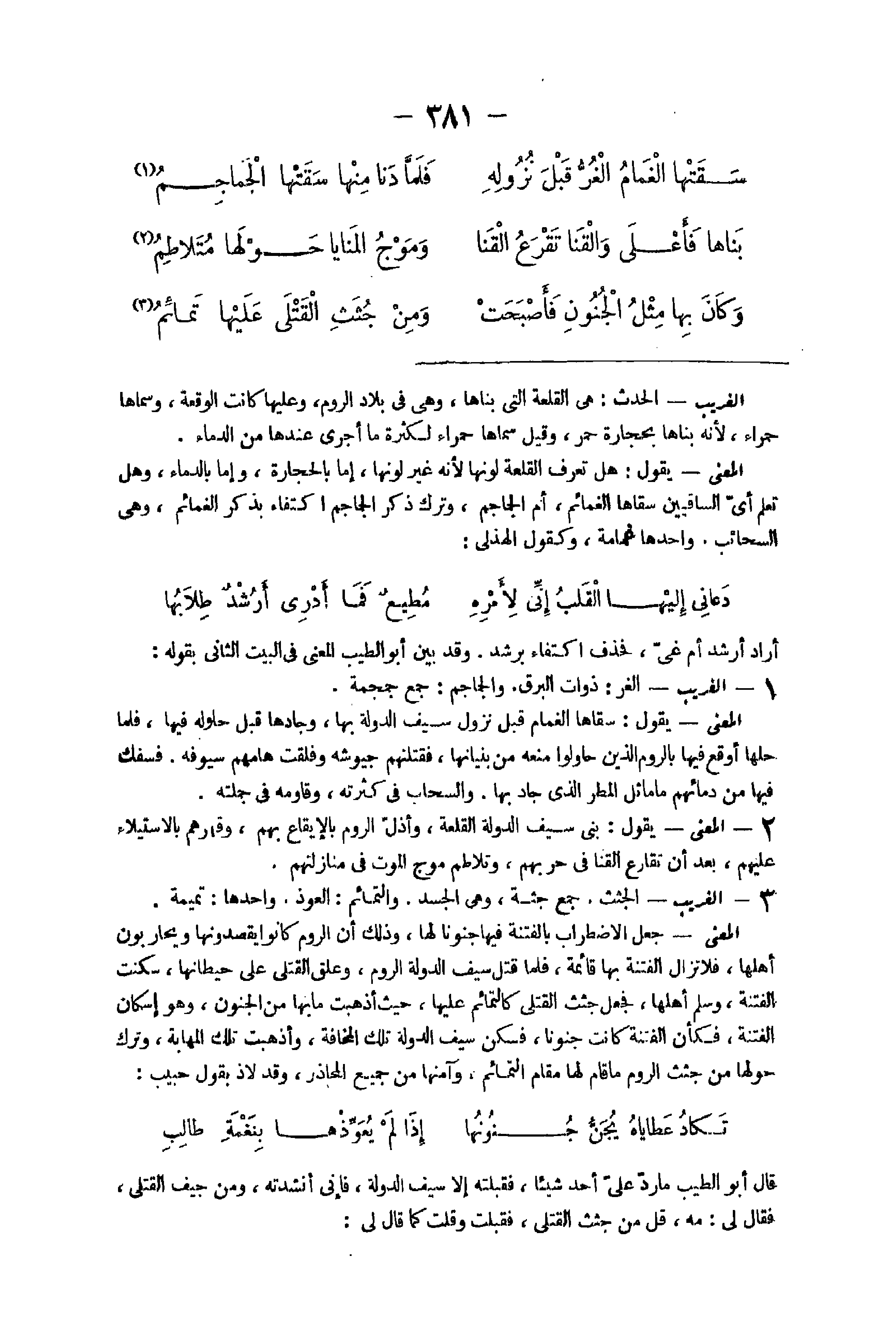 9 - الْمَعْنى يَقُول بنى سيف الدولة القلعة وأذل الرّوم بالإيقاع بهم وقهرهم بِالِاسْتِيلَاءِ عَلَيْهِم بعد أَن تقارع القنا فِي حربهم وتلاطم موج الْمَوْت فِي منازلتهم