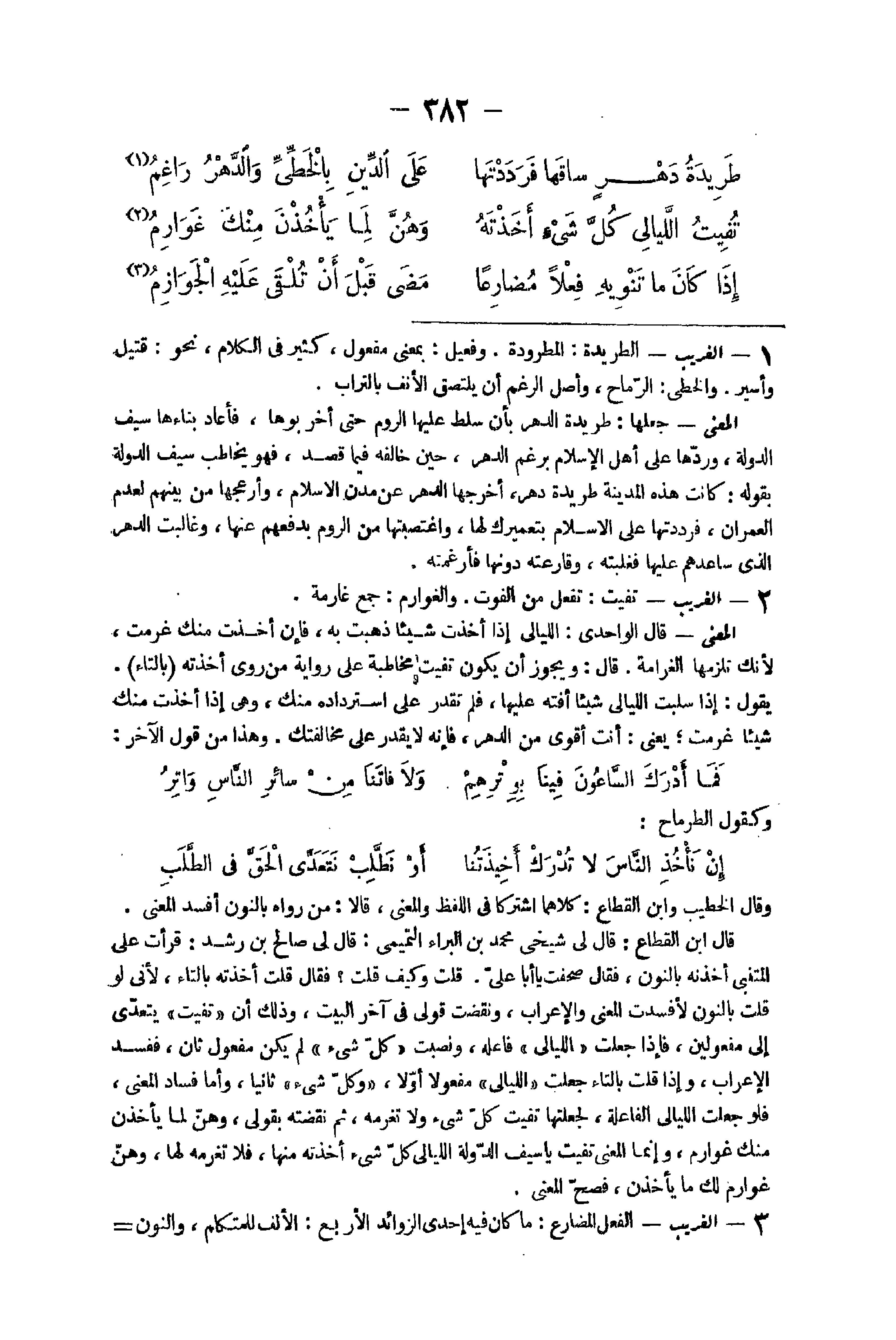 12 - الْغَرِيب تفيت تفعل من الْفَوْت والغوا رم جمع غارمة الْمَعْنى قَالَ الواحدى اللَّيَالِي إِذا أخذت شَيْئا ذهبت بِهِ فَإِن أخذت مِنْك غرمت لِأَنَّك تلزمها الغرامة قَالَ وَيجوز أَن يكون تفيت مُخَاطبَة على رِوَايَة من روى أَخَذته بِالتَّاءِ يَقُول إِذا سلبت اللَّيَالِي شَيْئا أفته عَلَيْهَا فَلم تقدر على اسْتِرْدَاده وَهِي إِذا أخذت مِنْك شَيْئا غرمت يَعْنِي أَنْت أقوى من الدَّهْر فَإِنَّهُ لَا يقدر على مخالفتك وَهَذَا من قَول الآخر