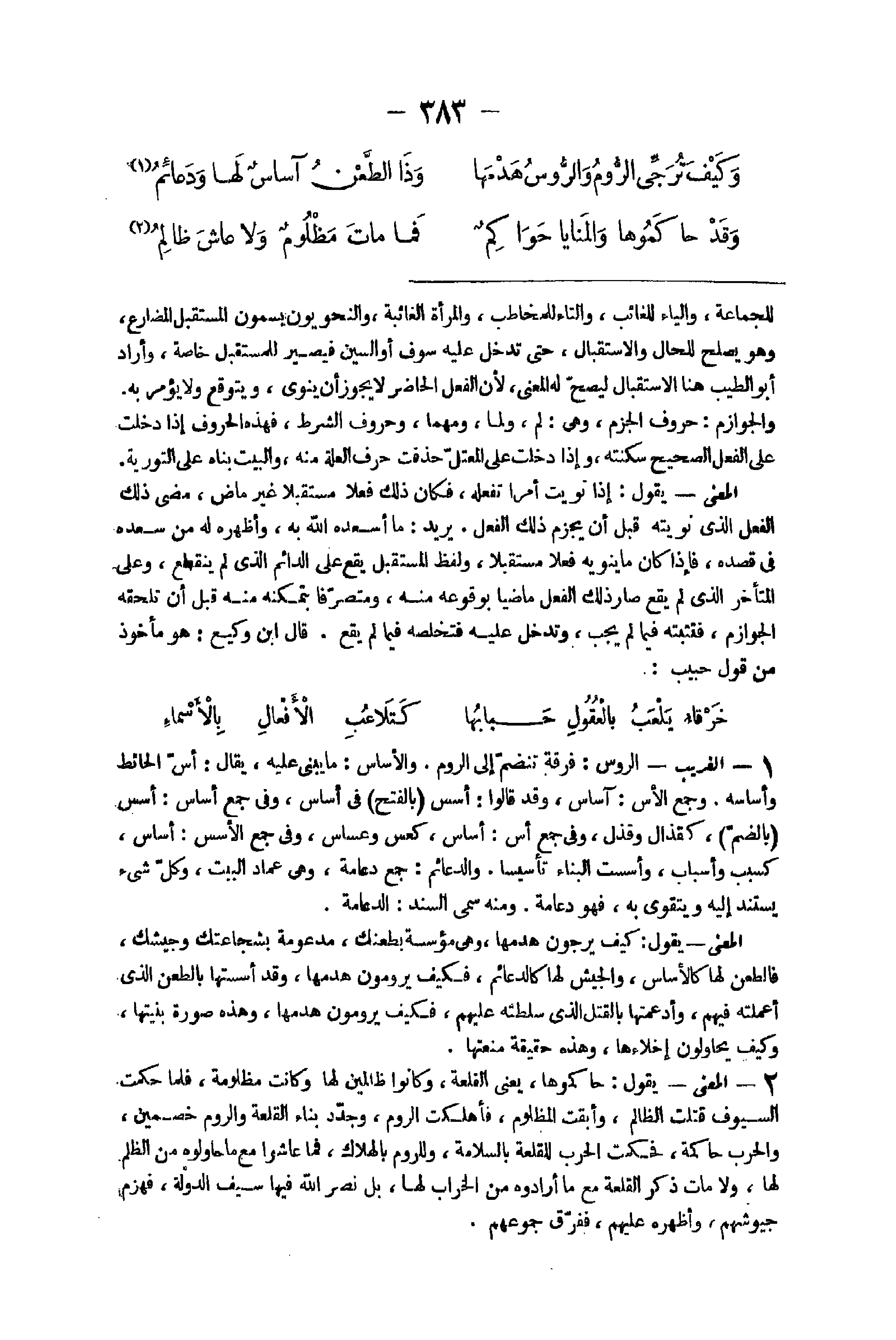 14 - الْغَرِيب الروس فرقة تنضم إِلَى الرّوم والأساس مَا يَبْنِي عَلَيْهِ يُقَال أس الْحَائِط وأساسه وَجمع الأس آساس وَقد قَالُوا أسس بِالْفَتْح فِي أساس وَفِي جمع أساس أسس بِالضَّمِّ كقذال وقذل وَفِي جمع أس إساس كعس وعساس وَفِي جمع الأسس آساس كسبب وَأَسْبَاب واسست الْبناء تأسيسا والدعائم جمع دعامة وَهِي عماد الْبَيْت وكل شَيْء يسْتَند إِلَيْهِ ويتقوى بِهِ فَهُوَ دعامة وَمِنْه سمي السَّنَد الدعامة الْمَعْنى يَقُول كَيفَ يرجون هدمها وَهِي موسسة بطعنك مدعومة بشجاعتك وجيشك فالطعن لَهَا كالأساس والجيش لَهَا كالدعائم فَكيف يرومون هدمها وَقد أسستها بالطعن الَّذِي أعملته فيهم وأدعمتها بِالْقَتْلِ الَّذِي سلطته عَلَيْهِم فَكيف يرومون هدمها وَهَذِه صُورَة بنيتها وَكَيف يحاولون إخلاءها وَهَذِه حَقِيقَة منعتها