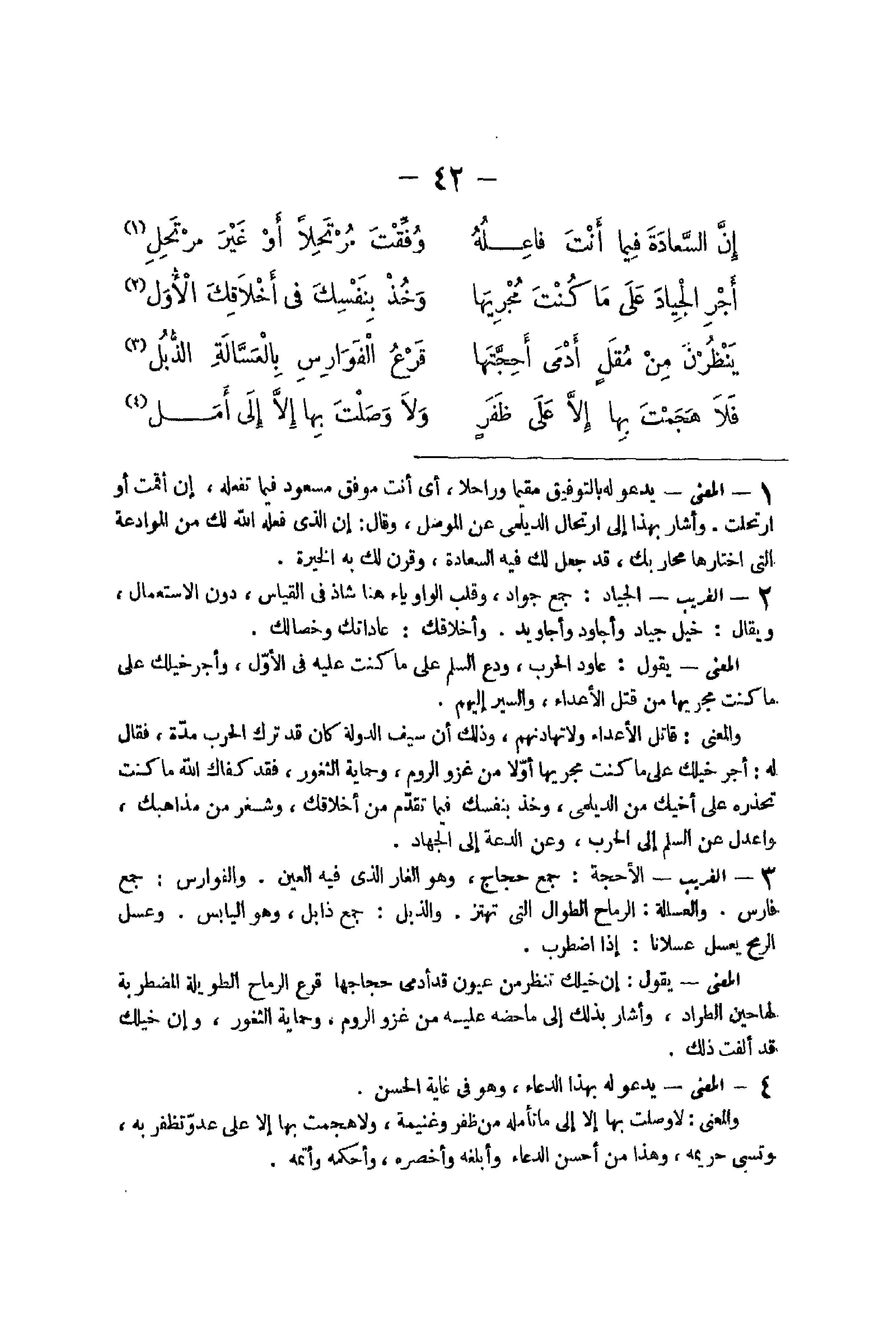 26 - الْغَرِيب الْجِيَاد جمع جواد وقلب الْوَاو يَاء هُنَا شَاذ فِي الْقيَاس دون الِاسْتِعْمَال وَيُقَال خيل جِيَاد وأجاويد وأخلاقك عاداتك وخصالك الْمَعْنى يَقُول عاود الْحَرْب ودع السّلم على مَا كنت عَلَيْهِ فِي الأول وَأجر خيلك على مَا كنت مجريها من قتل الْأَعْدَاء وَالسير إِلَيْهِم وَالْمعْنَى قَاتل الْأَعْدَاء وَلَا تهادنهم وَذَلِكَ أَن سيف الدولة كَانَ قد ترك الْحَرْب مُدَّة فَقَالَ لَهُ أجر خيلك على مَا كنت مجريها أَولا من غَزْو الرّوم وحماية الثغور فقد كفك الله مَا كنت تحذره على أَخِيك من الديلمي وَخذ بِنَفْسِك فِيمَا تقدم من أخلاقك وشغر من مذاهبك واعدل عَن السّلم إِلَى الْحَرْب وَعَن الدعة إِلَى الْجِهَاد