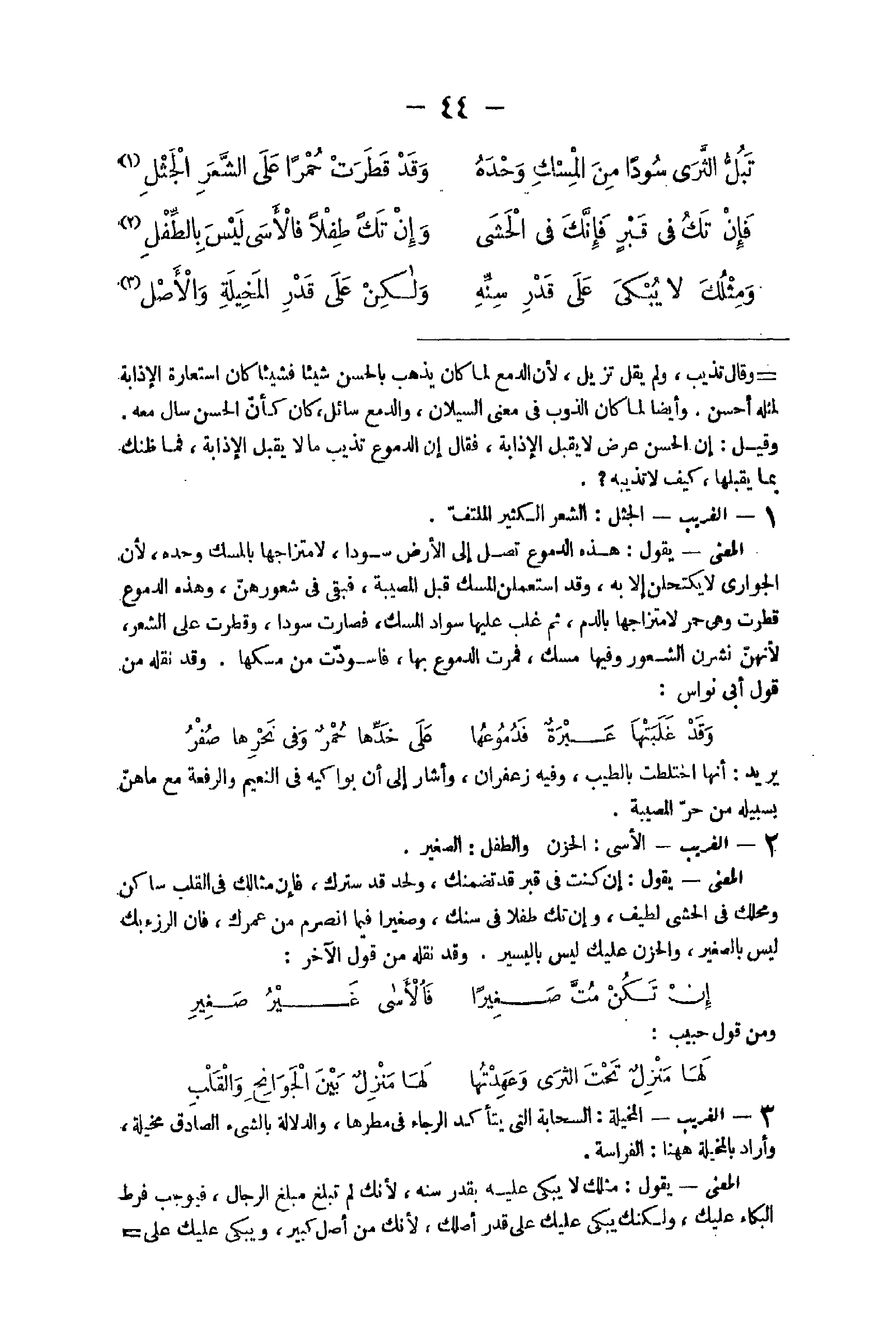 4 - الْغَرِيب الجثل الشّعْر الْكثير الملتف الْمَعْنى يَقُول هَذِه الدُّمُوع تصل إِلَى الأَرْض سُودًا لَا متزاجها بالمسك وَحده لِأَن الْجَوَارِي لَا يكتحلن إِلَّا بِهِ وَقد استعملن الْمسك قبل الْمُصِيبَة فَيبقى فِي شعورهن وَهَذِه الدُّمُوع قطرت وَهِي حمر لَا متزاجها بِالدَّمِ ثمَّ غلب عَلَيْهَا سَواد الْمسك فَصَارَت سُودًا وقطرت على الشّعْر لِأَنَّهُنَّ نشرن الشُّعُور وفيهَا مسك فمرت الدُّمُوع بهَا فاسودت من مسكها وَقد نَقله من قَول أبي نواس
