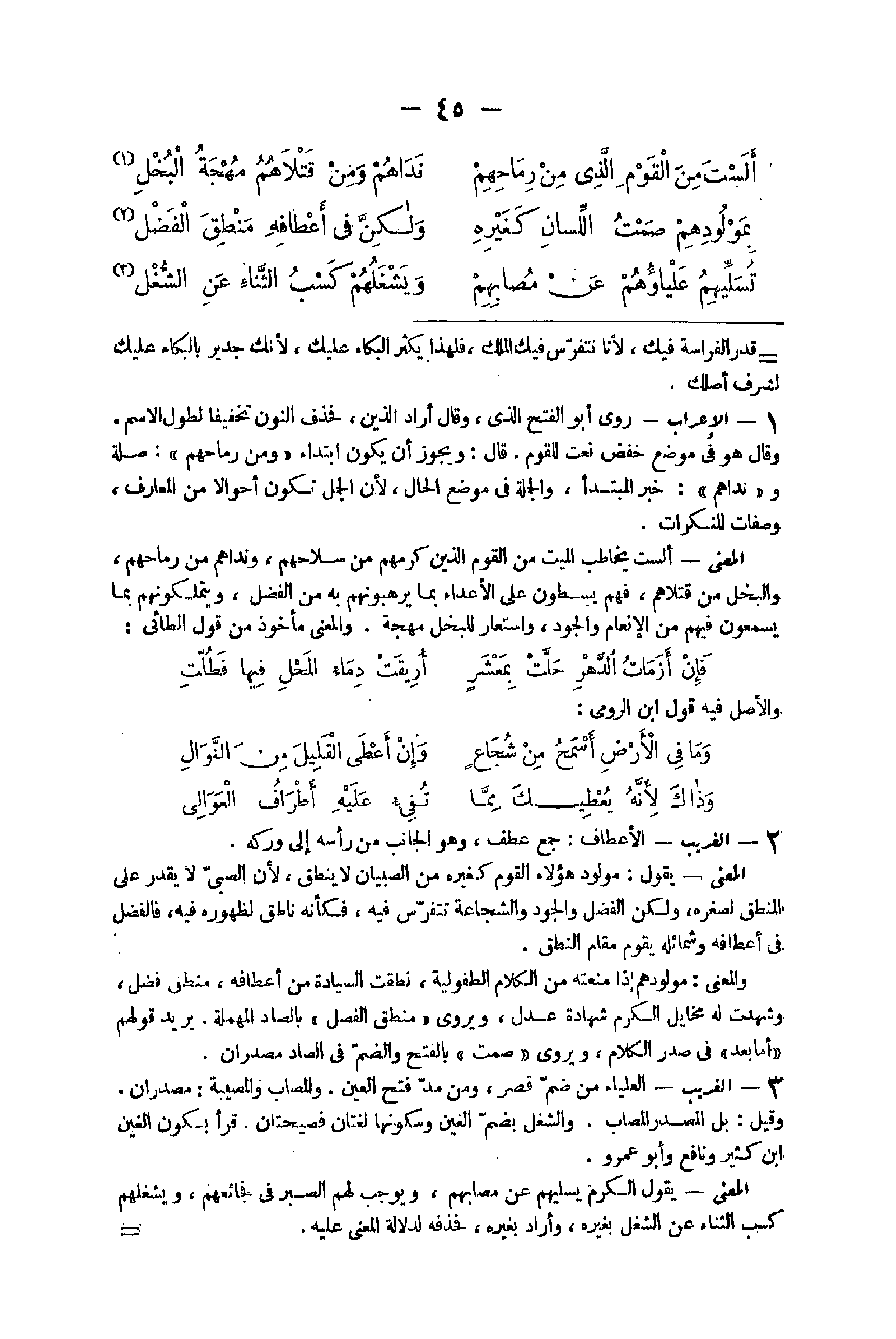 9 - الْغَرِيب العلياء من ضم قصر وَمن مد فتح الْعين والمصاب والمصيبة مصدران وَقيل بل الْمصدر الْمُصَاب والشغل بِضَم الْغَيْن وسكونها لُغَتَانِ فصيحتان قَرَأَ بِسُكُون الْغَيْن ابْن كثير وَنَافِع وَابْن عَمْرو الْمَعْنى يَقُول الْكَرم يسليهم عَن مصابهم وَيُوجب لَهُم الصَّبْر فِي فجائعهم ويشغلهم كسب الثَّنَاء عَن الشّغل بِغَيْرِهِ وَأَرَادَ بِغَيْرِهِ فَحَذفهُ لدلَالَة الْمَعْنى عَلَيْهِ