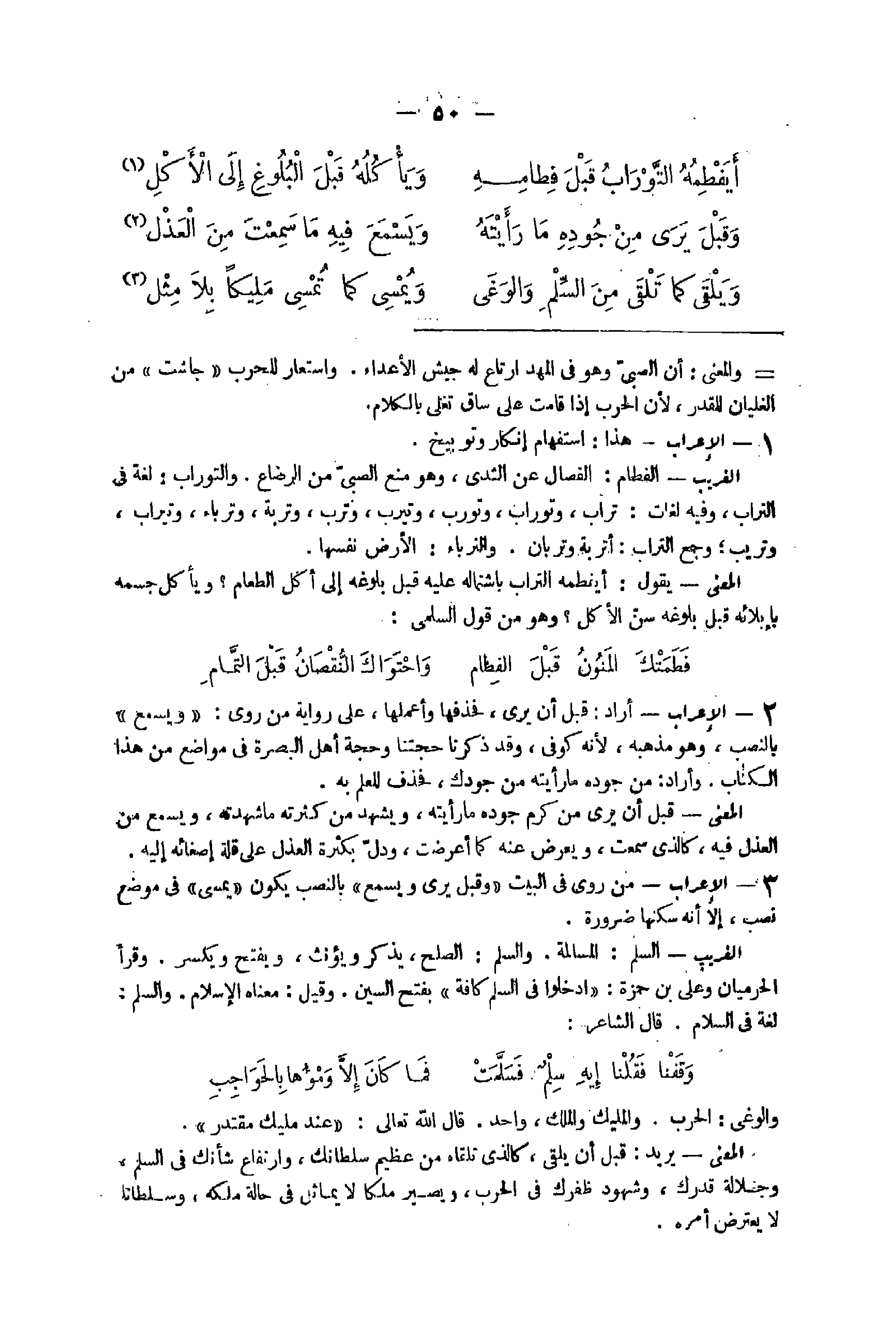 23 - الْإِعْرَاب هَذَا اسْتِفْهَام إِنْكَار وتوبيخ الْغَرِيب الْفِطَام الفصال عَن الثدي وَهُوَ منع الصَّبِي من الرَّضَاع والتوارب لُغَة فِي التُّرَاب وَفِيه لُغَات تُرَاب وتوارب وتورب وتيرب وترب وتربة وترباء وتيراب وتريب وَجمع التُّرَاب أتربة وتربان والترباء الأَرْض نَفسهَا الْمَعْنى يَقُول أيفطمه التُّرَاب باشتماله عَلَيْهِ قبل بُلُوغه إِلَى أكل الطَّعَام وَيَأْكُل جِسْمه بإبلائه قبل بُلُوغه سنّ الْأكل وَهُوَ من قَول السّلمِيّ