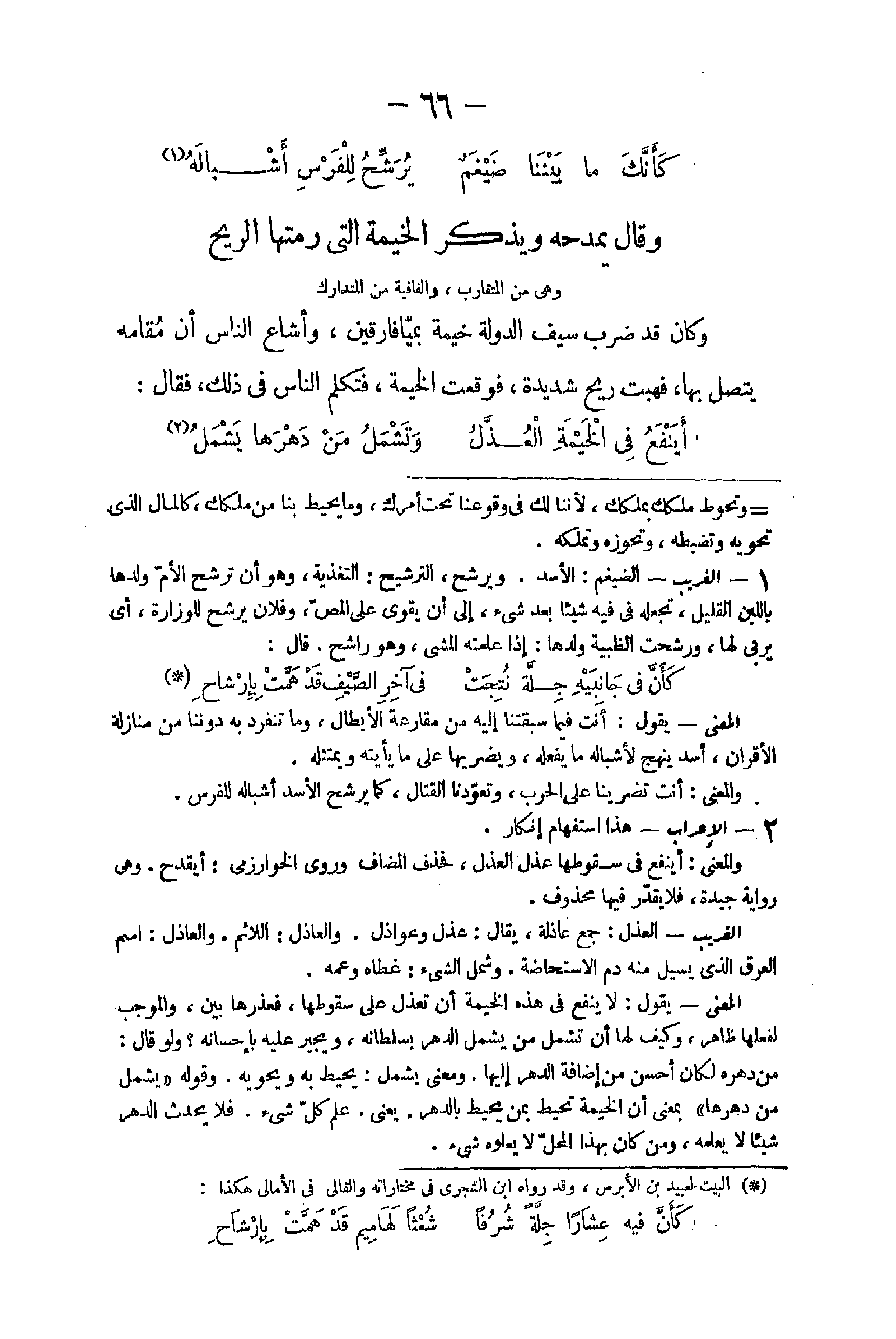 - 1 الْإِعْرَاب هَذَا اسْتِفْهَام إِنْكَار وَالْمعْنَى أينفع فِي سُقُوطهَا عذل العذل فَحذف الْمُضَاف وروى الْخَوَارِزْمِيّ أيقدح وَهِي رِوَايَة جَيِّدَة فَلَا يقدر فِيهَا مَحْذُوف الْغَرِيب العذل جمع عاذلة يُقَال عذل وعواذل والعاذل اللائم والعذل اسْم الْعرق الَّذِي يسيل مِنْهُ دم الِاسْتِحَاضَة وَشَمل الشَّيْء غطاه وَعَمه الْمَعْنى يَقُول لَا ينفع فِي هَذِه الْخَيْمَة أَن تعذل على سُقُوطهَا فعذرها بَين والموجب لفعلها ظَاهر وَكَيف لَهَا أَن تَشْمَل من يَشْمَل الدَّهْر بسلطانه وَيُجِير عَلَيْهِ بإحسانه وَلَو قَالَ من دهره لَكَانَ أحسن من إِضَافَة الدَّهْر إِلَيْهَا وَمعنى يَشْمَل يُحِيط بِهِ ويحويه وَقَوله يَشْمَل من دهرها بِمَعْنى أَن الْخَيْمَة تحيط بِمن يُحِيط بالدهر يَعْنِي علم كل شَيْء فَلَا يحدث الدَّهْر شَيْئا لَا يُعلمهُ وَمن كَانَ بِهَذَا الْمحل لَا يعلوه شَيْء