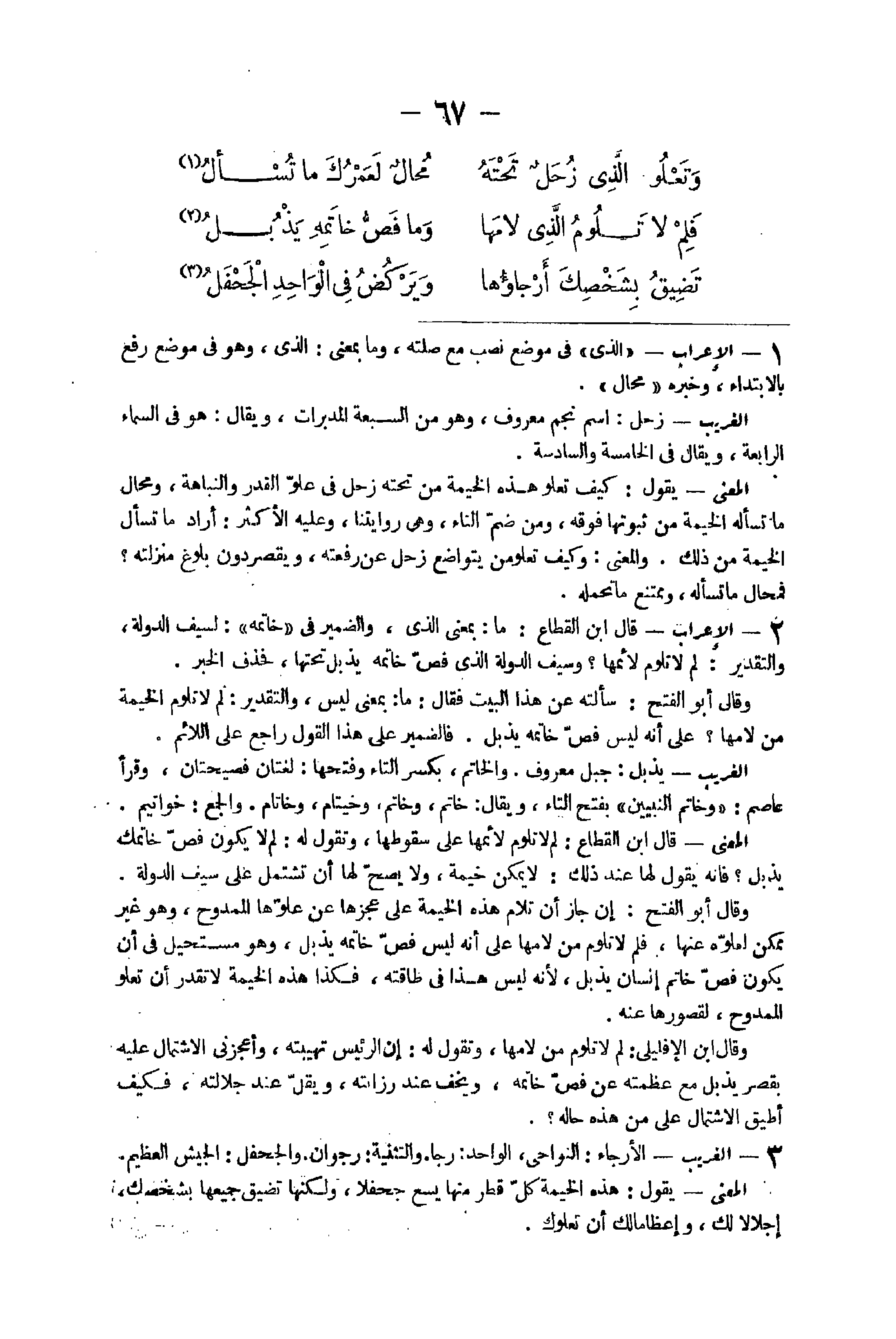 - الْإِعْرَاب الَّذِي فِي مَوضِع نصب مَعَ صلته وَمَا بِمَعْنى الَّذِي وَهُوَ فِي مَوضِع رفع بِالِابْتِدَاءِ وَخَبره محَال الْغَرِيب زحل اسْم نجم مَعْرُوف وَهُوَ من السَّبْعَة المدبرات وَيُقَال هُوَ فِي السَّمَاء الرَّابِعَة وَيُقَال فِي الْخَامِسَة وَالسَّادِسَة الْمَعْنى يَقُول كَيفَ تعلو هَذِه الخيمه من تَحْتَهُ زحل فِي علو الْقدر والنباهة ومحال مَا تسأله الْخَيْمَة من ثُبُوتهَا فَوْقه وَمن ضم التَّاء وَهِي روايتنا وَعَلِيهِ الْأَكْثَر أَرَادَ مَا تسْأَل الْخَيْمَة من ذَلِك وَالْمعْنَى وَكَيف تعلو من يتواضع زحل عَن رفعته وَيقصر دون بُلُوغ مَنْزِلَته فمحال مَا تسأله وممتنع مَا تحمله