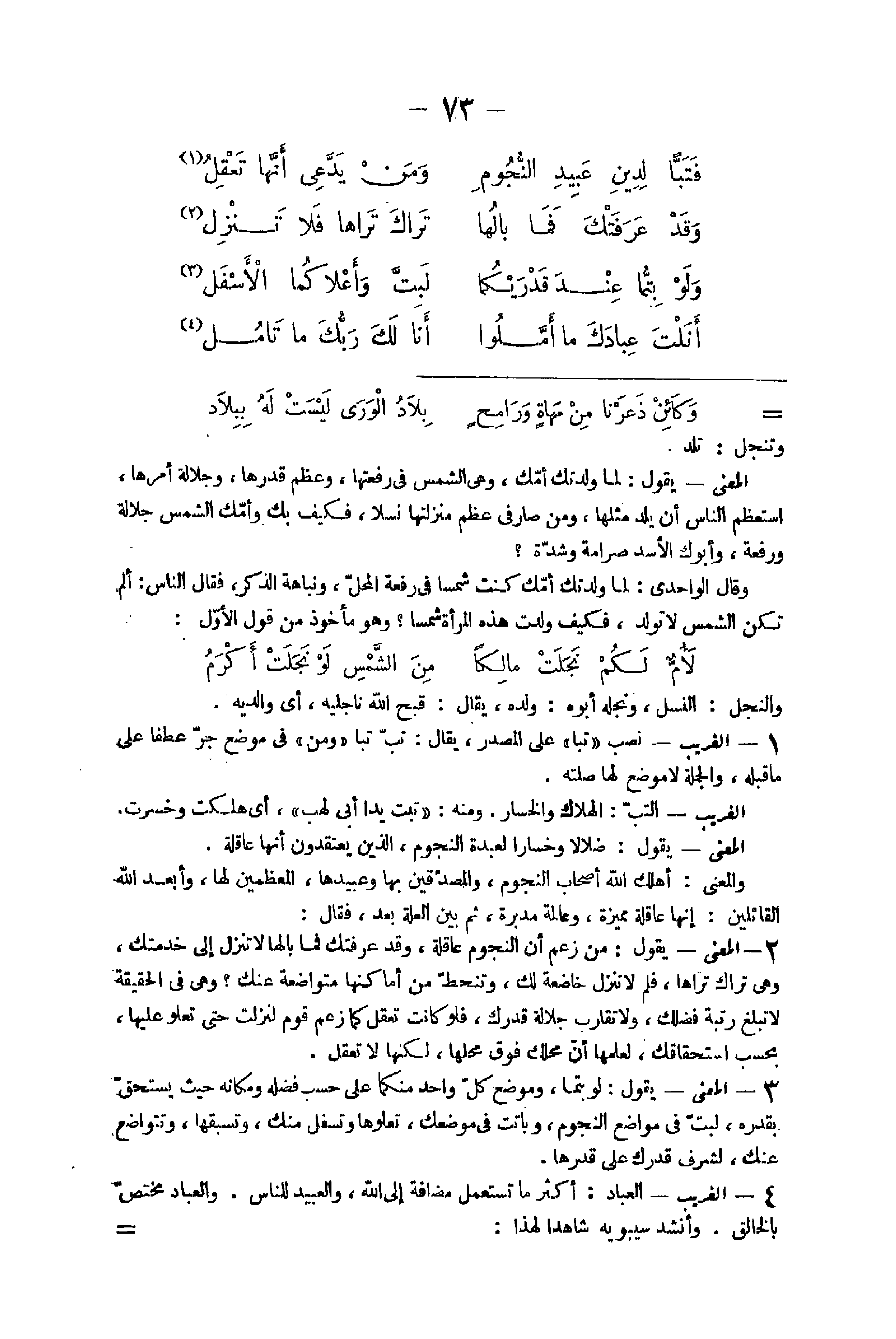 وتنجل تَلد الْمَعْنى يَقُول لما وَلدتك أمك وَهِي الشَّمْس فِي رفعتها وَعظم قدرهَا وجلالة أمرهَا استعظم النَّاس أَن يلد مثلهَا وَمن سَار فِي عظم منزلهَا نَسْلًا فَكيف بك وأمك الشَّمْس جلالة ورفعة وَأَبُوك الْأسد صرامة وَشدَّة وَقَالَ الواحدي لما وَلدتك أمك كنت شمسا فِي رفْعَة الْمحل ونباهة الذّكر فَقَالَ النَّاس ألم تكن الشَّمْس لَا تولد فَكيف ولدت هَذِه الْمَرْأَة شمسا وَهُوَ مَأْخُوذ من قَول الأول