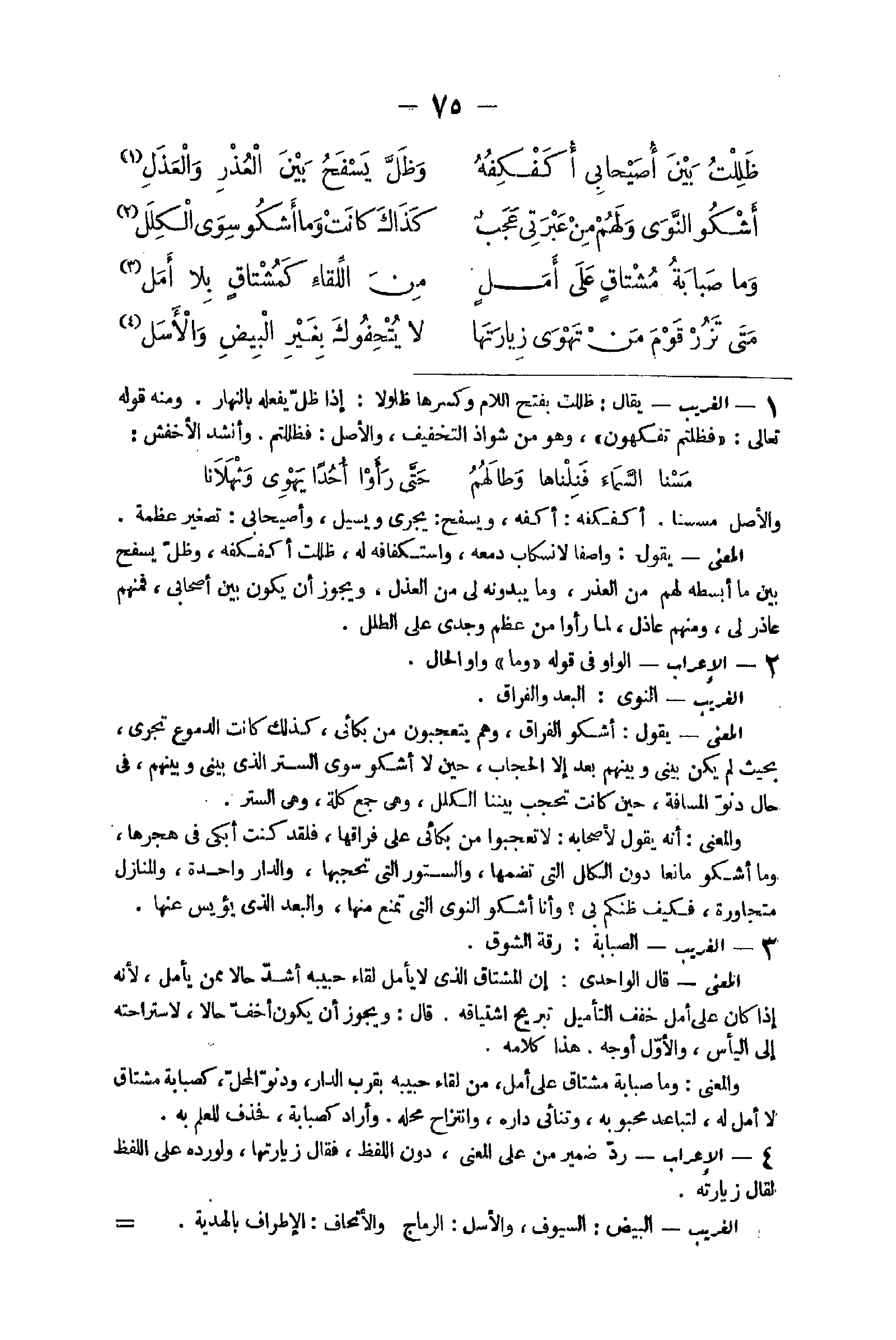 3 - الْإِعْرَاب الْوَاو فِي قَوْله وَمَا وَاو الْحَال الْغَرِيب النَّوَى الْبعد والفراق الْمَعْنى يَقُول أَشْكُو الْفِرَاق وهم يتعجبون من بُكَائِي كَذَلِك كَانَت الدُّمُوع تجْرِي بِحَيْثُ لم يكن بيني وَبينهمْ بعد إِلَّا الْحجاب حِين لَا أَشْكُو سوى السّتْر الَّذِي بيني وَبينهمْ فِي حَال دنو الْمسَافَة حِين كَانَت تحجب بَيْننَا الكلل وَهِي جمع كلة وَهِي السّتْر وَالْمعْنَى أَنه يَقُول لأَصْحَابه لَا تعجبوا من بُكَائِي على فراقها فَلَقَد كنت أبْكِي فِي هجرها وَمَا أَشْكُو مَانِعا دون الكلل الَّتِي تضمها والستور الَّتِي تحجبها وَالدَّار وَاحِدَة والمنازل متجاورة فَكيف ظنكم بِي وَأَنا أَشْكُو النَّوَى الَّتِي تمنع مِنْهَا والبعد الَّذِي يؤيس عَنْهَا