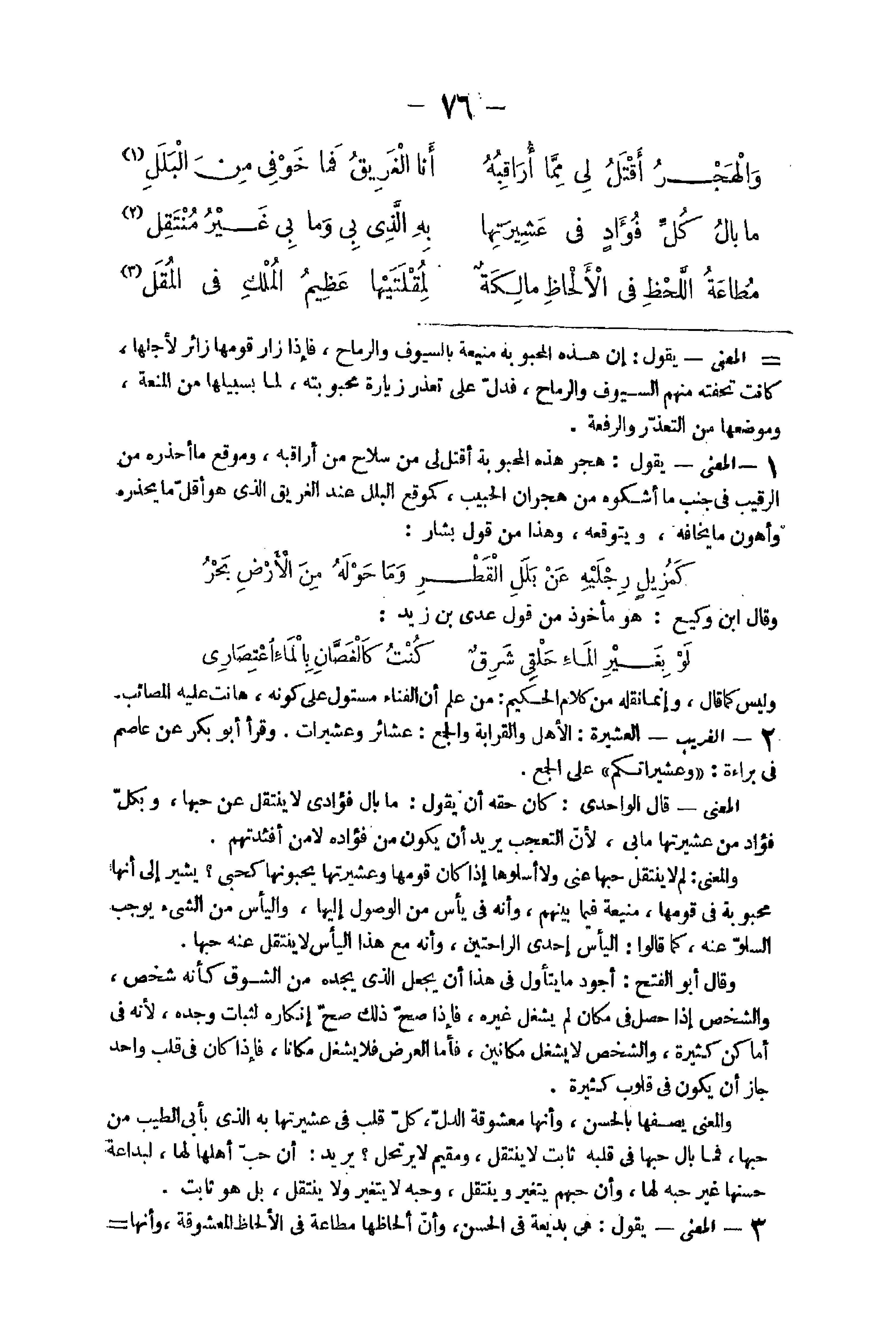 7 - الْغَرِيب الْعَشِيرَة الْأَهْل والقرابة وَالْجمع عشائر وعشيرات وَقَرَأَ أَبُو بكر عَن عَاصِم فِي بَرَاءَة {وعشيراتكم} على الْجمع الْمَعْنى قَالَ الواحدي كَانَ حَقه أَن يَقُول مَا بَال فُؤَادِي لَا ينْتَقل عَن حبها وَبِكُل فؤاد من عشيرتها مَا بِي لِأَن التَّعَجُّب يُرِيد أَن يكون من فُؤَاده لمن أفئدتهم وَالْمعْنَى لم لَا ينْتَقل حبها عني وَلَا أسلوها إِذا كَانَ قَومهَا وعشيرتها يحبونها كَحبي يُشِير إِلَى أَنَّهَا محبوبة فِي قَومهَا منيعة فِيمَا بَينهم وَأَنه فِي يأس من الْوُصُول إِلَيْهَا واليأس من الشَّيْء يُوجب السلو عَنهُ كَمَا قَالُوا الْيَأْس إِحْدَى الراحتين وَأَنه مَعَ هَذَا الْيَأْس لَا ينْتَقل عَنهُ حبها وَقَالَ أَبُو الْفَتْح أَجود مَا يتَأَوَّل فِي هَذَا أَن يَجْعَل الَّذِي يجده من الشوق كَأَنَّهُ شخص والشخص إِذا حصل فِي مَكَان لم يشغل غَيره فَإِذا صَحَّ ذَلِك صَحَّ إِنْكَاره لثبات وجده لِأَنَّهُ فِي أَمَاكِن كَثِيرَة والشخص لَا يشغل مكانين فإمَّا الْعرض فَلَا يشغل مَكَانا فَإِذا كَانَ فِي قلب وَاحِد جَازَ أَن يكون فِي قُلُوب كَثِيرَة وَالْمعْنَى يصفها بالْحسنِ وَأَنَّهَا معشوقة الدل كل قلب فِي عشيرتها بِهِ الَّذِي بِأبي الطّيب من حبها فَمَا بَال حبها فِي قلبه ثَابت ينْتَقل ومقيم لَا يرتحل يُرِيد أَن حب أَهلهَا لَهَا لبداعة حسنها غير حبه لَهَا وَأَن حبهم يتَغَيَّر وينتقل وحبه لَا يتَغَيَّر وَلَا ينْتَقل بل هُوَ ثَابت