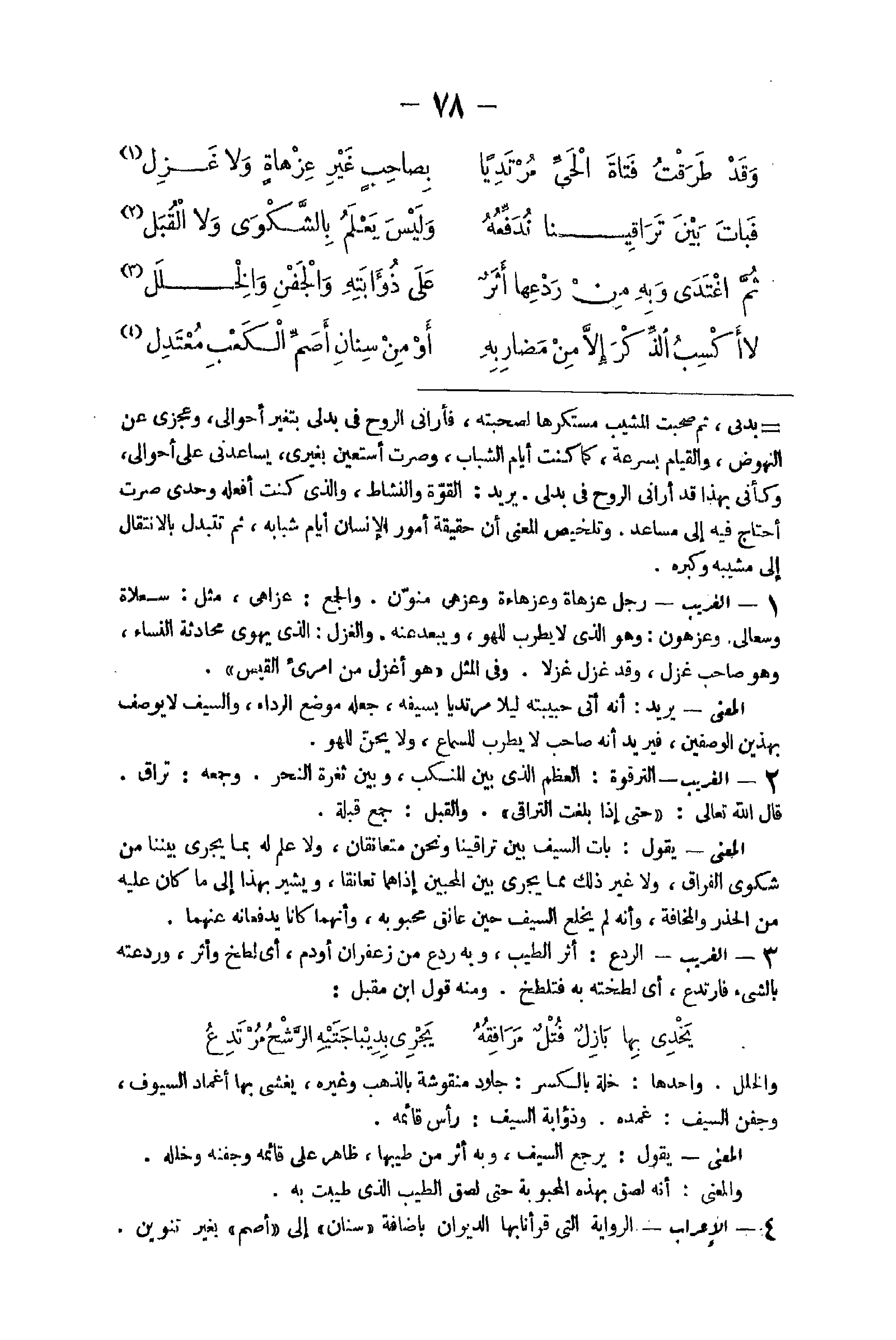 13 - الْغَرِيب الترقوة الْعظم الَّذِي بَين الْمنْكب وَبَين ثغرة النَّحْر وَجمعه تراق قَالَ الله تَعَالَى {كلا إِذا بلغت التراقي} والقبل جمع قبْلَة الْمَعْنى يَقُول بَات السَّيْف بَين تراقينا وَنحن متعانقان وَلَا علم لَهُ بِمَا يجْرِي بَيْننَا من شكوى الْفِرَاق وَلَا غير ذَلِك مِمَّا يجْرِي بَين المحبين إِذا هما تعانقا وَيُشِير بِهَذَا إِلَى مَا كَانَ عَلَيْهِ من الحذر والمخافة وَأَنه لم يخلع السَّيْف حِين عانق محبوبه وأنهما كَانَا يدفعانه عَنْهُمَا