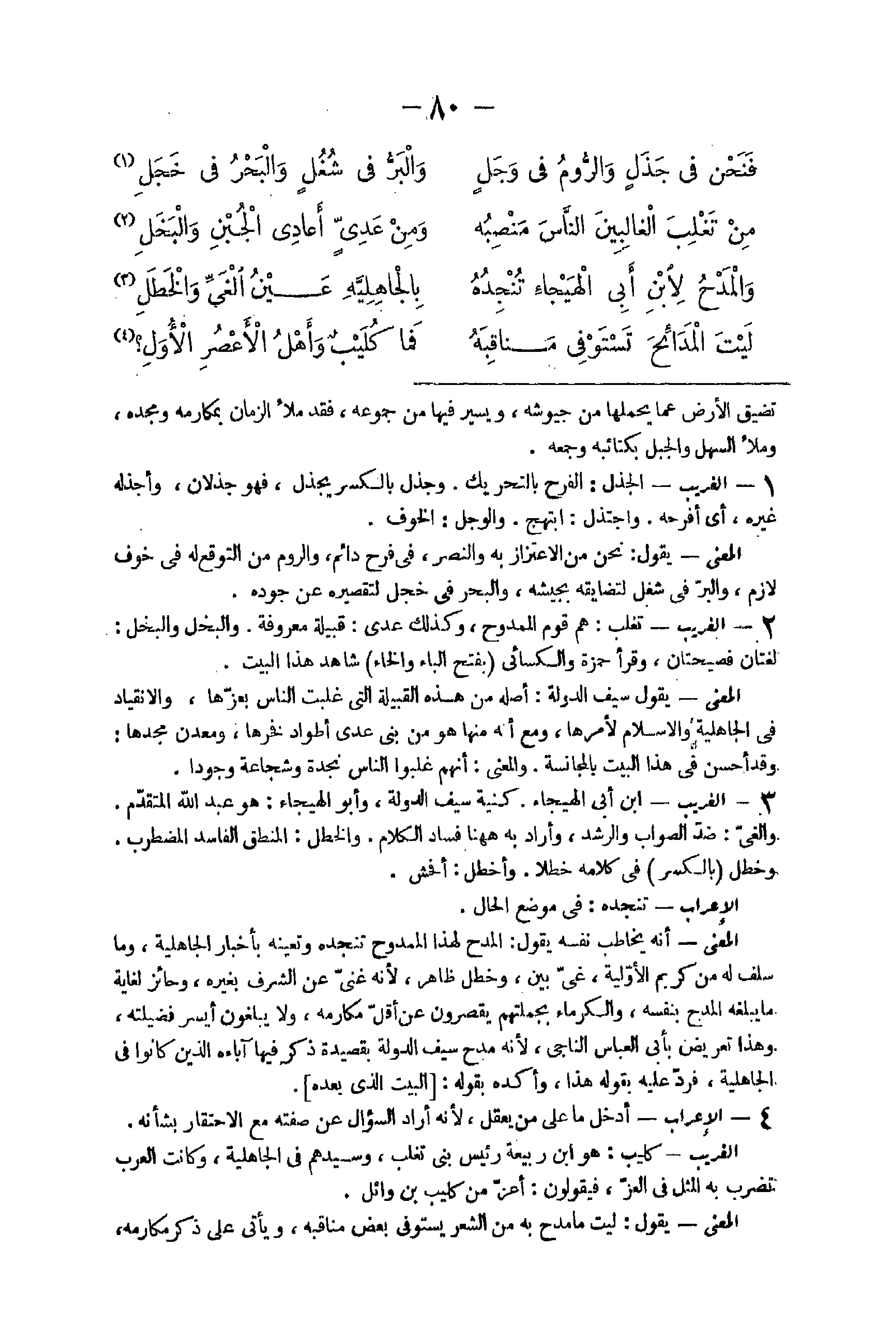 21 - الْغَرِيب تغلب هم قوم الممدوح وَكَذَلِكَ عدى قَبيلَة مَعْرُوفَة وَالْبخل وَالْبخل لُغَتَانِ فصيحتان وَقَرَأَ حَمْزَة وَالْكسَائِيّ بِفَتْح الْبَاء وَالْخَاء شَاهد هَذَا الْبَيْت الْمَعْنى يَقُول سيف الدولة أَصله من هَذِه الْقَبِيلَة الَّتِي غلبت النَّاس بعزها والانقياد فِي الْجَاهِلِيَّة وَالْإِسْلَام لأمرها وَمَعَ أَنه مِنْهَا هُوَ من بني عدي أطواد فخرها ومعدن مجدها وَقد أحسن فِي هَذَا الْبَيْت بالمجانسة وَالْمعْنَى أَنهم غلبوا النَّاس نجدة وشجاعة وجودا