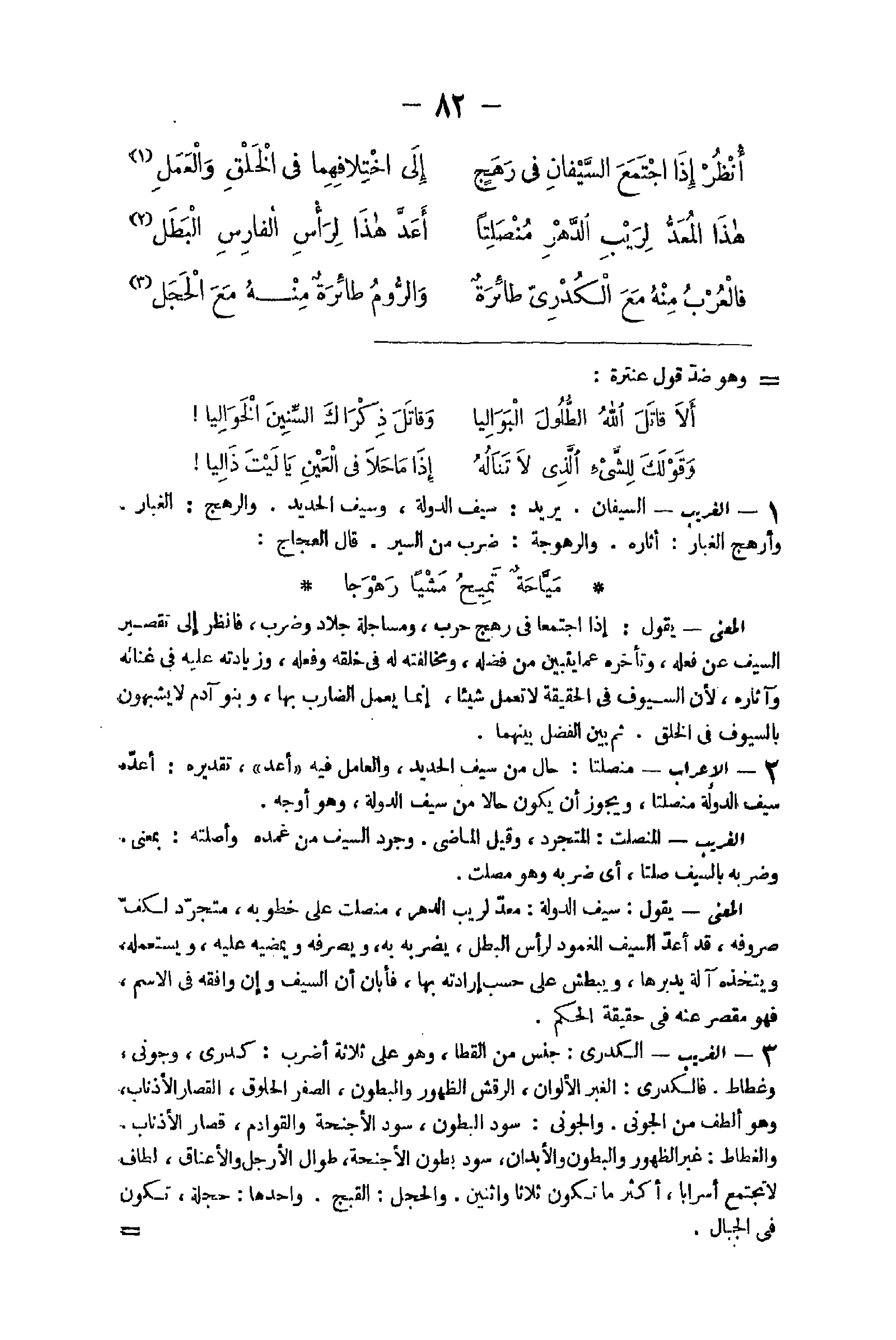 29 - الْإِعْرَاب منصلتا حَال من سيف الْحَدِيد وَالْعَامِل فِيهِ أعد تَقْدِيره أعده سيف الدولة منصلتا وَيجوز أَن يكون حَالا من سيف الدولة وَهُوَ أوجه الْغَرِيب المنصلت المتجرد وَقيل الْمَاضِي وجرد السَّيْف من غمده وأصلته بِمَعْنى وضربه بِالسَّيْفِ صَلتا أَي ضربه وَهُوَ مصلت الْمَعْنى يَقُول لسيف الدولة معد لريب الدَّهْر منصلت على خطوبه متجرد لكف صروفه قد أعد السَّيْف المغمود لرأس البطل يضْربهُ بِهِ ويصرفه ويمضيه عَلَيْهِ ويستعمله ويتخذه آلَة يدبرها وبطش على حسب إِرَادَته بهَا فأبان أَن السَّيْف وَإِن وَافقه فِي الِاسْم فَهُوَ مقصر عَنهُ فِي حَقِيقَة الحكم