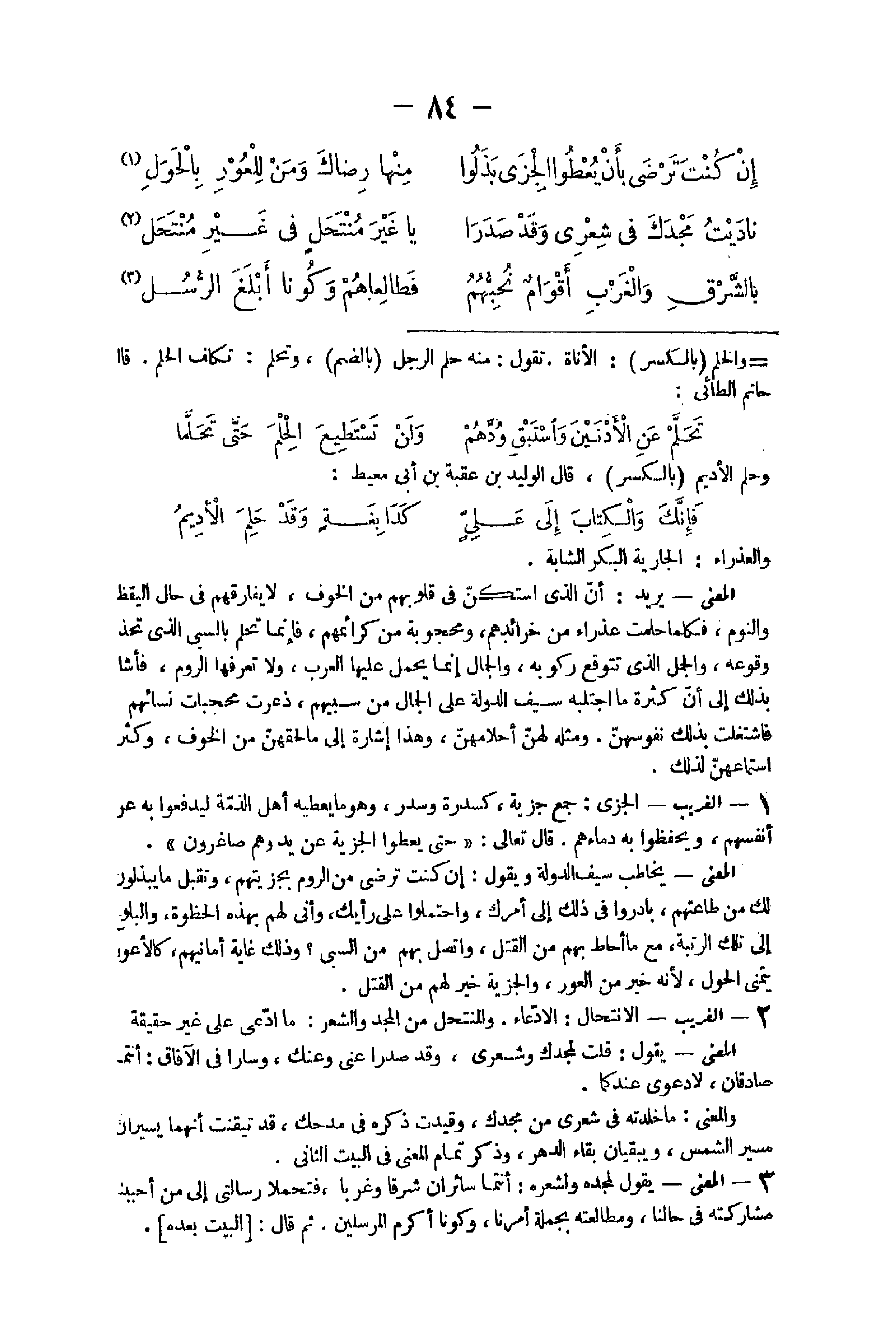 34 - الْغَرِيب الجزي جمع جِزْيَة كسدرة وَسدر وَهُوَ مَا يُعْطِيهِ أهل الذِّمَّة ليدفعوا بِهِ عَن أنفسهم ويحفظوا بِهِ دِمَاءَهُمْ قَالَ تَعَالَى {حَتَّى يُعْطوا الْجِزْيَة عَن يَد وهم صاغرون} الْمَعْنى يُخَاطب سيف الدولة وَيَقُول إِن كنت ترْضى من الرّوم بجزيتهم وَتقبل مَا يبذلون لَك من طاعتهم بَادرُوا فِي ذَلِك إِلَى أَمرك وَاحْتَملُوا على رَأْيك وَأَنِّي لَهُم بِهَذِهِ الحظوة وَالْبُلُوغ إِلَى تِلْكَ الرُّتْبَة مَعَ مَا أحَاط بهم من الْقَتْل واتصل بهم من السَّبي وَذَلِكَ غَايَة أمانيهم كالأعور يتَمَنَّى الْحول لِأَنَّهُ خير من العور والجزية خير لَهُم من الْقَتْل