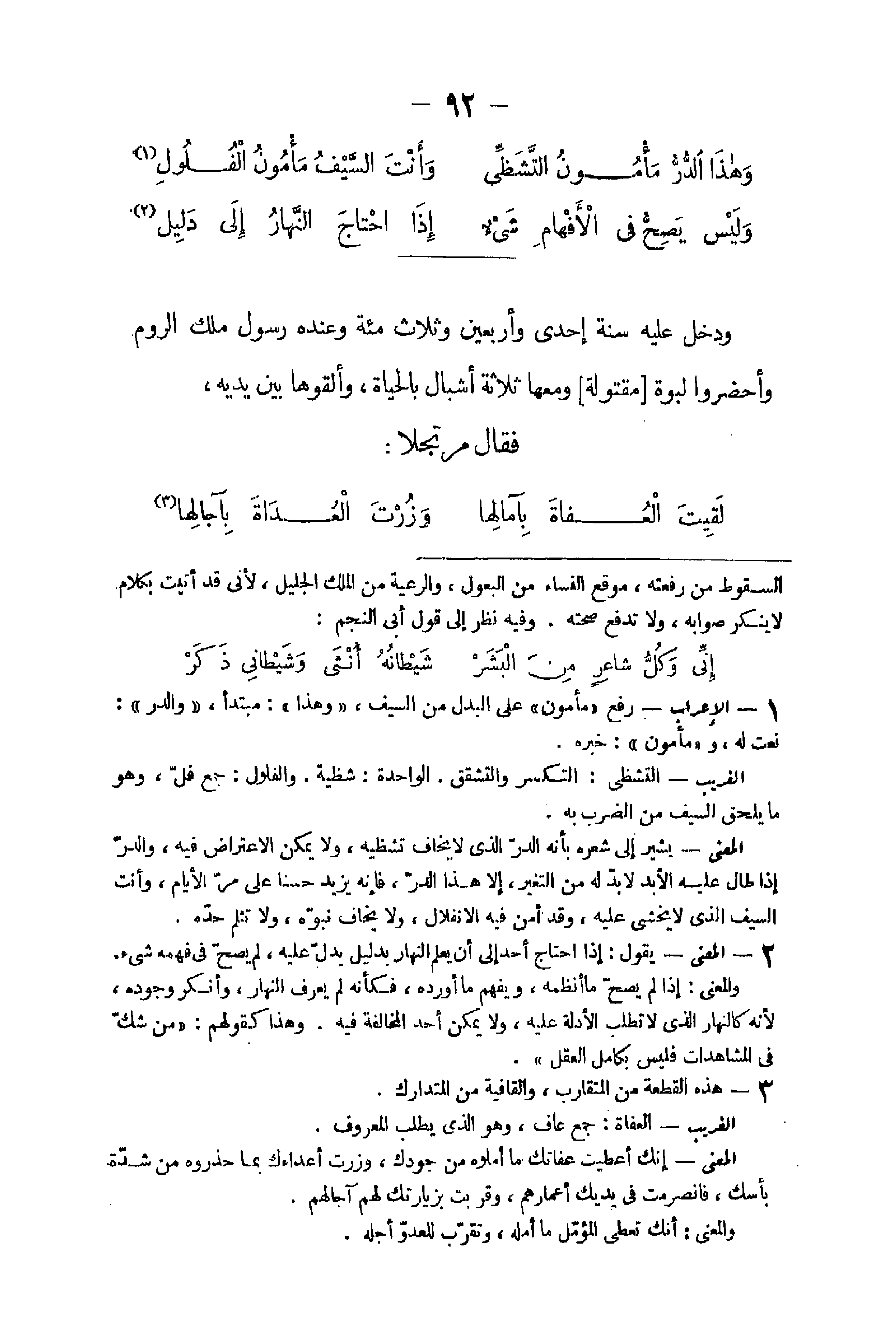 2 - الْغَرِيب الأشبال جمع شبْل وَهُوَ ولد الْأسد والليوث جمع لَيْث وَهُوَ الْأسد الْمَعْنى يَقُول وَأَقْبَلت الرّوم يُرِيد رَسُول ملك الرّوم وَمن مَعَه تمشي إِلَيْك بَين الْأسد المقتولة وأشبالها المغنومة