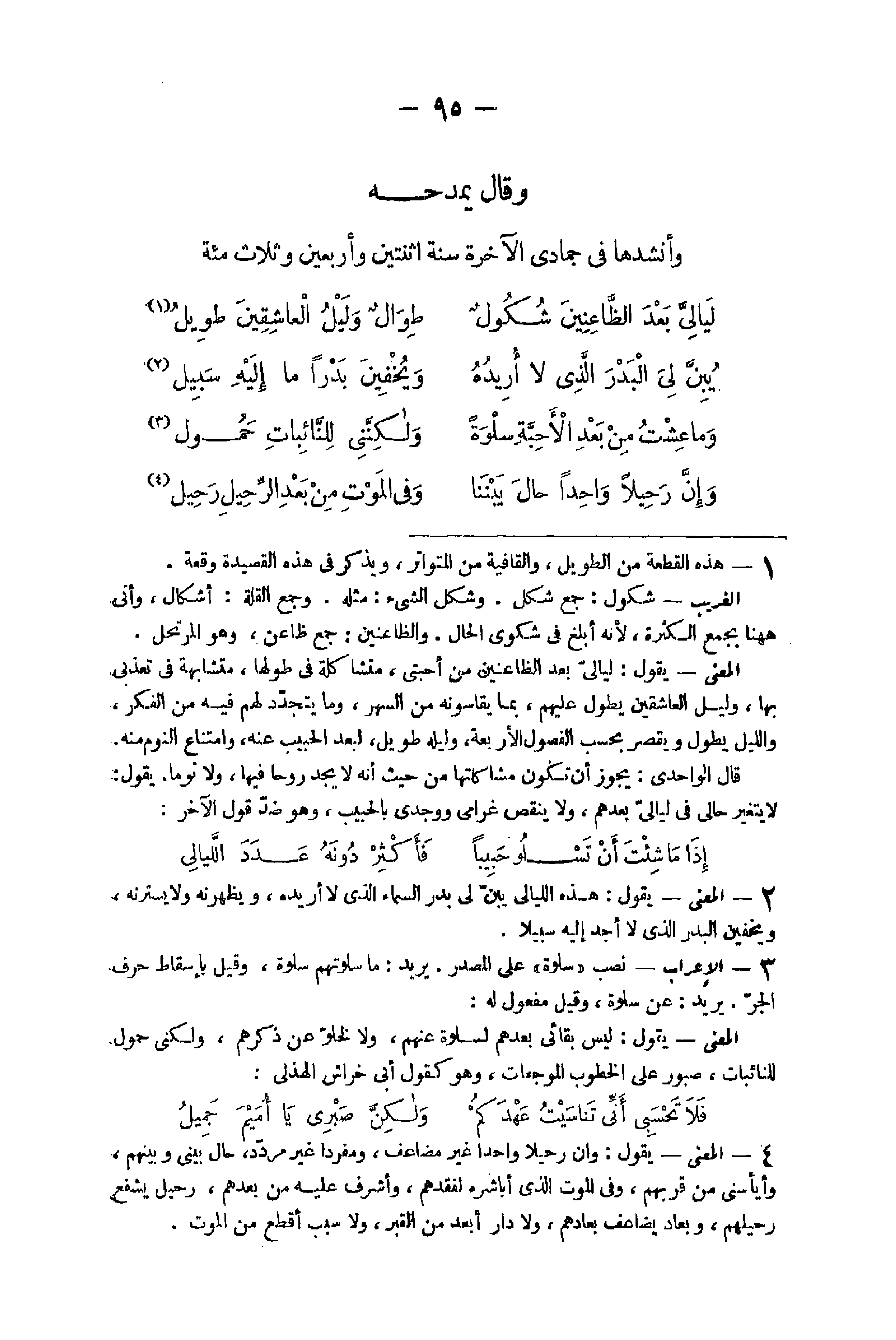 - 1 هَذِه الْقطعَة من الطَّوِيل والقافية من الْمُتَوَاتر وَيذكر فِي هَذِه القصيدة وقْعَة الْغَرِيب شكول جمع شكل وشكل الشَّيْء مثله وَجمع الْقلَّة أشكال وأتى هَاهُنَا بِجمع الْكَثْرَة لِأَنَّهُ أبلغ فِي شكوى الْحَال والظاعنين جمع ظاعن وَهُوَ المرتحل الْمَعْنى يَقُول ليَالِي بعد الظاعنين من أَحبَّنِي متشاكلة فِي طولهَا متشابهة فِي تعذبي بهَا وليل العاشقين يطول عَلَيْهِم بِمَا يقاسونه من السهر وَمَا يَتَجَدَّد لَهُم فِيهِ من الْفِكر وَاللَّيْل يطول بقصر بِحَسب الْفُصُول الْأَرْبَعَة وليله طَوِيل لبعد الحبيب عَنهُ وَامْتِنَاع النّوم مِنْهُ قَالَ الواحدي يجوز أَن تكون مشاكلتها من حَيْثُ أَنه لَا يجد رواحا فِيهَا وَلَا نوما يَقُول لَا يتَغَيَّر حَالي فِي ليَالِي بعدهمْ وَلَا ينقص غرامي ووجدي بالحبيب وَهُوَ ضد قَول الآخر