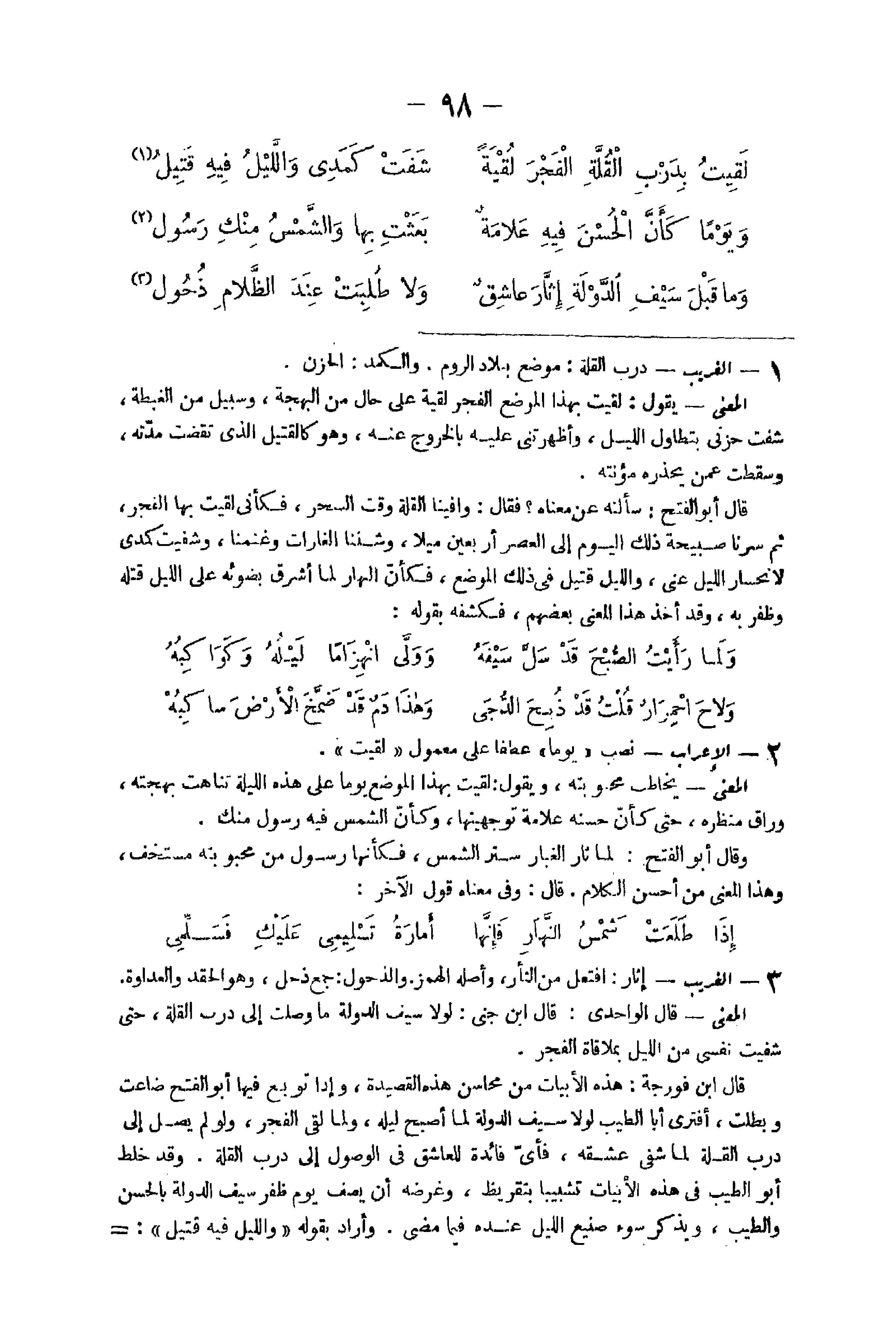 - الْغَرِيب درب الْقلَّة مَوضِع بِبِلَاد الرّوم والكمد الْحزن الْمَعْنى يَقُول لقِيت بِهَذَا الْموضع الْفجْر لقية على حَال من الْبَهْجَة وسبيل من الْغِبْطَة شفت حزني بتطاول اللَّيْل وأظهرتني عَلَيْهِ بِالْخرُوجِ عَنهُ وَهُوَ كالقتيل الَّذِي نقضت مدَّته وَسَقَطت عَمَّن يحذرهُ مُؤْنَته قَالَ أَبُو الْفَتْح سَأَلته عَن مَعْنَاهُ فَقَالَ وافينا الْقلَّة وَقت السحر فَكَأَنِّي لقِيت بهَا الْفجْر ثمَّ سرنا صَبِيحَة ذَلِك الْيَوْم إِلَى الْعَصْر أَرْبَعِينَ ميلًا وشننا الغارات وغنمنا وشفيت كمدى لانحسار اللَّيْل عني وَاللَّيْل قَتِيل فِي ذَلِك الْموضع فَكَأَن النَّهَار لما أشرق بضوئه على اللَّيْل قَتله وظفر بِهِ وَقد أَخذ هَذَا الْمَعْنى بَعضهم فكشفه بقوله