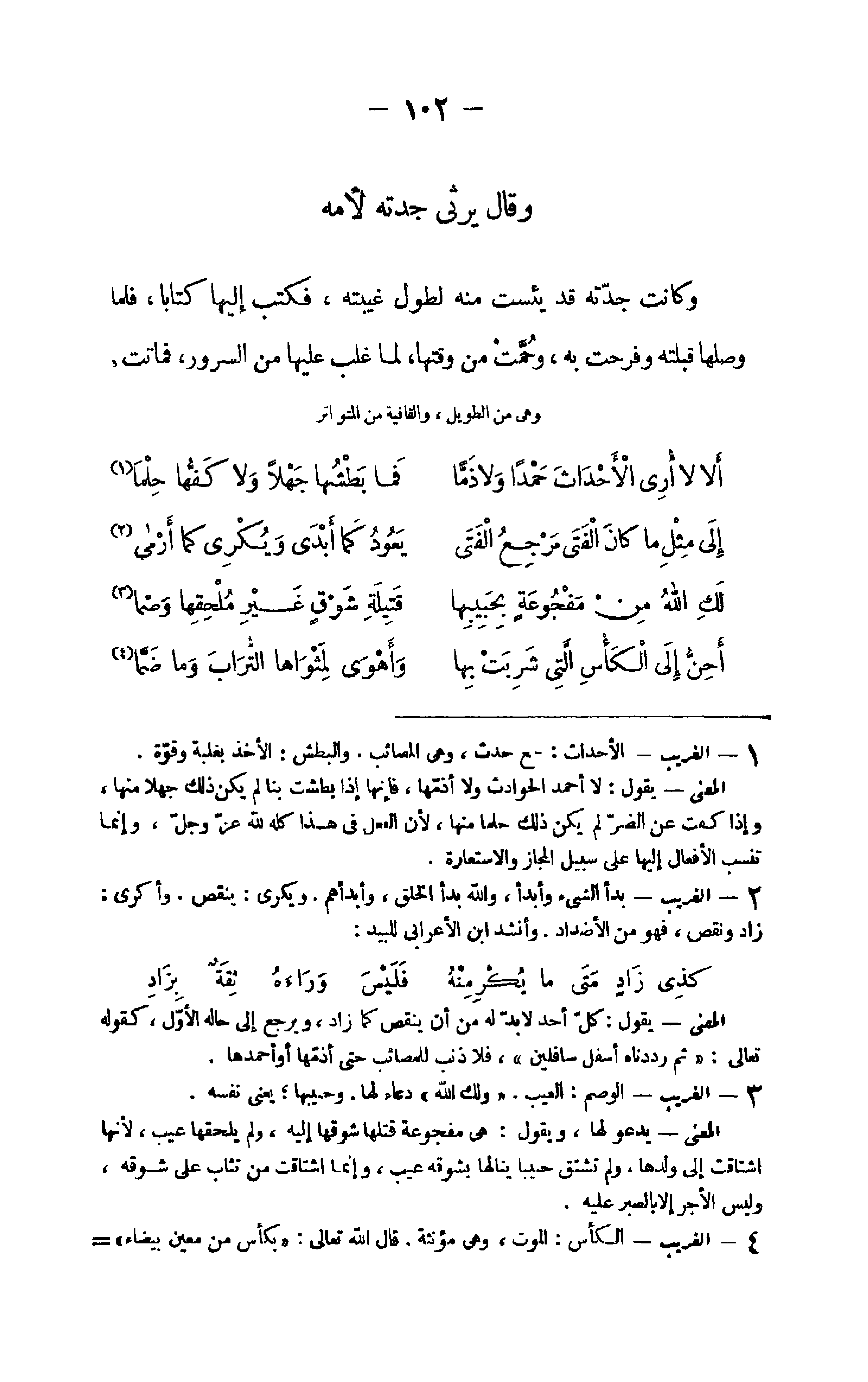 3 - الْغَرِيب الوصم الْعَيْب وَلَك الله دُعَاء لَهَا وحبيبها يَعْنِي نَفسه الْمَعْنى يَدْعُو لَهَا وَيَقُول هِيَ مفجوعة قلتهَا شوقها إِلَيْهِ وَلم يلْحقهَا عيب لِأَنَّهَا اشتاقت إِلَى وَلَدهَا وَلم تشتق حبيبا ينالها بشوقه عيب وَإِنَّمَا اشتاقت من تئاب على شوقه وَلَيْسَ الْأجر إِلَّا بِالصبرِ عَلَيْهِ
