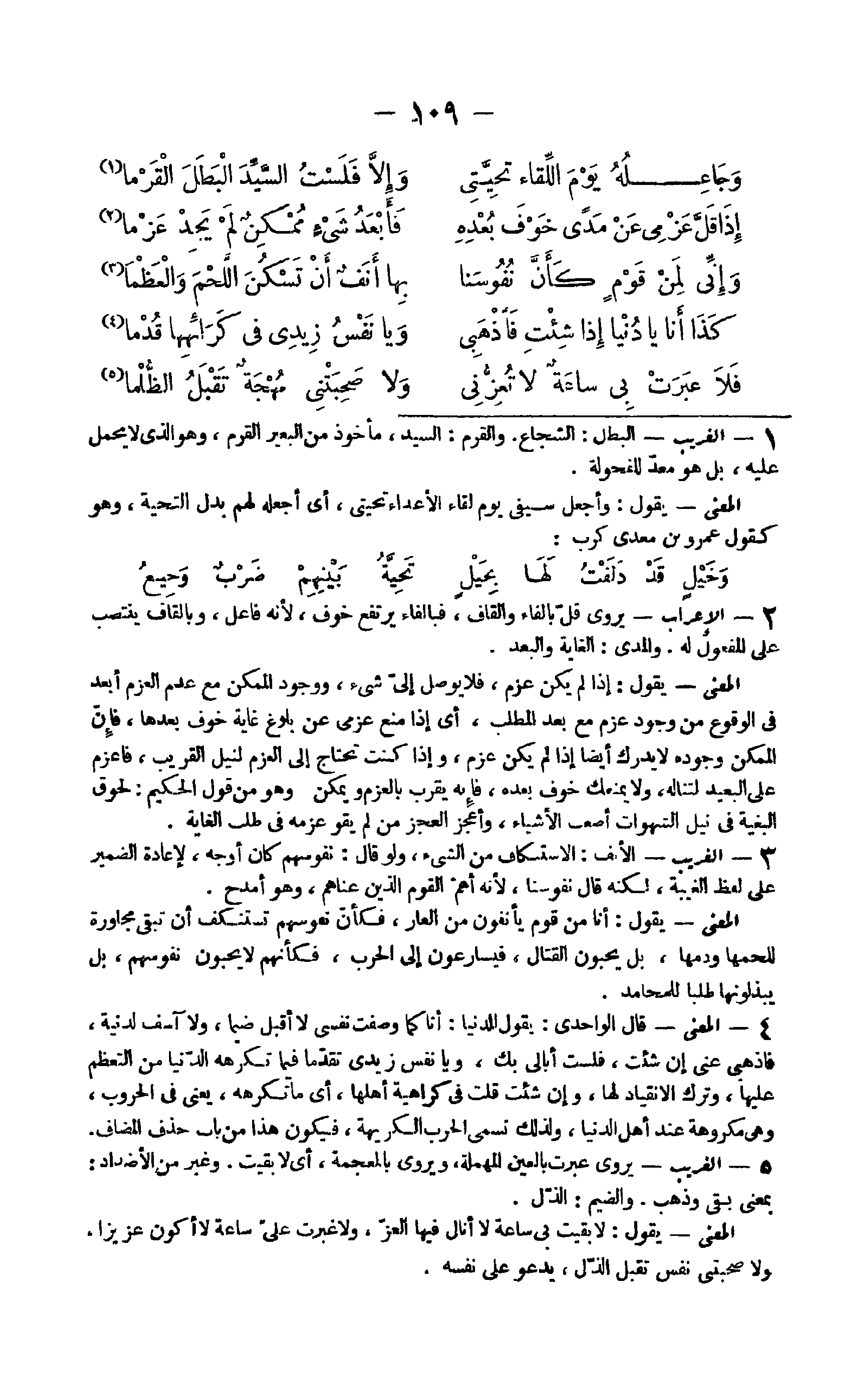 34 - الْغَرِيب يرْوى عبرت بِالْعينِ الْمُهْملَة ويروى بِالْمُعْجَمَةِ أَي لَا بقيت وغبر من الأضداد بِمَعْنى بَقِي وَذهب والضيم الذل الْمَعْنى يَقُول لَا بقيت بِي سَاعَة لَا أنال فِيهَا الْعِزّ وَلَا غبرت على سَاعَة لَا أكون