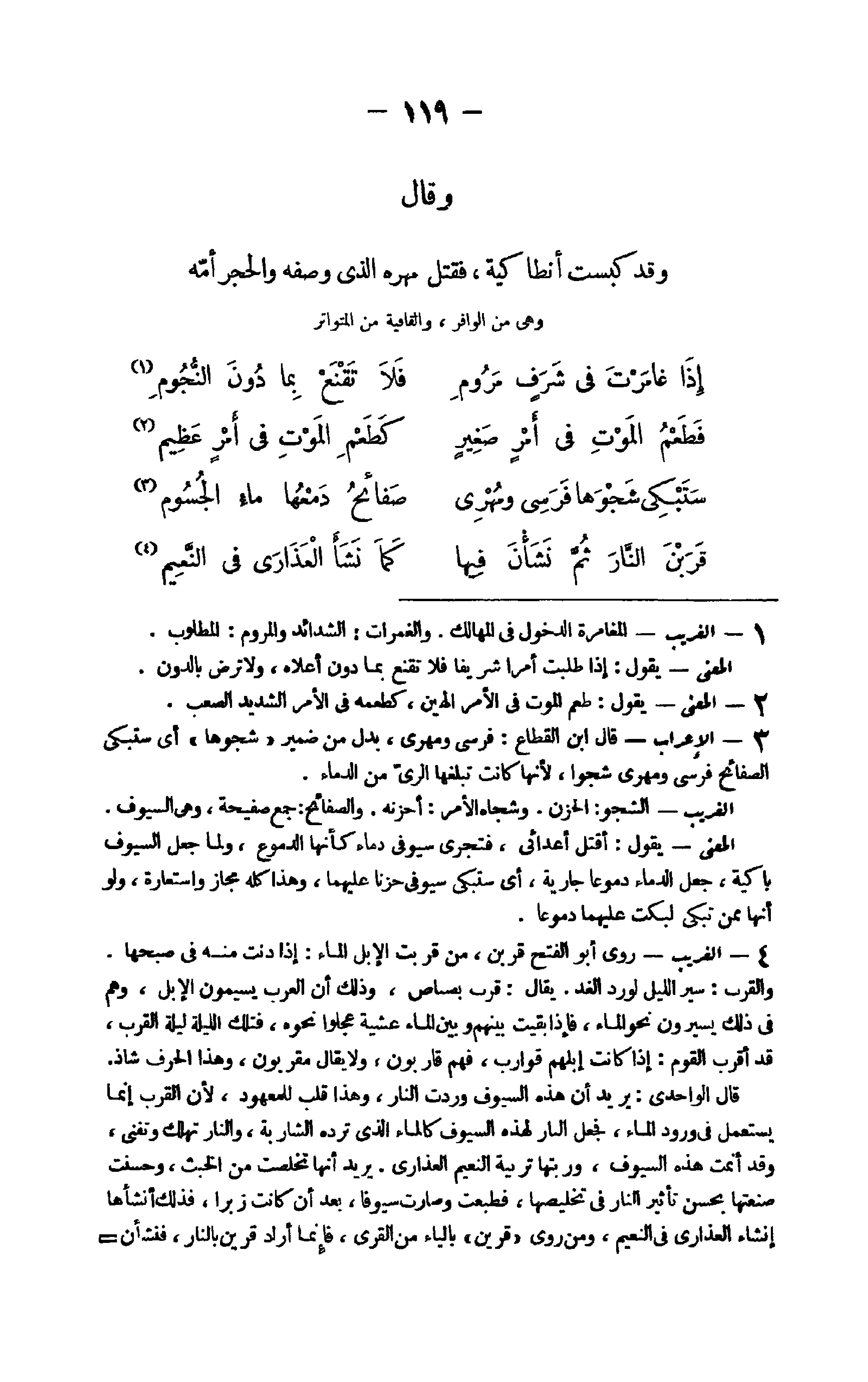 4 - الْغَرِيب روى أَبُو الْفَتْح قرين من قربت الْإِبِل المَاء إِذا دنت مِنْهُ فِي صبحها والقرب سير اللَّيْل لورد الْغَد يُقَال قرب بصباص وَذَلِكَ أَن الْعَرَب يسيمون الْإِبِل وهم فِي ذَلِك يَسِيرُونَ نَحْو المَاء فَإِذا بقيت بَينهم وَبَين المَاء عَشِيَّة عجلوا نَحوه فَتلك اللَّيْلَة لَيْلَة الْقرب قد أقرب الْقَوْم إِذا كَانَت إبلهم قوارب فهم قاربون وَلَا يُقَال مقربون وَهَذَا الْحَرْف شَاذ قَالَ الواحدي يُرِيد أَن هَذِه السيوف وَردت النَّار وَهَذَا قلب للمعهود لِأَن الْقرب إِنَّمَا يسْتَعْمل فِي وُرُود المَاء فَجعل النَّار لهَذِهِ السيوف كَالْمَاءِ الَّذِي ترده الشاربة وَالنَّار تهْلك وتفنى وَقد أنمت هَذِه السيوف وريتها تربية النَّعيم العذارى يُرِيد أَنَّهَا تخلصت من الْخبث وَحسنت صنعتها بِحسن تَأْثِير النَّار فِي تَخْلِيصهَا فطبعت وَصَارَت سيوفا بعد أَن كَانَت زبرا فَذَلِك أَنْشَأَهَا إنْشَاء العذارى فِي النَّعيم وَمن روى قرين بِالْيَاءِ من الْقرى فَإِنَّمَا أَرَادَ قرين بالنَّار فنشأن يحسن الْقرى وَقَالَ جعل السيوف