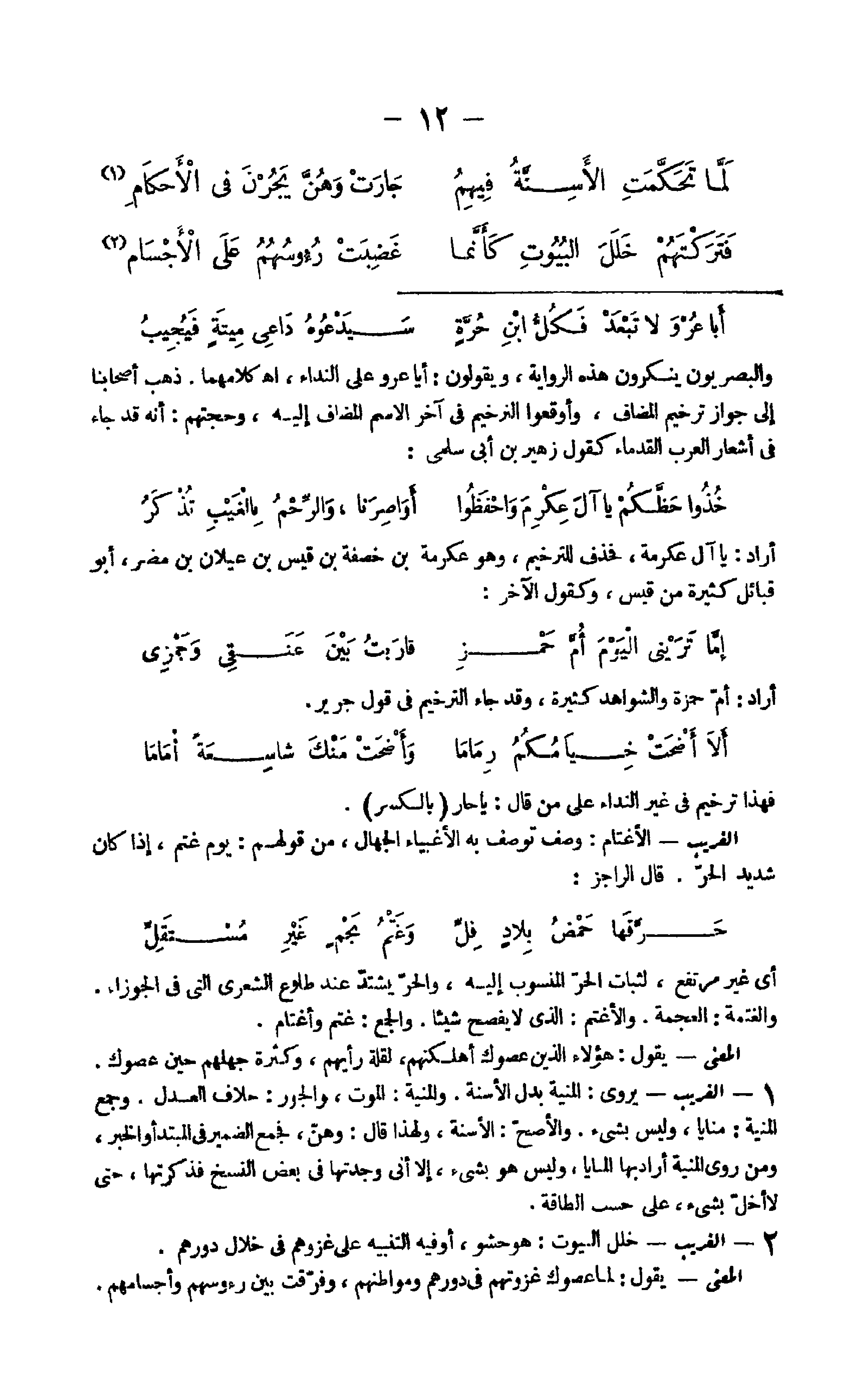 (أَلا أضْحَتْ خِيامُكُمُ رِماما ... وَأضْحَتْ منْكَ شاسعَةً أُماما) فَهَذَا ترخيم فِي غير النداء على من قَالَ يَا حَار بِالْكَسْرِ الْغَرِيب الأغتام وصف توصيف بِهِ الأغبياء الْجُهَّال من قَوْلهم يَوْم غتم إِذا كَانَ شَدِيد الحرّ قَالَ الراجز