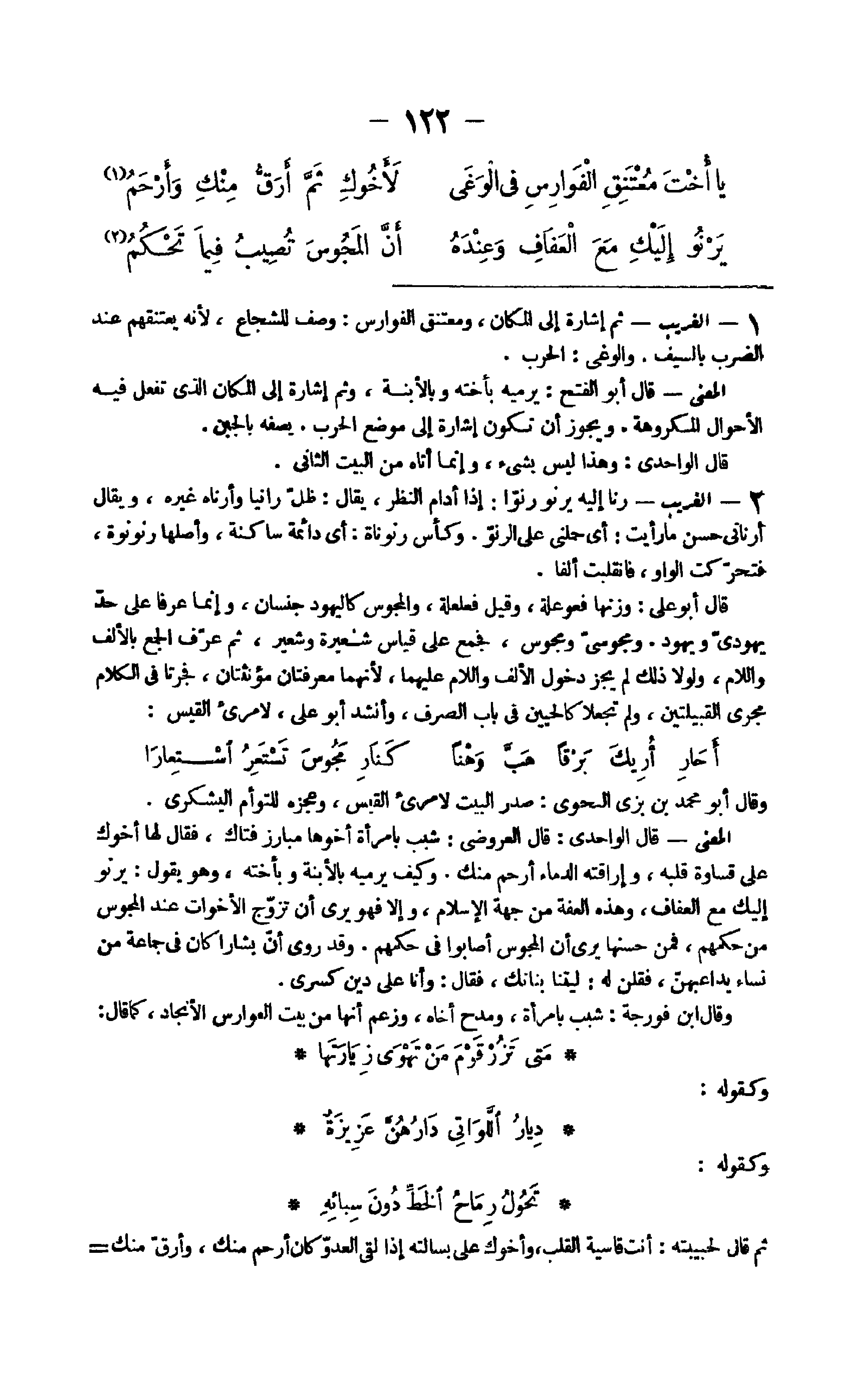وَقَالَ أَبُو مُحَمَّد بن بزِي النَّحْوِيّ صدر الْبَيْت لامرىء الْقَيْس وعجزه للتوأم الْيَشْكُرِي الْمَعْنى قَالَ الواحدي قَالَ الْعَرُوضِي شَبَّبَ بِامْرَأَة أَخُوهَا مبارز فتاك فَقَالَ لَهَا أَخُوك على قساوة قلبه وإراقته الدِّمَاء أرْحم مِنْك وَكَيف يرميه بالابنة وبأخته وَهُوَ يَقُول يرنو إِلَيْك مَعَ العفاف وَهَذِه الْعِفَّة من جِهَة الْإِسْلَام وَإِلَّا فَهُوَ يرى أَن تزوج الْأَخَوَات عِنْد الْمَجُوس من حكمهم فَمن حسنها يرى أَن الْمَجُوس أَصَابُوا فِي حكمهم وَقد روى أَن بشارا كَانَ فِي جمَاعَة من نسَاء يداعبهن فَقُلْنَ لَهُ ليتنا بناتك فَقَالَ وَأَنا على دين كسْرَى وَقَالَ ابْن فورجة شَبَّبَ بِامْرَأَة ومدح أَخَاهُ وَزعم أَنَّهَا من بَيت الفوارس الأنجاد كَمَا قَالَ