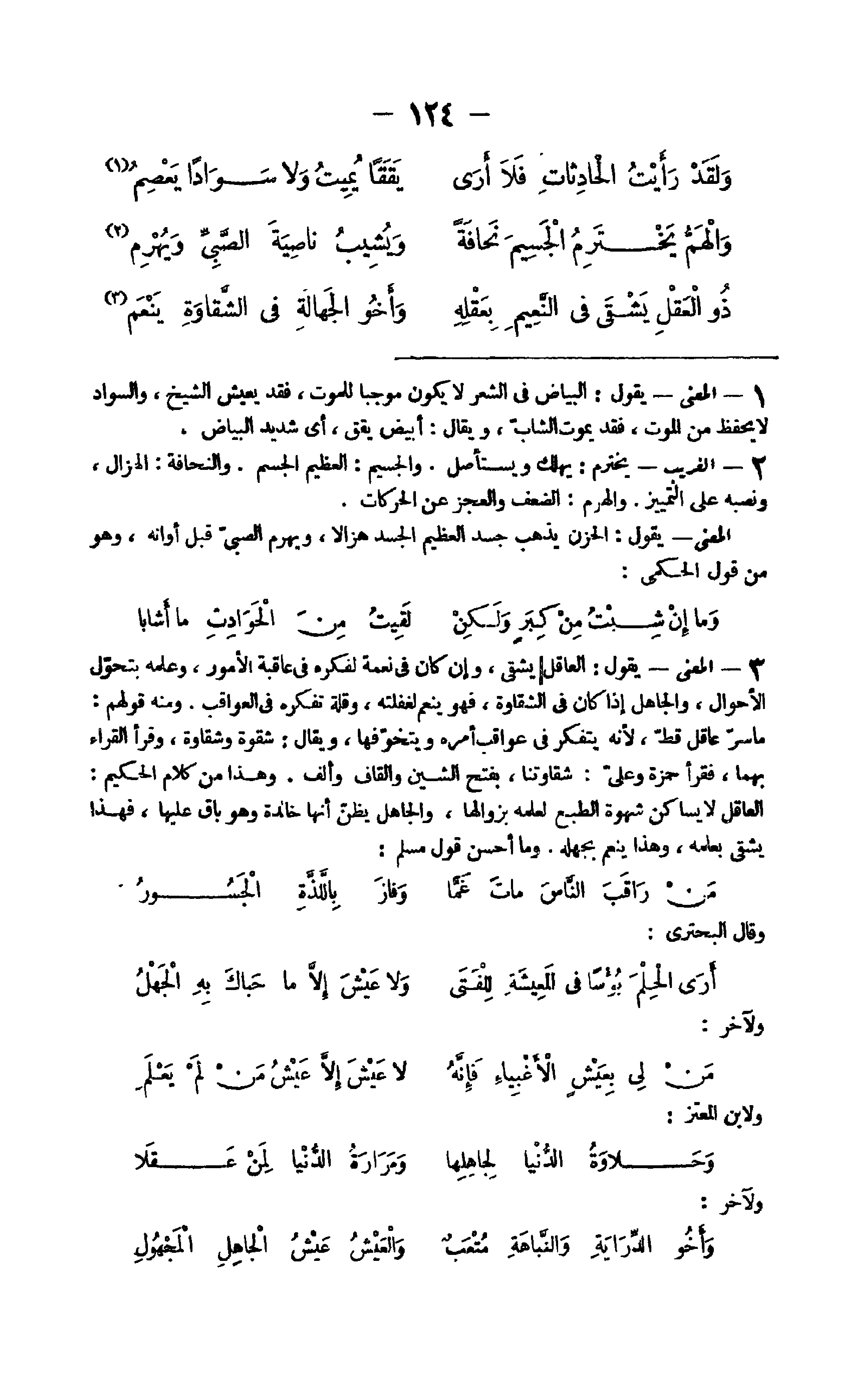8 - الْمَعْنى يَقُول الْعَاقِل يشقى وَإِن كَانَ فِي نعْمَة لفكره فِي عَاقِبَة الْأُمُور وَعلمه بتحول الْأَحْوَال وَالْجَاهِل إِذا كَانَ فِي الشقاوة فَهُوَ ينعم لِغَفْلَتِه وَقلة تفكره فِي العواقب وَمِنْه قَوْلهم مَا سر عَاقل قطّ لِأَنَّهُ يتفكر فِي عواقب أمره ويتخوفها وَيُقَال شفوة وشقاوة وَقَرَأَ الْقُرَّاء بهما فَقَرَأَ حَمْزَة وعَلى شقاوتنا بِفَتْح الشين وَالْقَاف وَألف وَهَذَا من كَلَام الْحَكِيم الْعَاقِل لَا يساكن شَهْوَة الطَّبْع لعلمه بزوالها وَالْجَاهِل يظنّ أَنَّهَا خالدة وَهُوَ بَاقٍ عَلَيْهَا فَهَذَا يشقى بِعِلْمِهِ وَهَذَا ينعم بجهله وَمَا أحسن قَول مُسلم