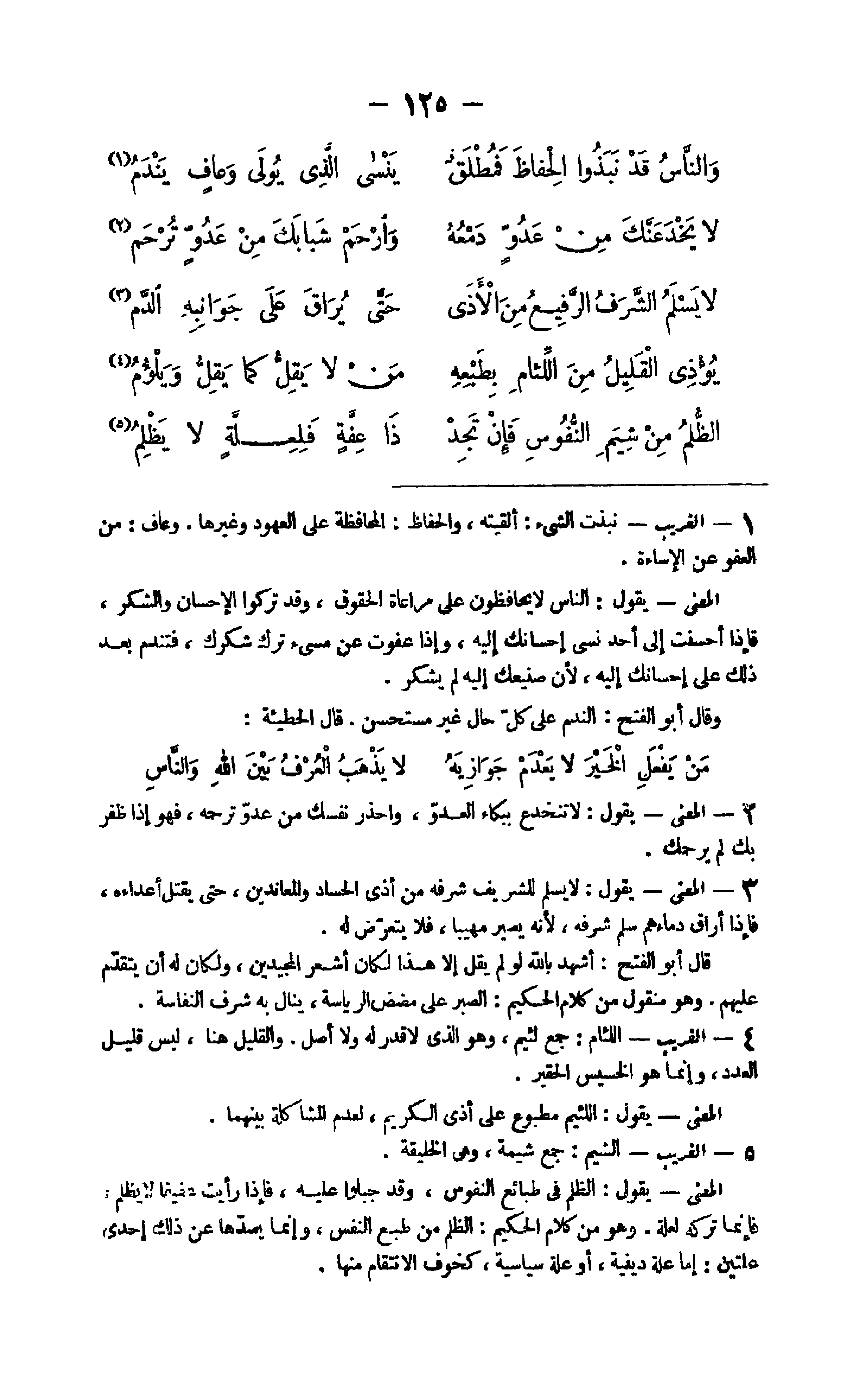 13 - الْغَرِيب الشيم جمع شِيمَة وَهِي الخليقة الْمَعْنى يَقُول الظُّلم فِي طبائع النُّفُوس وَقد جبلوا عَلَيْهِ فَإِذا رَأَيْت عفيفا لَا يظلم فَإِنَّمَا تَركه لعِلَّة وَهُوَ من كَلَام الْحَكِيم الظُّلم من طبع النَّفس وَإِنَّمَا يصدها عَن ذَلِك إِحْدَى علتين إِمَّا عِلّة دينية أَو عِلّة سياسية كخوف الانتقام مِنْهَا