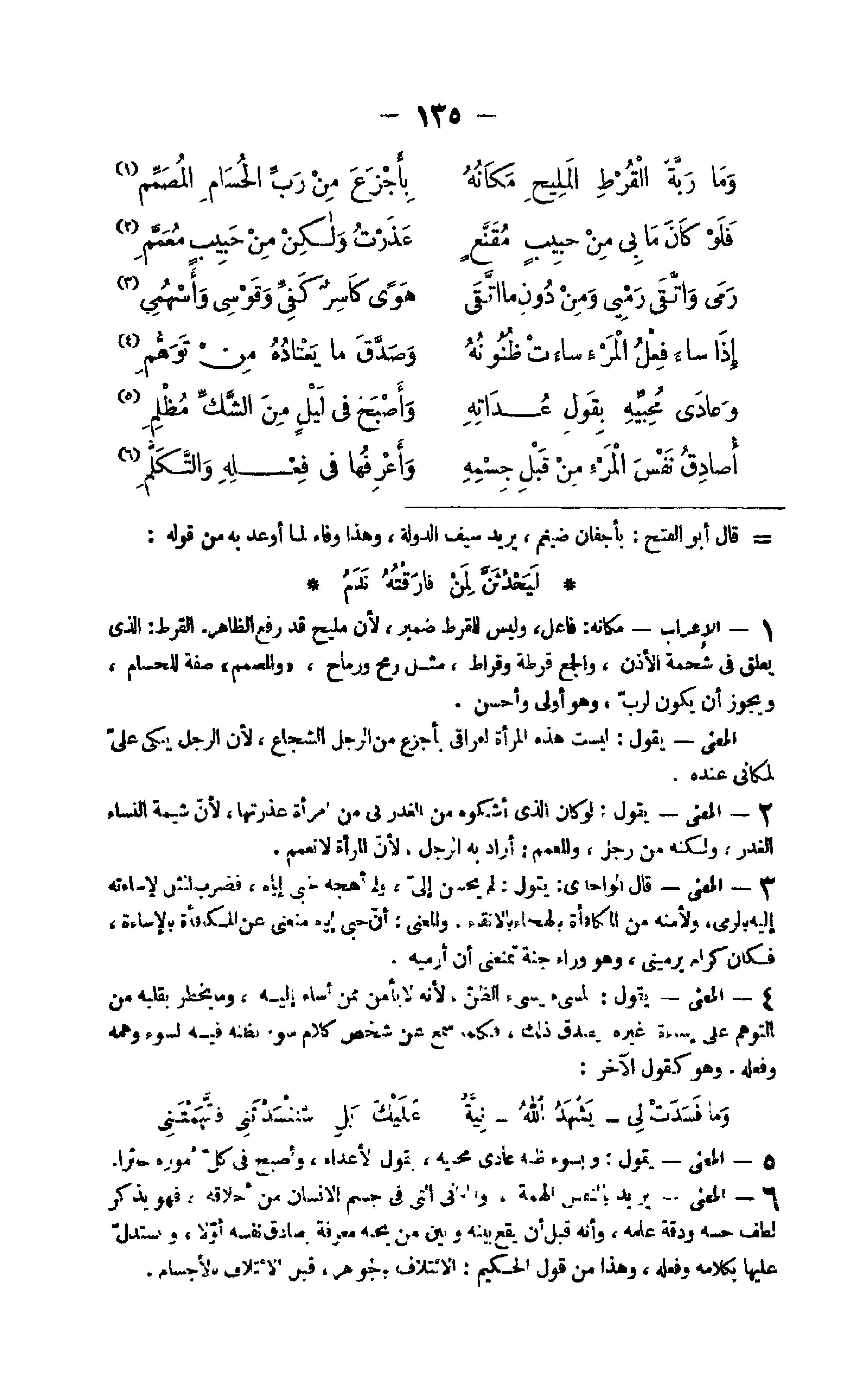 5 - الْإِعْرَاب مَكَانَهُ فَاعل وَلَيْسَ للقرط ضمير لِأَن مليح قد رفع الظَّاهِر القرط الَّذِي يعلق فِي شحمة الْأذن وَالْجمع قرطة وقراط مثل رمح ورماح والمصمم صفة للحسام وَيجوز أَن يكون لرب وَهُوَ أولى وَأحسن الْمَعْنى يَقُول لَيست هَذِه الْمَرْأَة لفراقي بأجزع من الرجل الشجاع لِأَن الرجل يبكي عَليّ لمكاني عِنْده