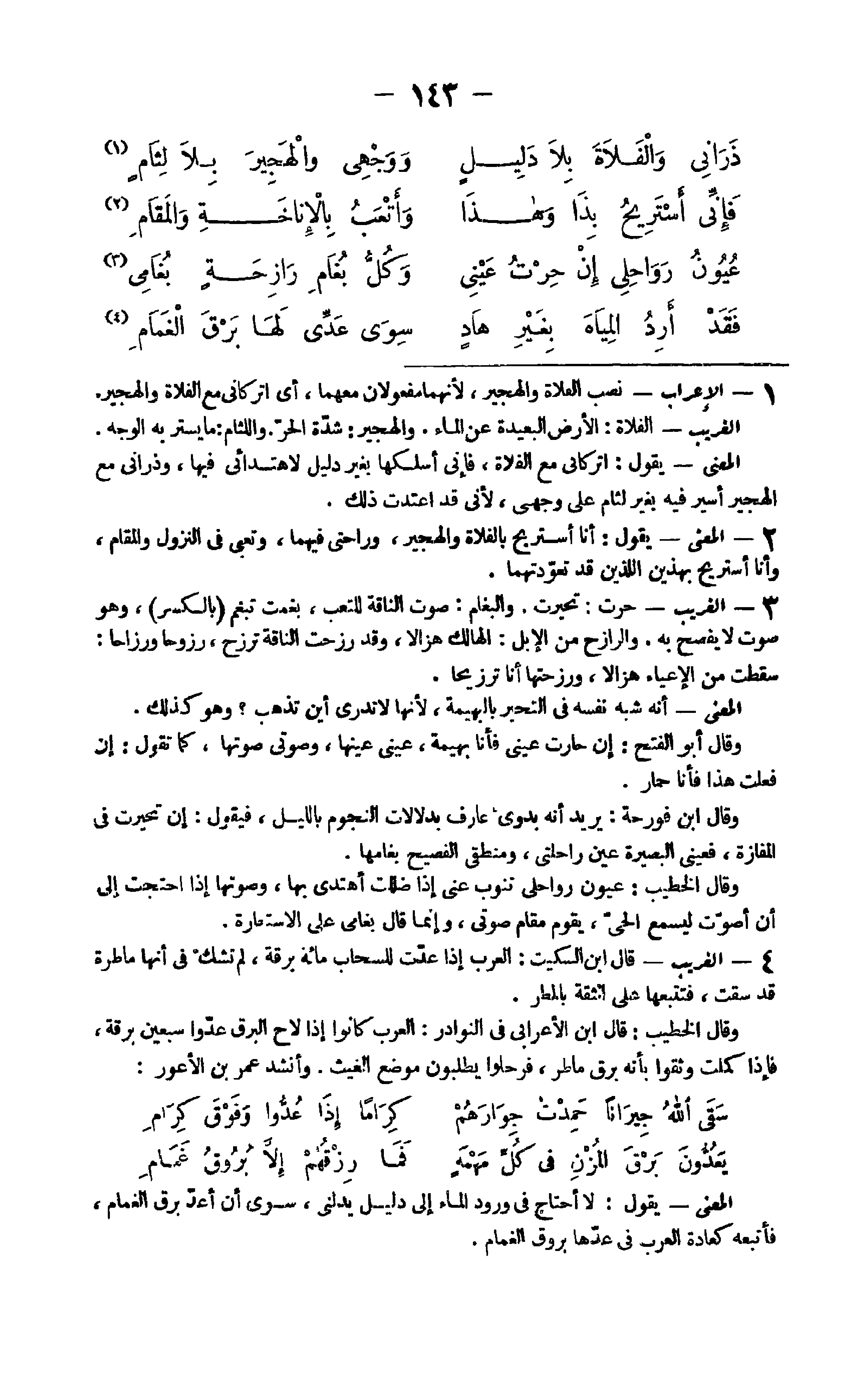 - الْإِعْرَاب نصب الفلاة والهجير لِأَنَّهُمَا مفعولان مَعَهُمَا أَي اتركاني مَعَ الفلاة والهجير الْغَرِيب الفلاة الأَرْض الْبَعِيدَة عَن المَاء والهجير شدَّة الْحر واللثام مَا يستر بِهِ الْوَجْه الْمَعْنى يَقُول اتركاني مَعَ الفلاة فَإِنِّي أسلكها بِغَيْر دَلِيل لاهتدائي فِيهَا وذراني مَعَ الهجير أَسِير فِيهِ بِغَيْر لثام على وَجْهي لِأَنِّي قد اعْتدت ذَلِك