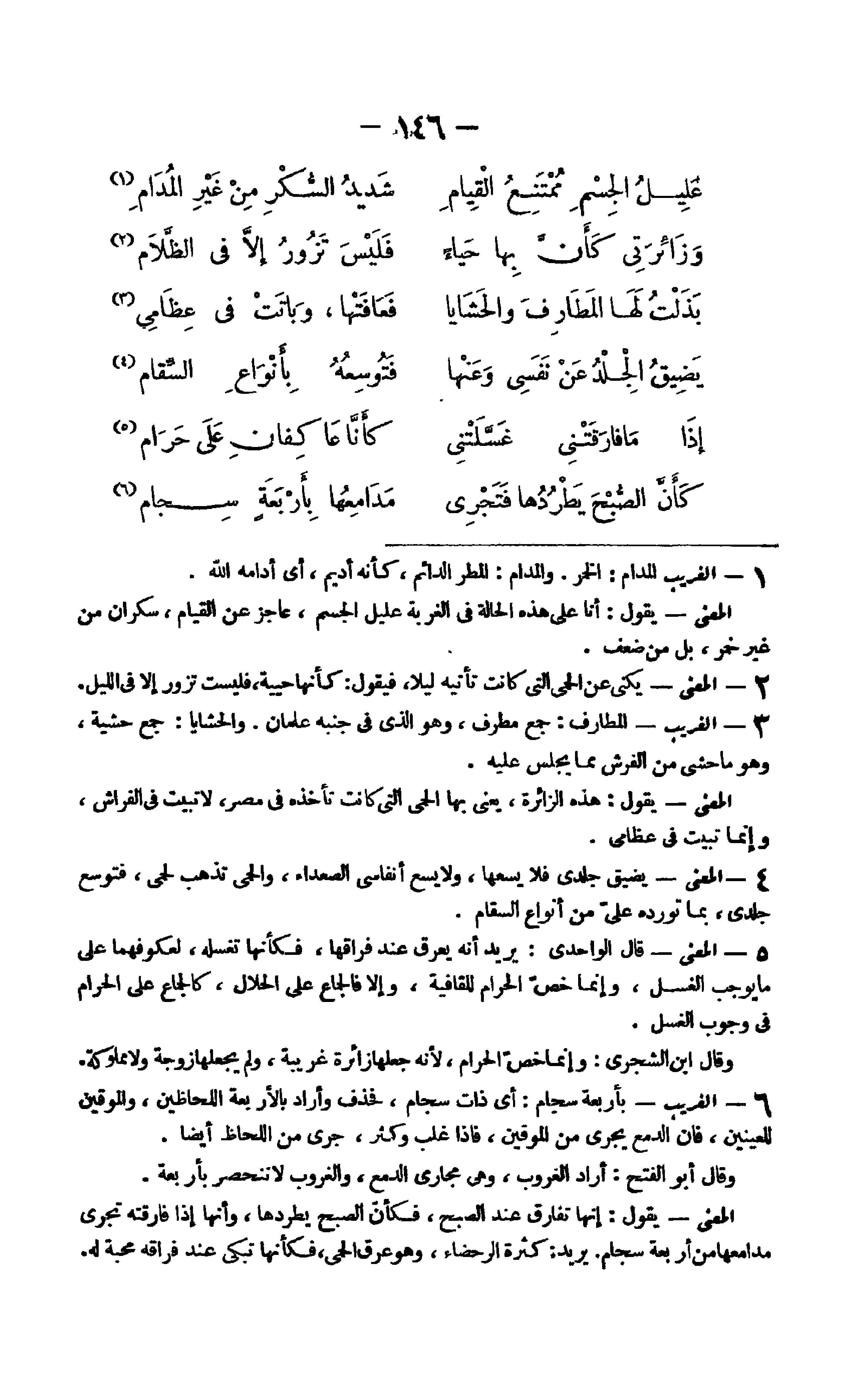 25 - الْغَرِيب بأَرْبعَة سجام أَي ذَات سجام فَحذف وَأَرَادَ بالأربعة اللحاظين والموقين للعينين فَإِن الدمع يجْرِي من الموقين فَإِذا غلب وكتر جرى من اللحاظ أَيْضا وَقَالَ أَبُو الْفَتْح أَرَادَ الْغُرُوب وَهِي مجارى الدمع والغروب لَا تَنْحَصِر بأَرْبعَة الْمَعْنى يَقُول إِنَّهَا تفارق عِنْد الصُّبْح فَكَأَن الصُّبْح يطردها وَأَنَّهَا إِذا فارقته تجْرِي مدامعها من أَرْبَعَة سجام يُرِيد كَثْرَة الرحضاء وَهُوَ عرق الْحمى فَكَأَنَّهَا تبْكي عِنْد فِرَاقه محبَّة لَهُ