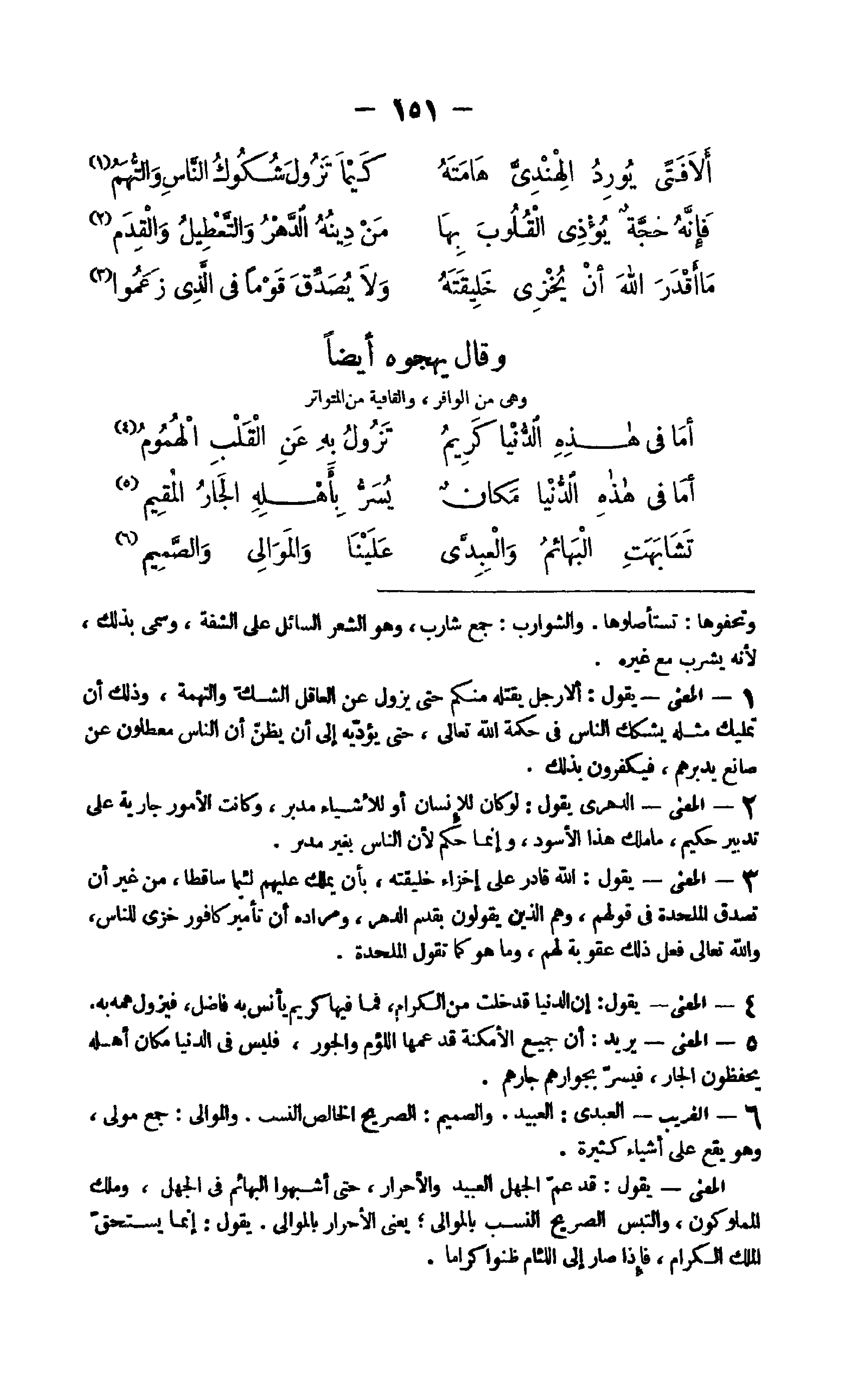 3 - الْغَرِيب الْعَبْدي العبيد والصميم الصَّرِيح الْخَالِص النّسَب والموالي جمع مولى وَهُوَ يَقع على أَشْيَاء كَثِيرَة الْمَعْنى يَقُول قد عَم الْجَهْل الْعِيد والأحرار حَتَّى أشبهوا الْبَهَائِم فِي الْجَهْل وَملك المملوكون والتبس الصَّرِيح النّسَب بِالْمَوَالِي يَعْنِي الأحرارا بِالْمَوَالِي يَقُول إِنَّمَا يسْتَحق الْملك الْكِرَام فَإِذا صَار إِلَى اللئام ظنُّوا كراما