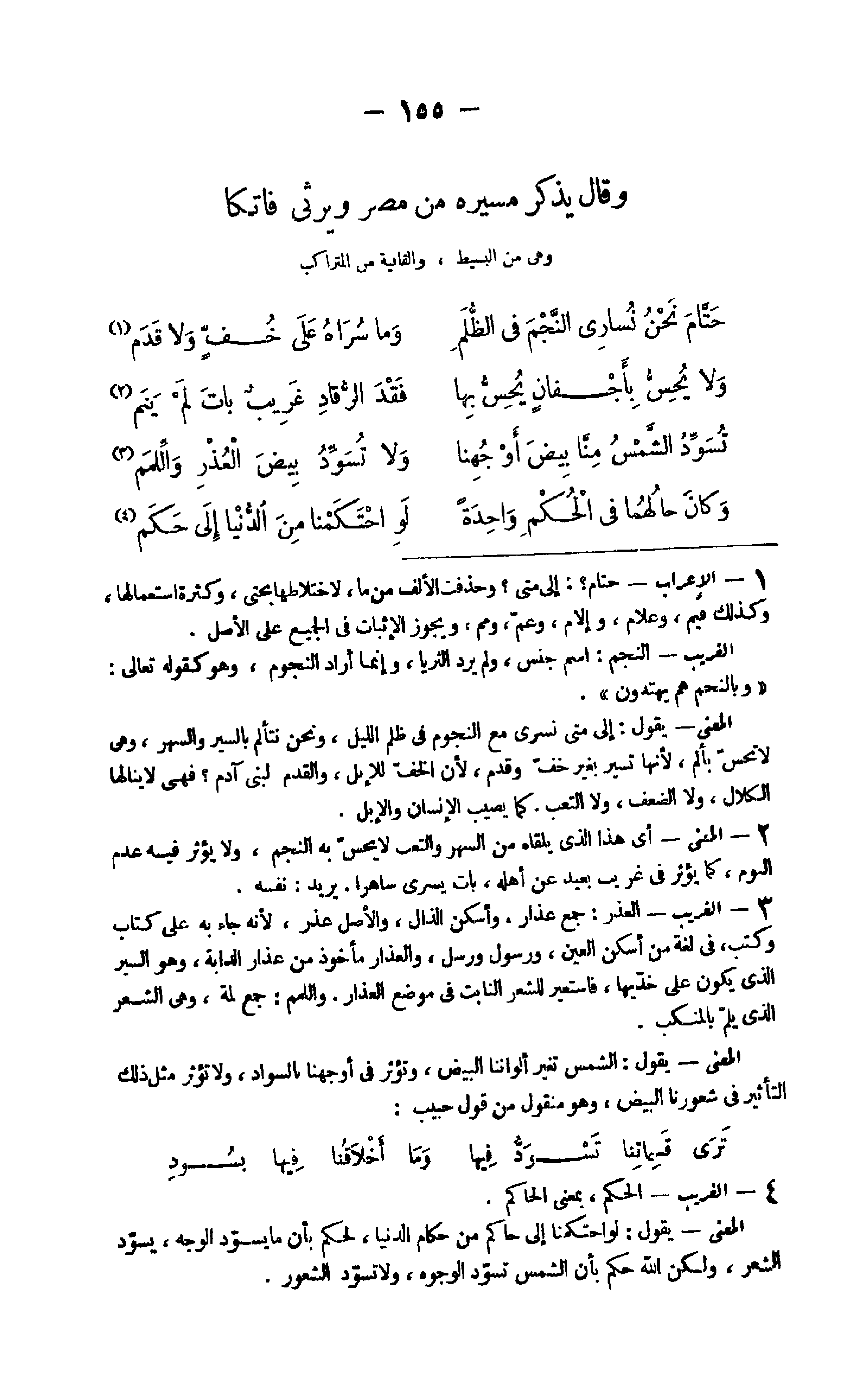 - 1 الْإِعْرَاب حتام إِلَى مَتى وحذفت الْألف من مَا لاختلاطها بحتى وَكَثْرَة اسْتِعْمَالهَا وَكَذَلِكَ فيمَ وعلام وإلام وَعم ومم وَيجوز الْإِثْبَات فِي الْجَمِيع على الأَصْل الْغَرِيب النَّجْم اسْم جنس وَلم يرد الثريا وَإِنَّمَا أَرَادَ النُّجُوم وَهُوَ كَقَوْلِه تَعَالَى {وبالنجم هم يَهْتَدُونَ} الْمَعْنى يَقُول إِلَى مَتى نسري مَعَ النُّجُوم فِي ظلم اللَّيْل وَنحن نتألم بالسير والسهر وَهِي لَا تحس بألم لِأَنَّهَا تسير بِغَيْر خف وَقدم لِأَن الْخُف لِلْإِبِلِ والقدم لبني آدم فَهِيَ لَا ينالها الكلال وَلَا الضعْف وَلَا التَّعَب كَمَا يُصِيب الْإِنْسَان وَالْإِبِل