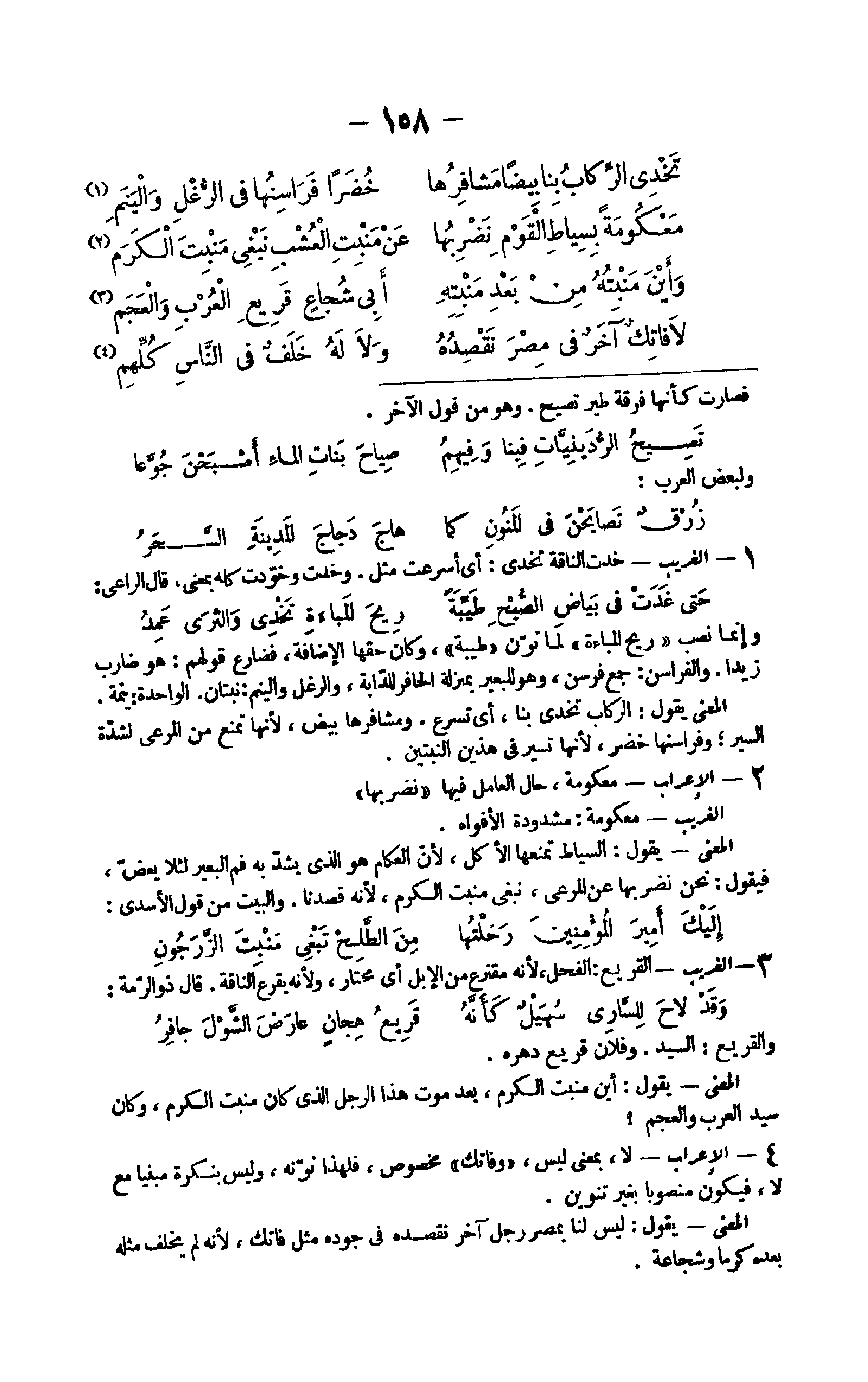 وَإِنَّمَا نصب ريح المباءة لما نون طيبَة وَكَانَ حَقّهَا الْإِضَافَة فضارع قَوْلهم هُوَ ضَارب زيدا والفراسن جمع فرسن وَهُوَ للبعير بِمَنْزِلَة الْحَافِر للدابة والرغل والينم نبتان الْوَاحِدَة ينمة الْمَعْنى يَقُول الركاب تخدى بِنَا أَي تسرع ومشافرها بيض لِأَنَّهَا تمنع من المعرى لشدَّة السّير وفراسنها خضر لِأَنَّهَا تسير فِي هذَيْن النبتين