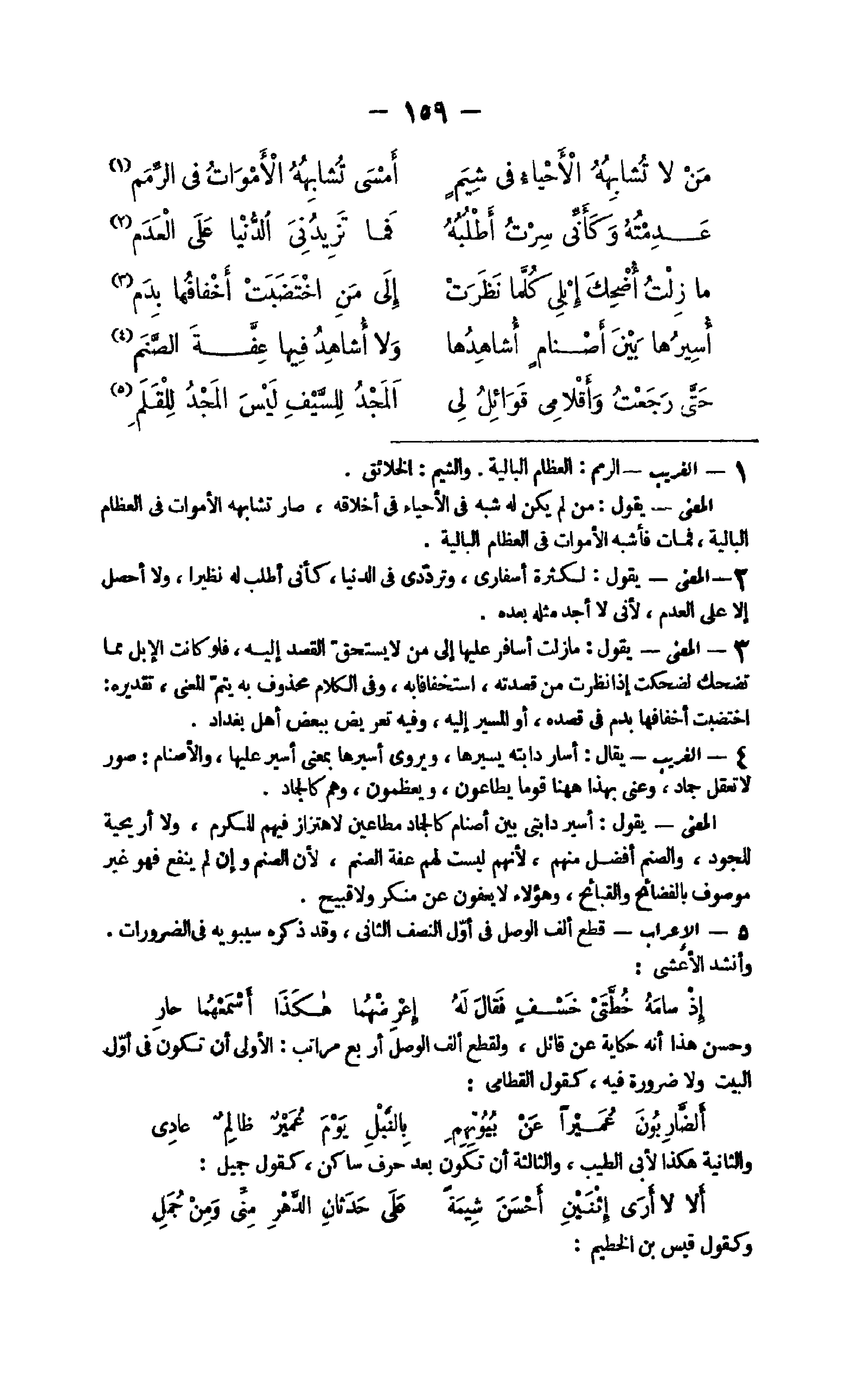 19 - الْغَرِيب الرمم الْعِظَام البالية والشيم الْخَلَائق الْمَعْنى يَقُول من لم يكن لَهُ شبه فِي الْأَحْيَاء فِي أخلاقه صَار تشابهه الْأَمْوَات فِي الْعِظَام البالية فَمَاتَ فَأشبه الْأَمْوَات فِي الْعِظَام البالية
