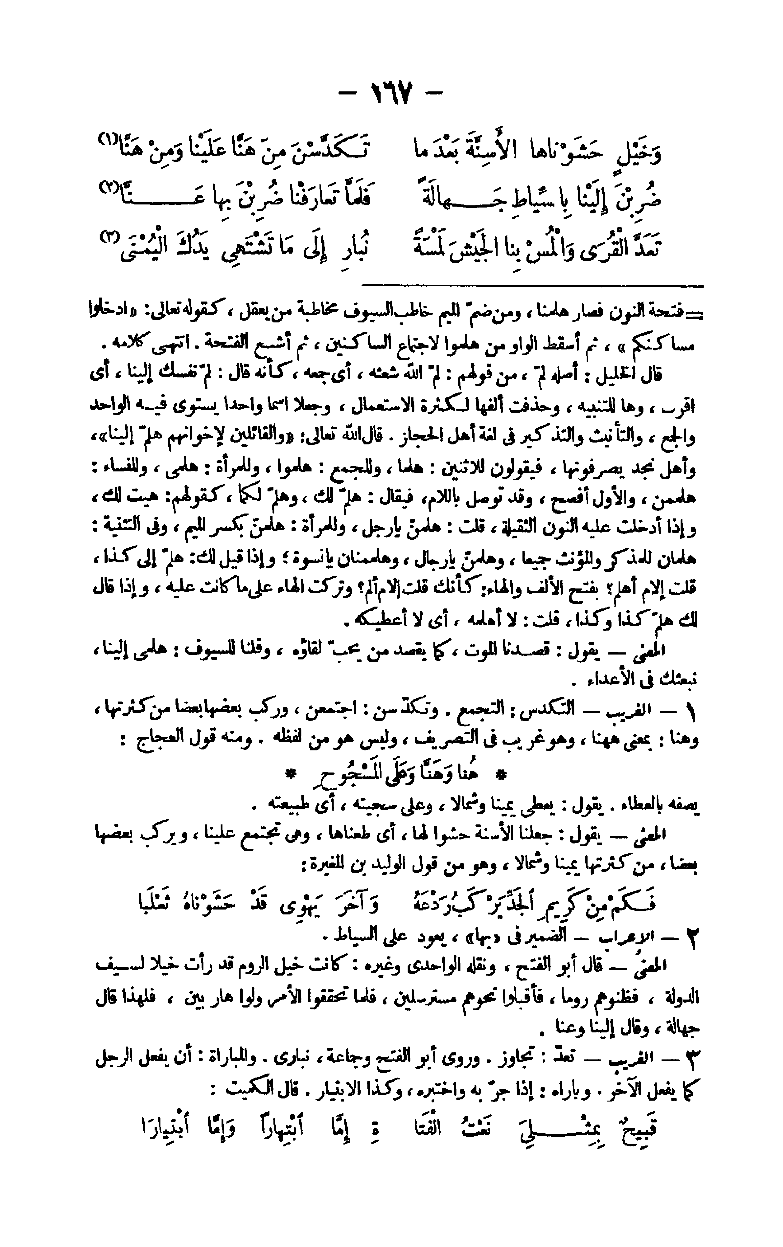 ثمَّ أشْبع فَتْحة النُّون فَصَارَ هلمنا وَمن ضم الْمِيم خَاطب السيوف مُخَاطبَة من يعقل كَقَوْلِه تَعَالَى {ادخُلُوا مَسَاكِنكُمْ} ثمَّ أسقط الْوَاو من هلموا لِاجْتِمَاع الساكنين ثمَّ اشبع الفتحة انْتهى كَلَامه قَالَ الْخَلِيل أَصله لم من قَوْلهم لم الله شعثه أَي جمعه كَأَنَّهُ قَالَ لم نَفسك إِلَيْنَا أَي أقرب وَهَا للتّنْبِيه وحذفت ألفها لِكَثْرَة الِاسْتِعْمَال وَجعلا اسْما وَاحِدًا يَسْتَوِي فِيهِ الْوَاحِد وَالْجمع والتأنيث والتذكير فِي لُغَة أهل الْحجاز قَالَ الله تَعَالَى {والقائلين لإخوانهم هَلُمَّ إِلَيْنَا} وَأهل نجد يصرفونها يَقُولُونَ للاثنين هلما وللجمع هلموا وللمرأة هَلُمِّي وللنساء هلممن وَالْأول أفْصح وَقد توصل بِاللَّامِ فَيُقَال هَلُمَّ لَك وهلم لَكمَا كَقَوْلِهِم هيت لَك وَإِذا أدخلت عَلَيْهِ النُّون الثَّقِيلَة قلت هلمن يَا رجل وللمرأة هلمن بِكَسْر الْمِيم وَفِي التَّثْنِيَة هلمان للمذكر والمؤنث جَمِيعًا وهلمن يَا رجال وهلممنان يَا نسْوَة وَإِذا قيل لَك هَلُمَّ إِلَى كَذَا قلت إلام أهلم بِفَتْح الْألف وَالْهَاء كَأَنَّك قلت إلام ألم وَتركت الْهَاء على مَا كَانَت عَلَيْهِ وَإِذا قَالَ لَك هَلُمَّ كَذَا وَكَذَا قلت لَا أهلمه أَي لَا أعطيكه الْمَعْنى يَقُول قصدنا الْمَوْت كَمَا يقْصد من يحب لقاؤه وَقُلْنَا للسيوف هَلُمِّي إِلَيْنَا نبعثك فِي الْأَعْدَاء